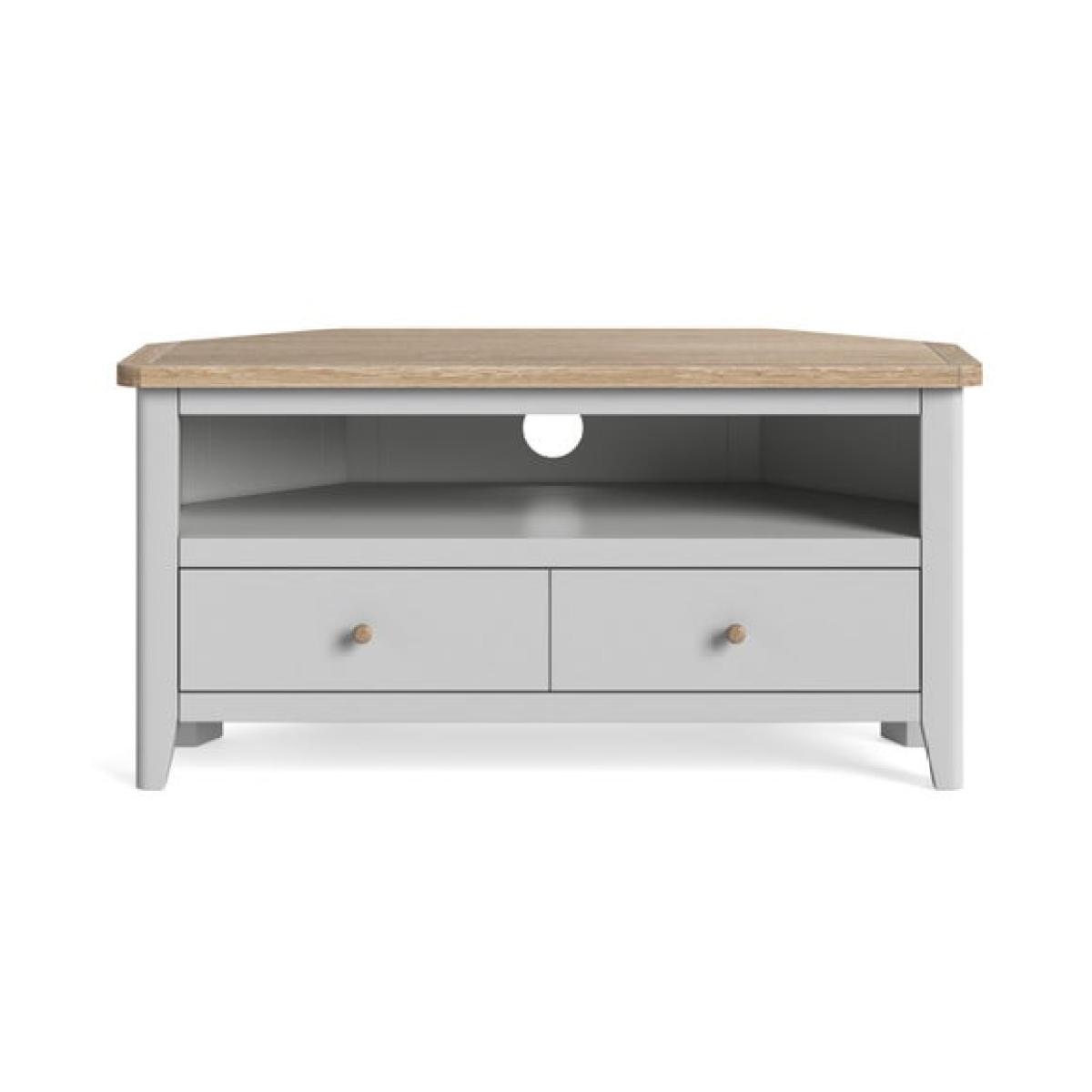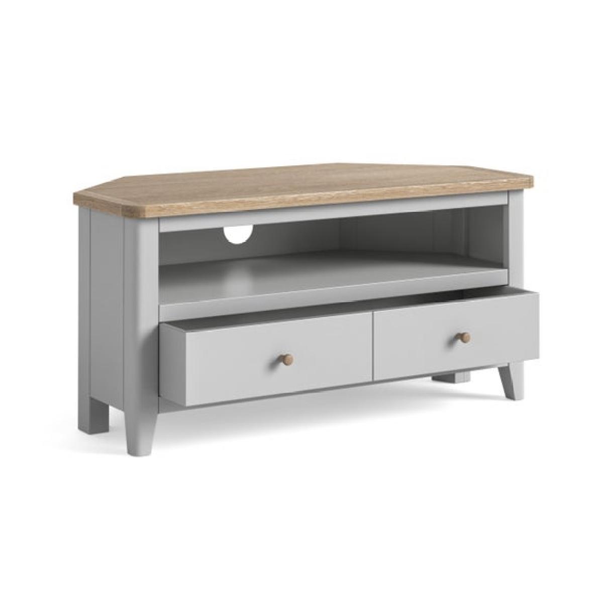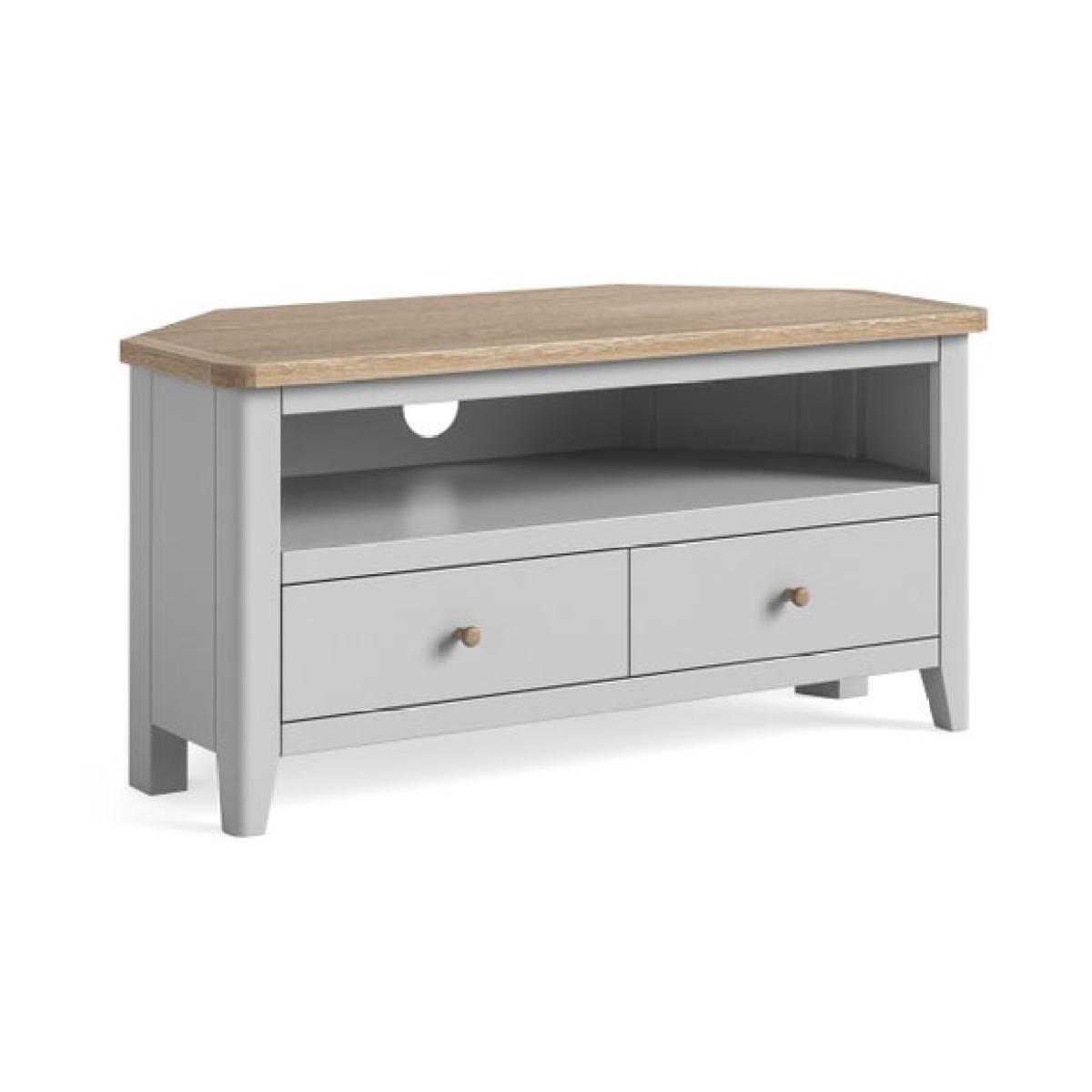Dunelm Exclusive - Designed and Developed by Dunelm * Oak and Pine frame * Painted finish * Wooden or Metal handles included * Cable management The Bromley corner tv unit is a smart, space-saving upgrade to the original design, available in grey and oak finishes. Crafted to fit neatly into corners, it offers ample storage and display space for your media setup. Fully assembled and complete with both handle styles, it’s a stylish solution for compact or uniquely shaped rooms.