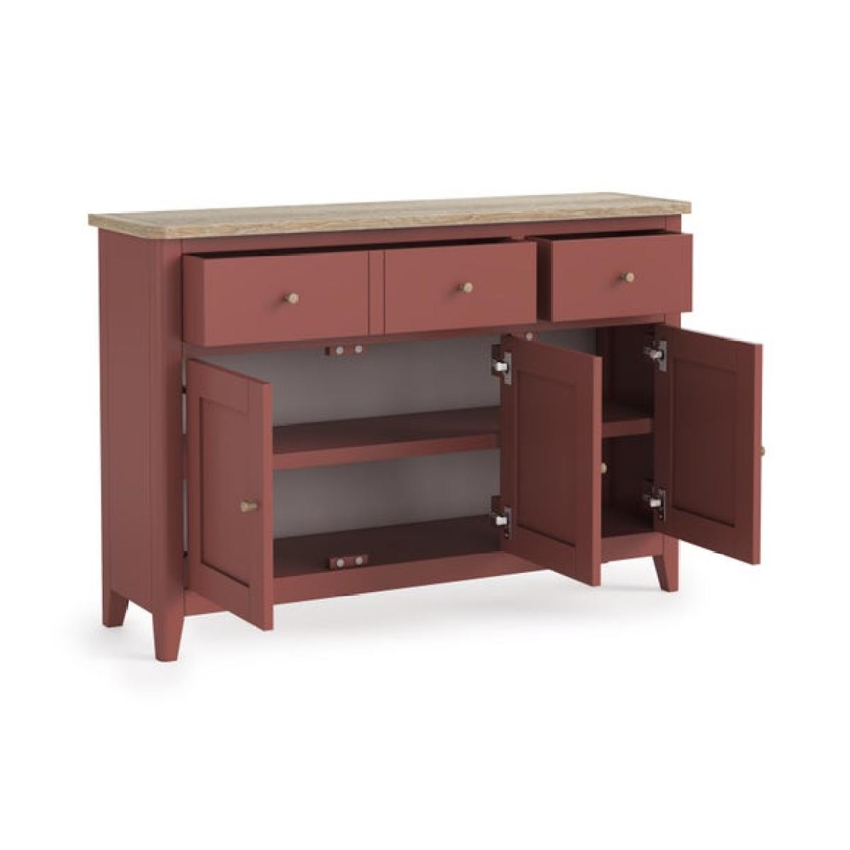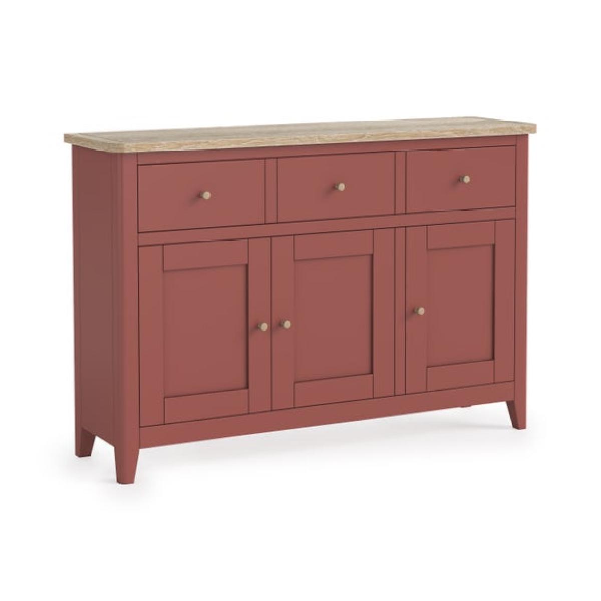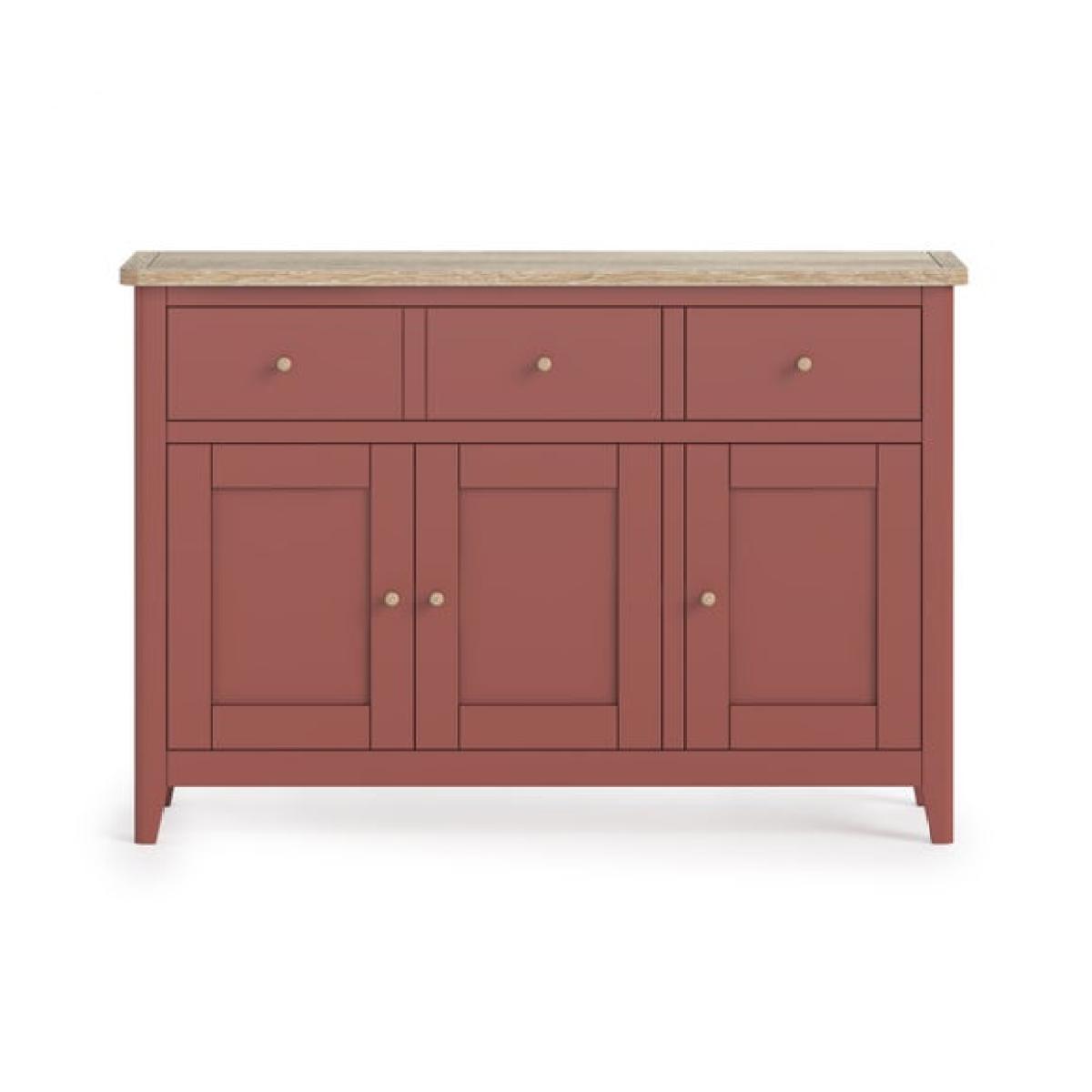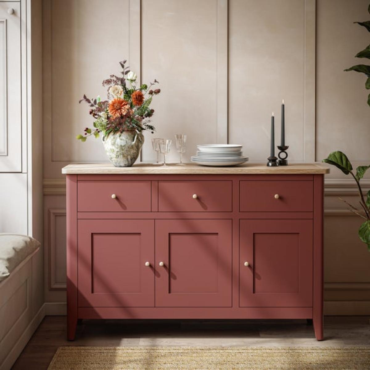 Dunelm Exclusive - Designed and Developed by Dunelm * New and Improved * Oak and Pine frame * Painted finish * Wooden or Metal handles available This upgraded version of our much-loved Bromley sideboard blends timeless country charm with clever functionality, perfect for both cosy cottages and compact modern homes. Crafted from solid pine and oak veneer, it features our signature soft painted finish, paired with a beautifully contrasting waxed oak top for a warm, rustic feel. Designed to maximise storage space, this fully assembled sideboard features one wide drawer and a small drawer. This sideboard is crafted with one wide cupboard, complete with three doors and a fixed shelf inside for convenience.**Item fully assembled. **