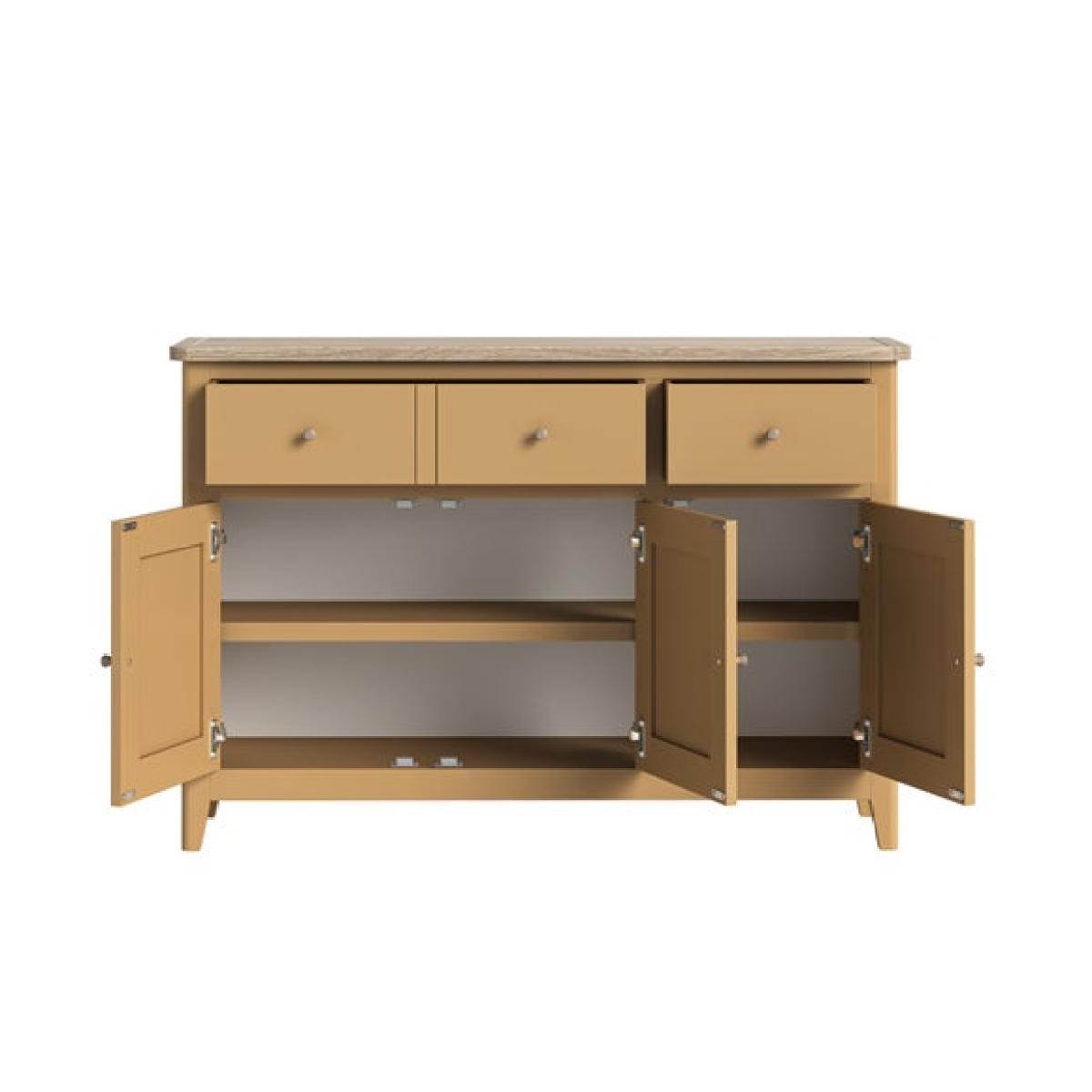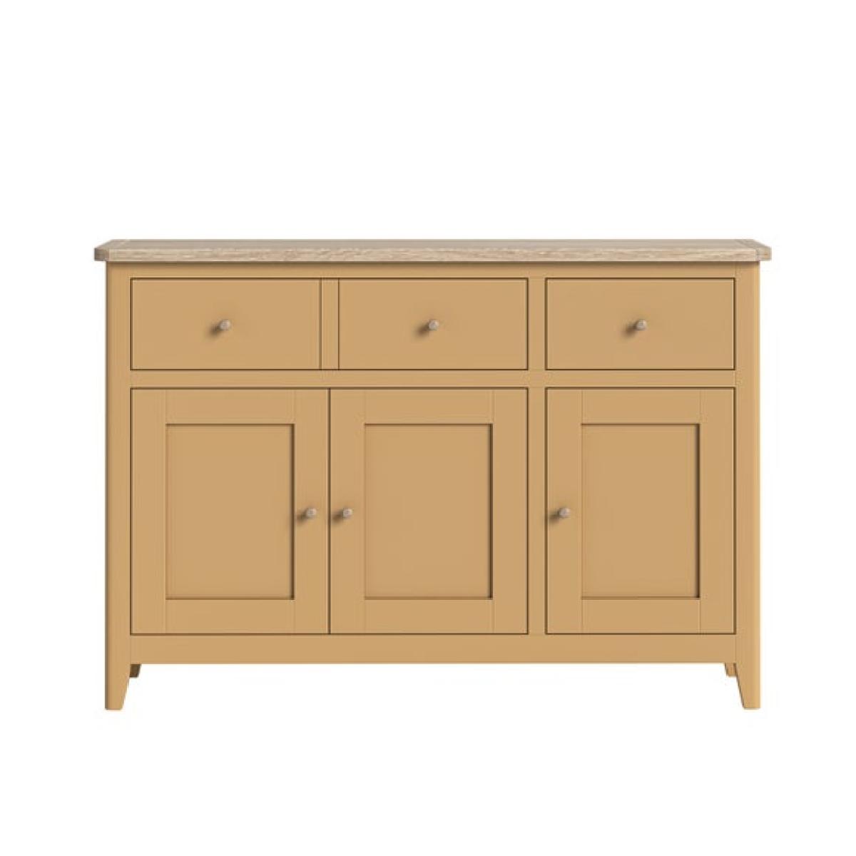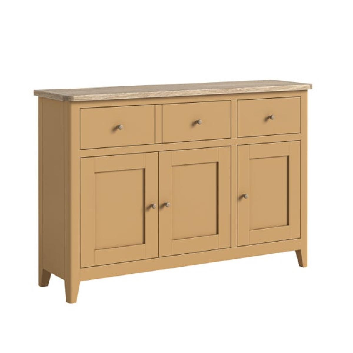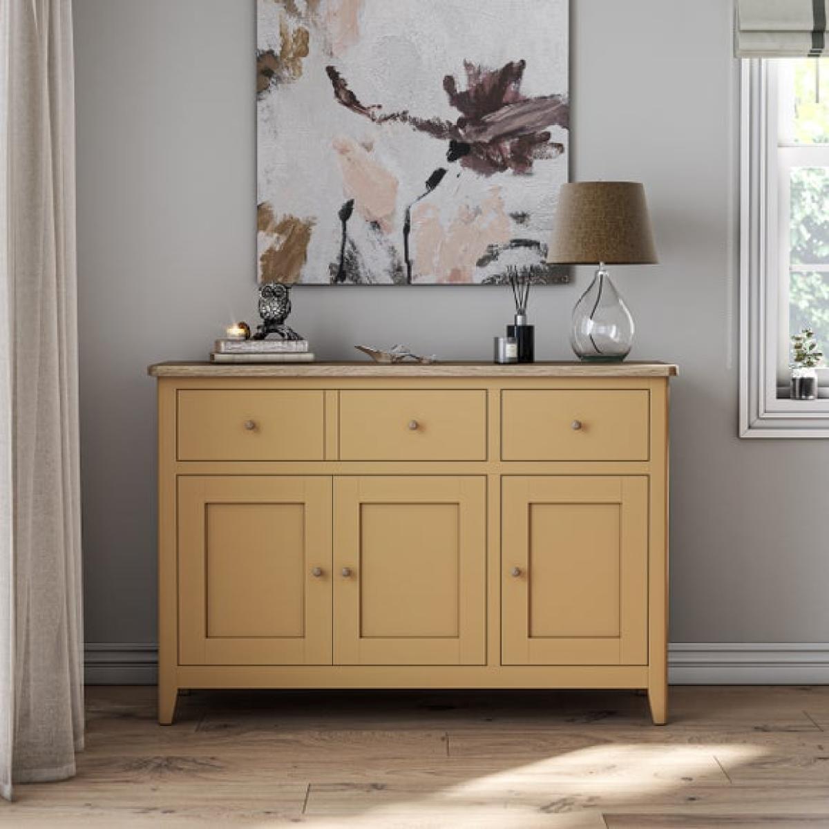 Dunelm Exclusive - Designed and Developed by Dunelm * New and Improved * Oak and Pine frame * Painted finish * Wooden or Metal handles available This upgraded version of our much-loved Bromley sideboard blends timeless country charm with clever functionality, perfect for both cosy cottages and compact modern homes. Crafted from solid pine and oak veneer, it features our signature soft painted finish, paired with a beautifully contrasting waxed oak top for a warm, rustic feel. Designed to maximise storage space, this fully assembled sideboard features one wide drawer and a small drawer. This sideboard is crafted with one wide cupboard, complete with three doors and a fixed shelf inside for convenience.**Item fully assembled. **