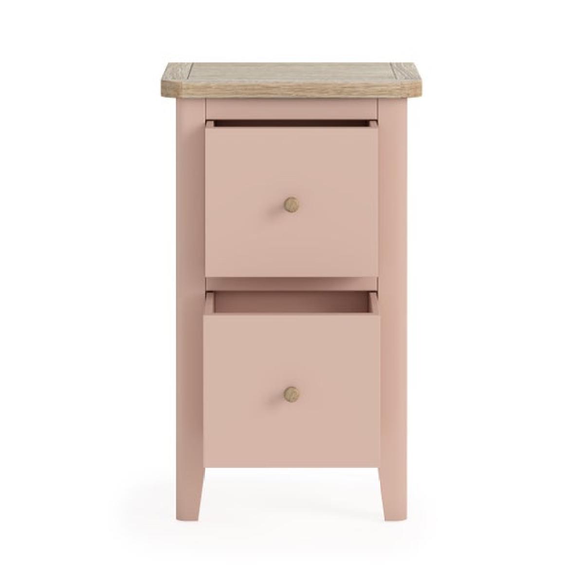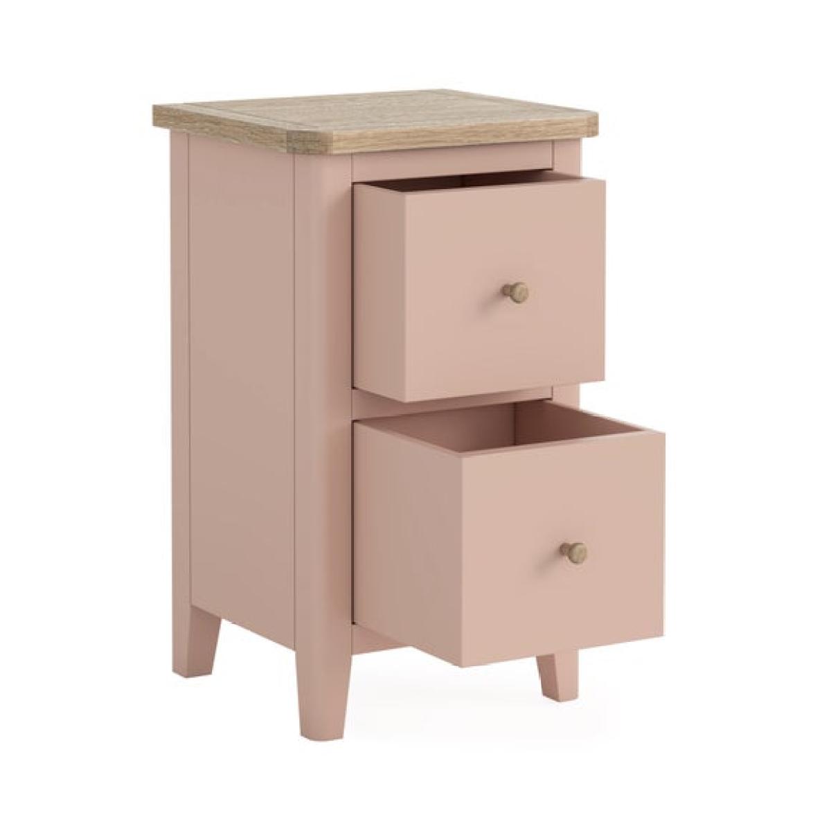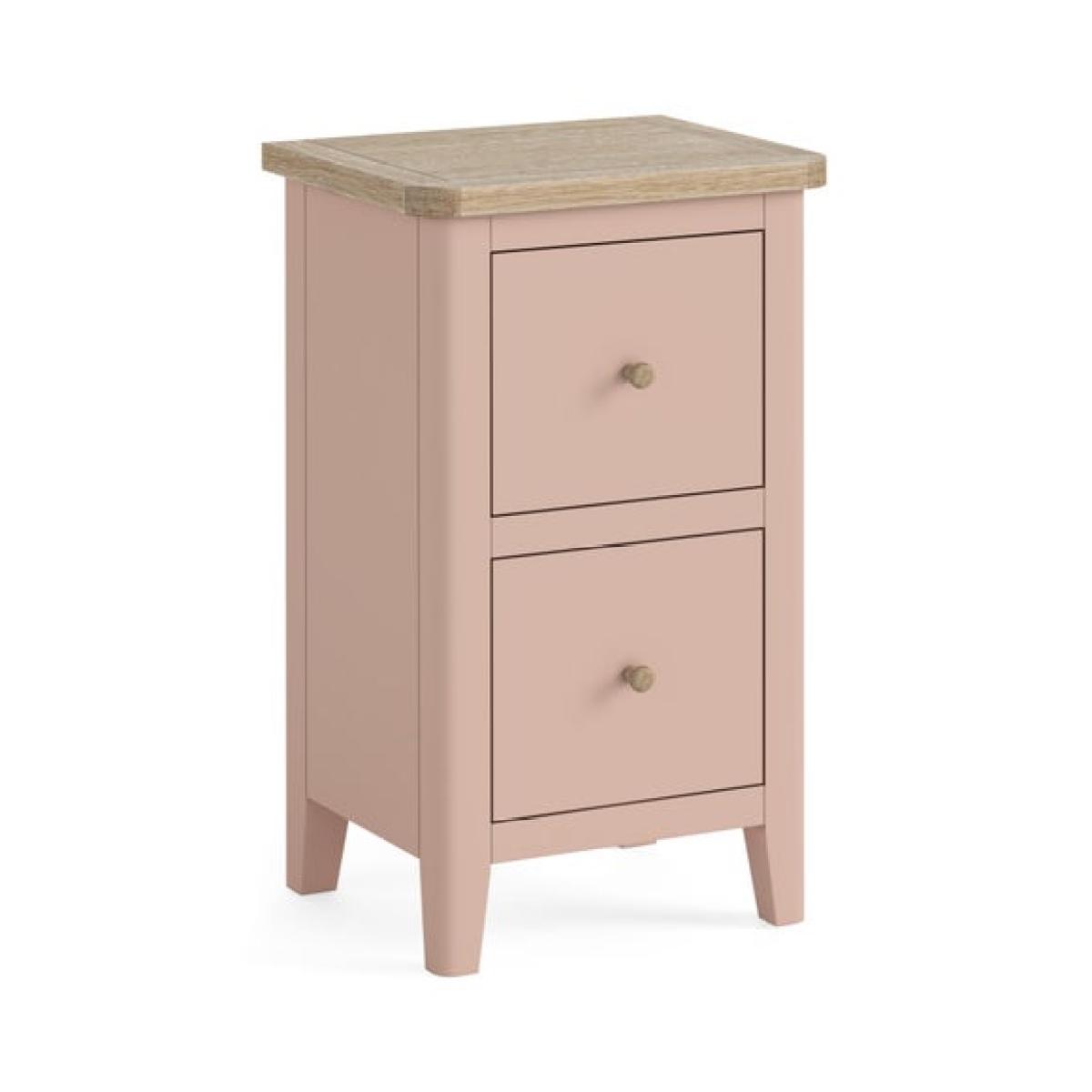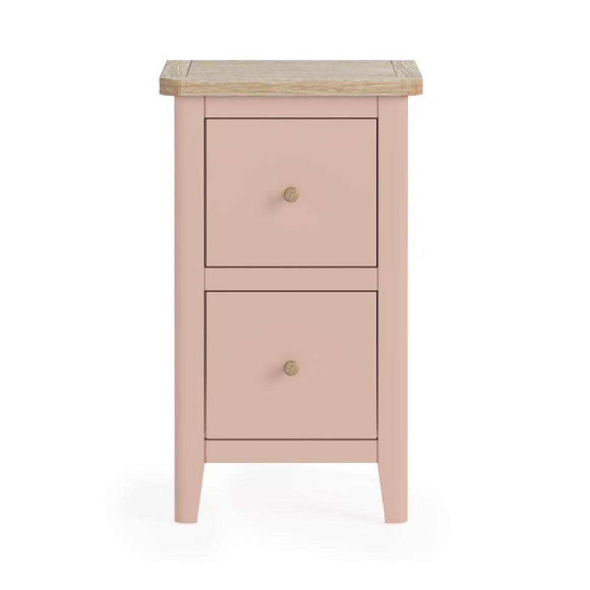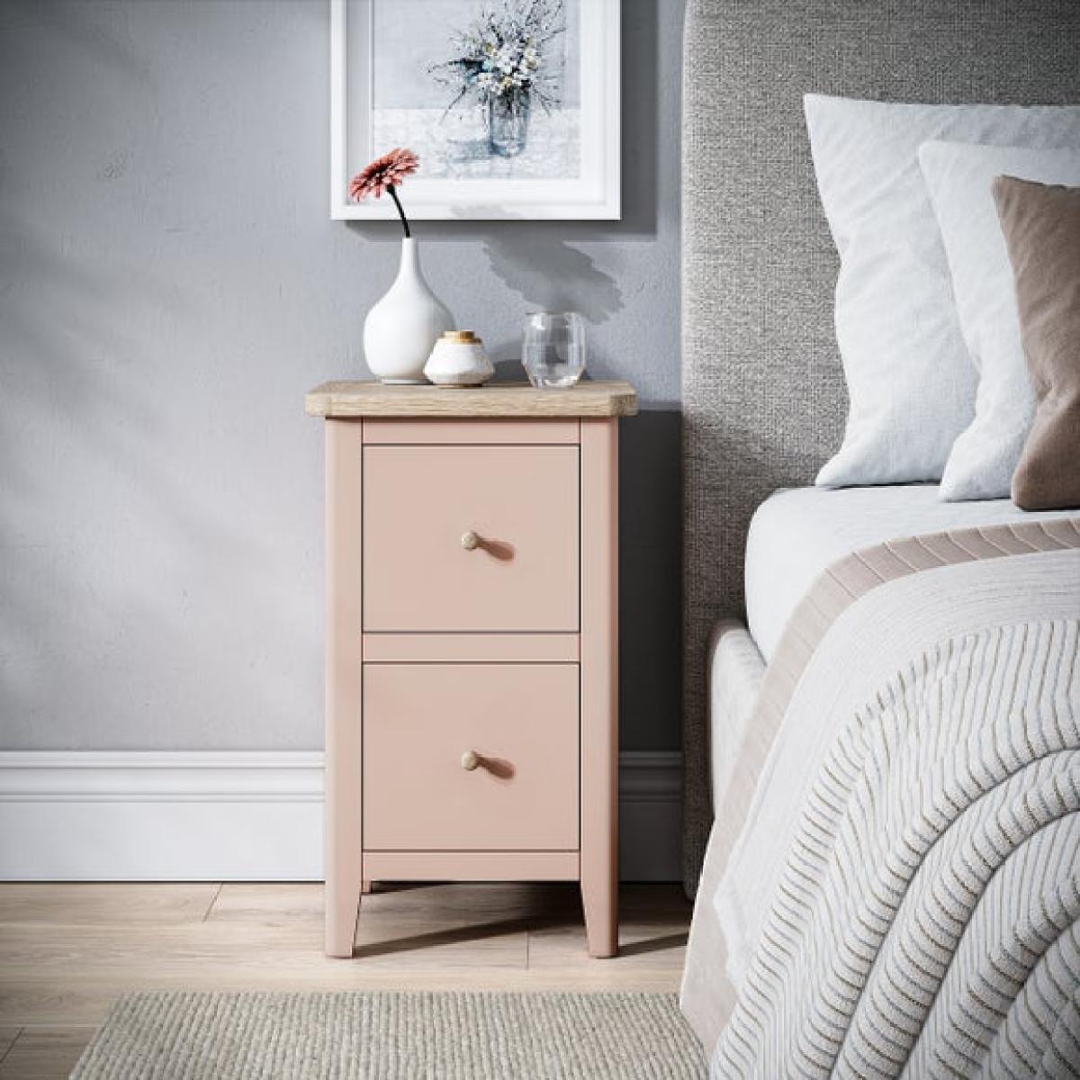* Updated and improved Design of a Dunelm classic * Solid pine and oak veneer * Wooden and metal handles included * Painted and wax finish * No assembly required Part of the newly updated Bromley range, this slim bedside table is thoughtfully designed to bring refined style and smart functionality to compact spaces. Its slender profile makes it ideal for smaller bedrooms or tight corners, while the blend of modern lines and traditional country charm gives it timeless appeal. The updated finish adds a fresh, contemporary twist to the classic design, making it easy to integrate into a variety of interiors. For added versatility, it comes with both wooden and metal handles, allowing you to customise the look to suit your personal style.