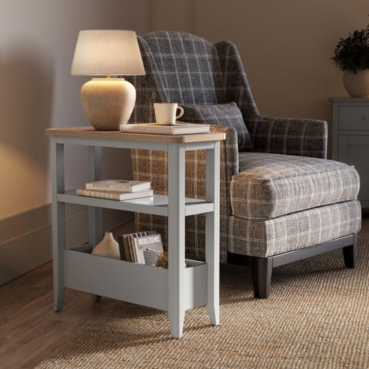 Dunelm Exclusive - Designed and Developed by Dunelm* Oak and Pine frame* Painted finish A compact yet elevated addition to the Bromley range, this side table is designed for convenience and style. Offered in grey and oak finishes, this upgraded piece fits effortlessly beside sofas or chairs, providing a handy surface for drinks, books, or lighting.