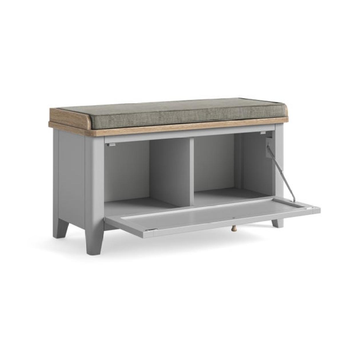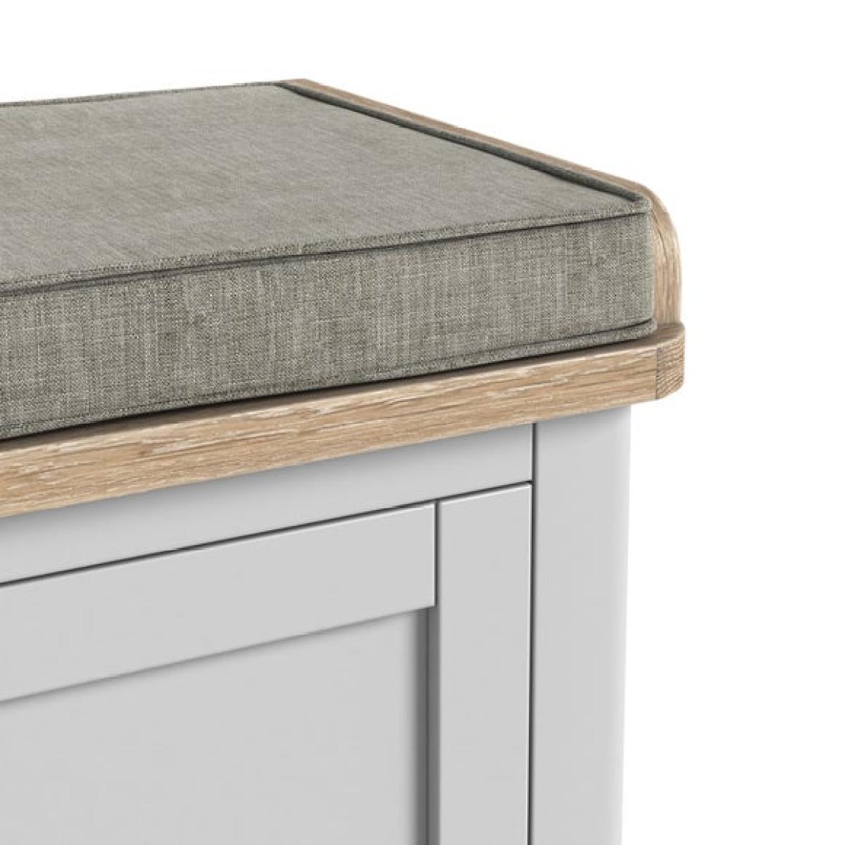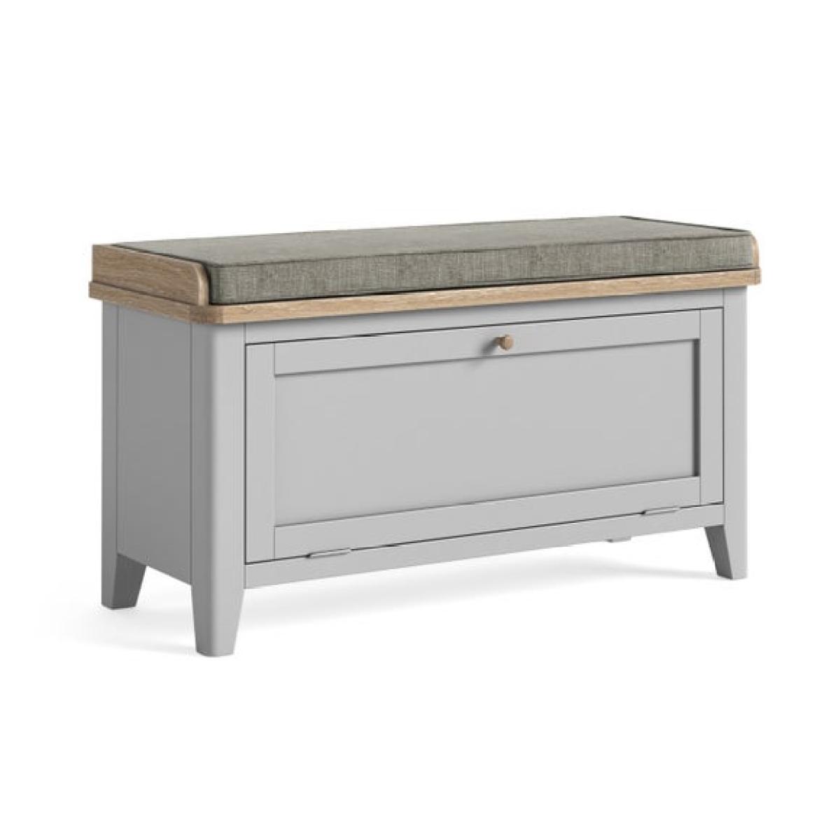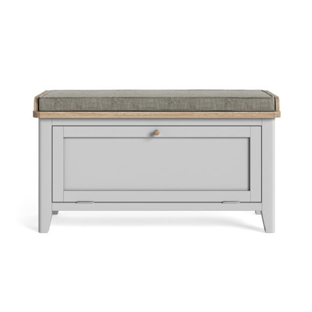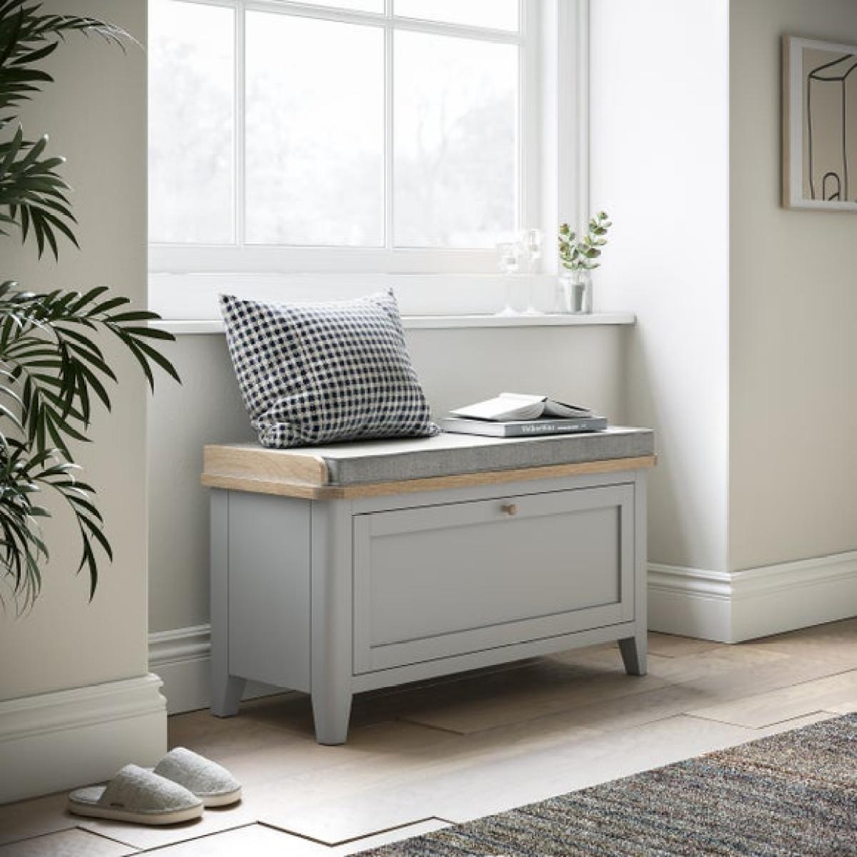 Dunelm Exclusive - Designed and Developed by Dunelm * Oak and Pine frame * Painted finish * Wooden or Metal handles included * Cushion included An elevated multifunctional piece, the Bromley II storage bench combines seating and storage in one elegant design. Featuring a cushioned top and spacious interior, it’s ideal for entryways, bedrooms, or living areas. With no assembly required and both handle styles included, it’s a stylish and convenient solution for everyday living.