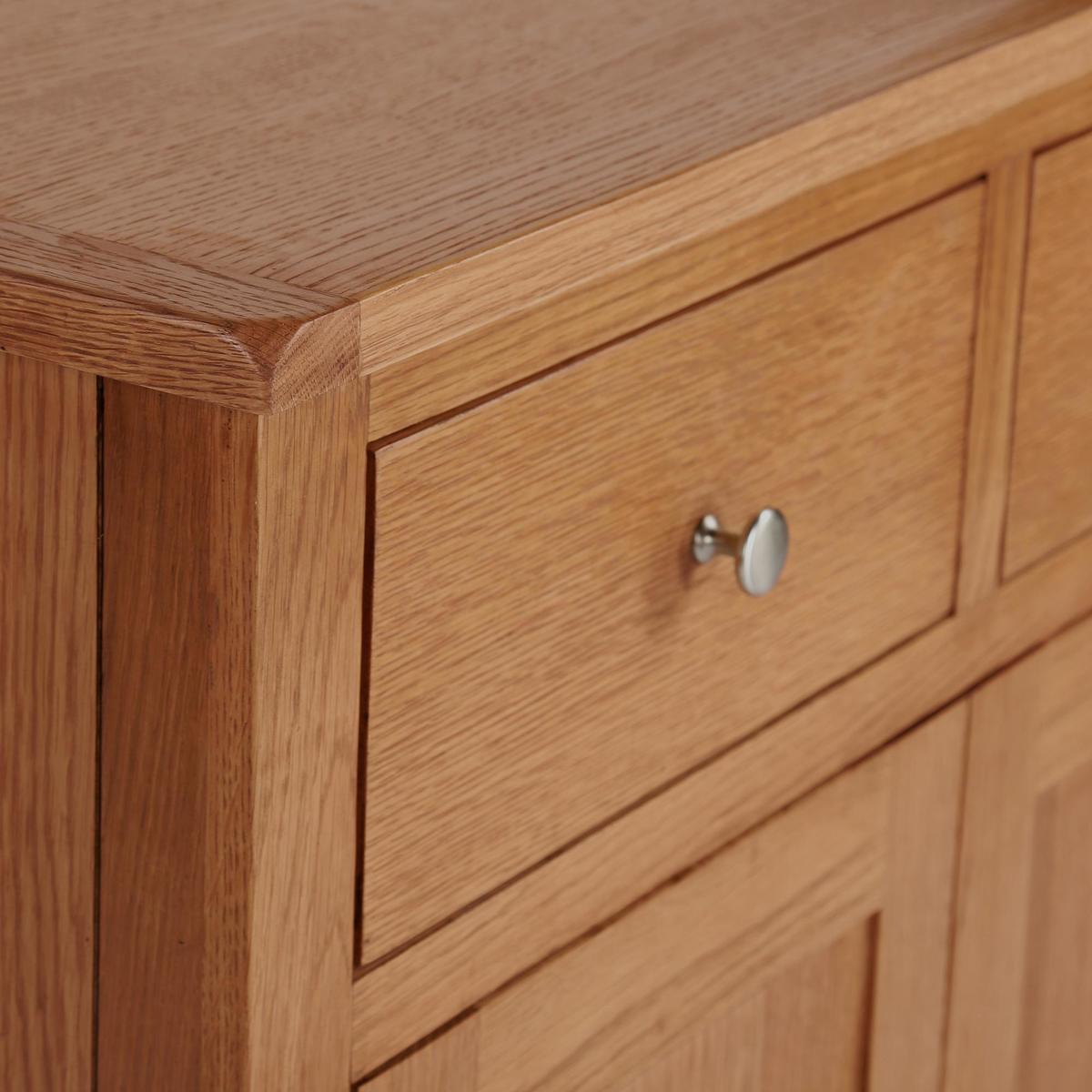 Dunelm Exclusive – Designed and Developed by Dunelm The Bromley range is ideal for adding a country classic touch to your home, whilst having the advantage and flexibility of furnishing the most compact of living spaces. Constructed from a solid wood and oak veneer, each piece features a natural colourway with a contrasting wax finish. Supplied with smooth sliding drawers, this range comes complete with beautiful silver finished metal handles, perfect for a range of rooms in the home. Perfect for maximising storage space, the Bromley oak Small Sideboard features two spacious cupboards with a beautiful finish to match any interiors.