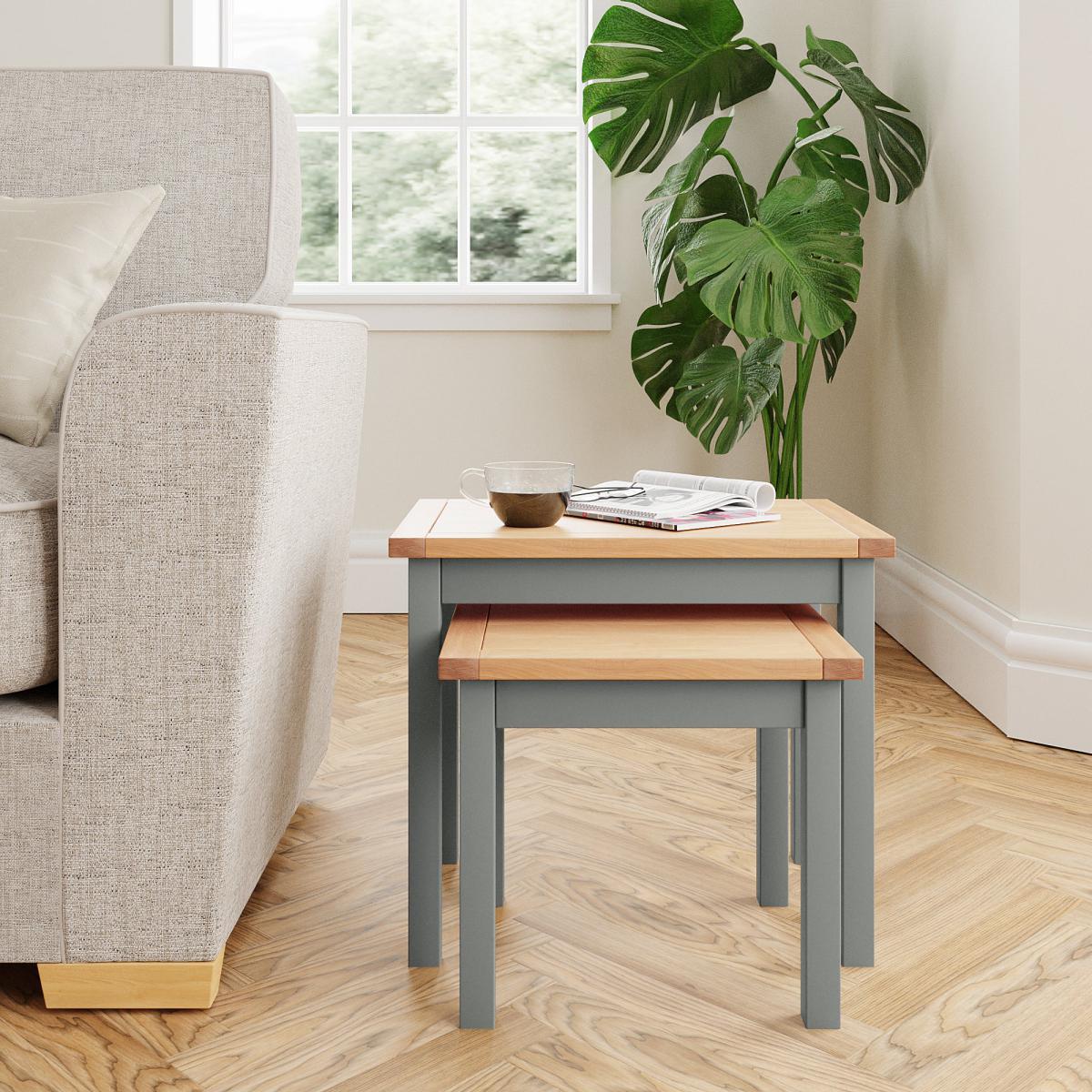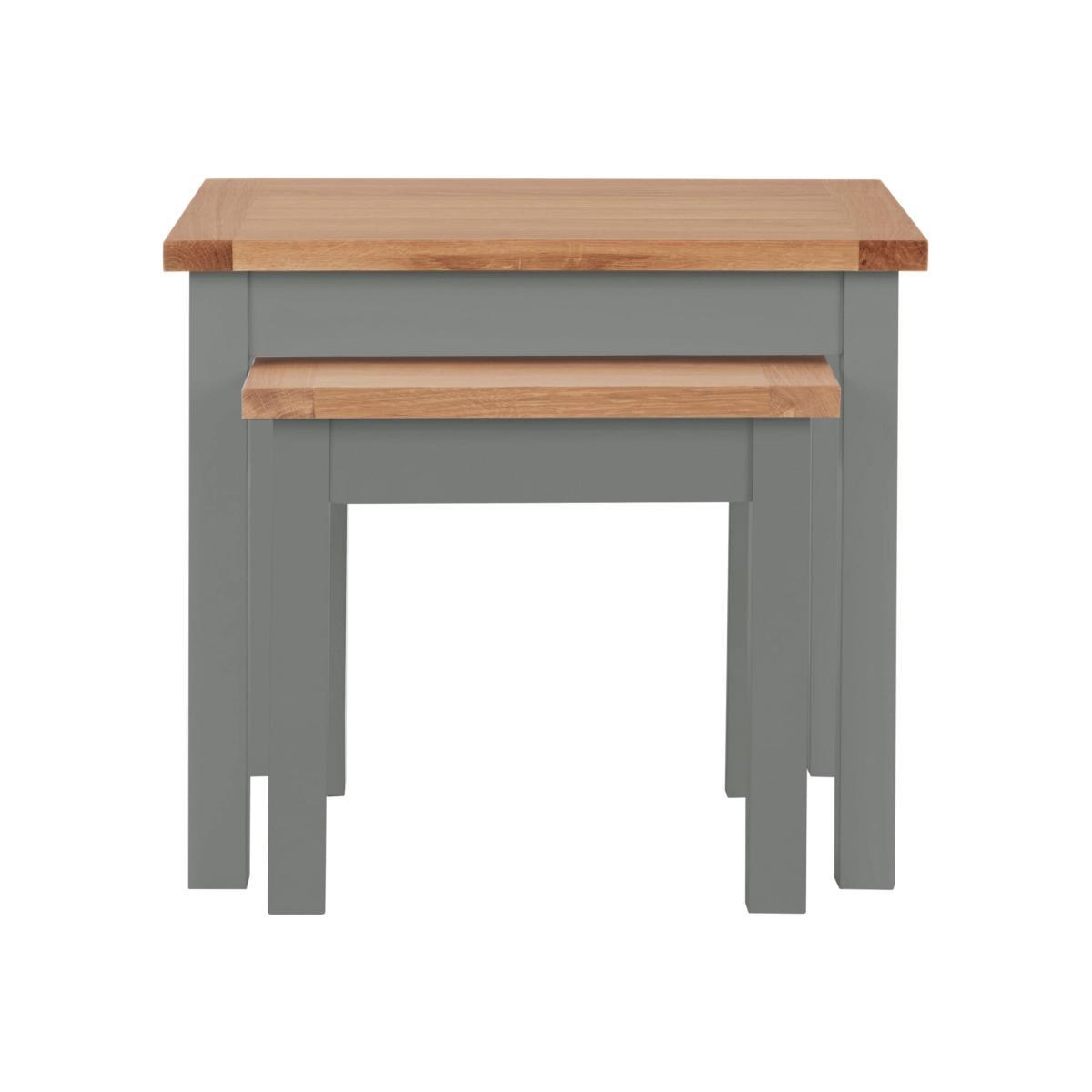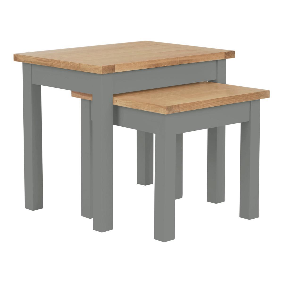 Dunelm Exclusive - Designed and Developed by Dunelm. The Bromley range is ideal for adding a country classic touch to your home, whilst having the advantage and flexibility of furnishing the most compact of living spaces. Constructed from a solid pine and oak veneer, each piece features slate paint with a contrasting waxed oak finish. Supplied with smooth sliding drawers, this range comes complete with beautiful silver coloured metal handles, perfect for a range of rooms in the home. Designed to maximise storage space, this partly assembled nest of tables features a minimalistic finish and comes complete with two assorted size tables that fit together neatly for convenience.