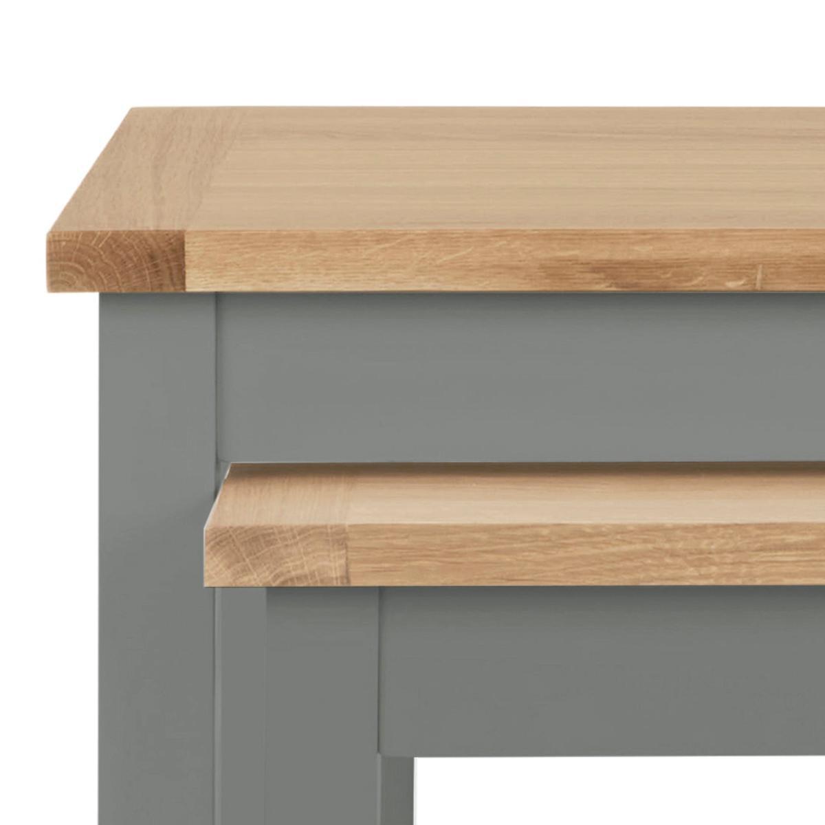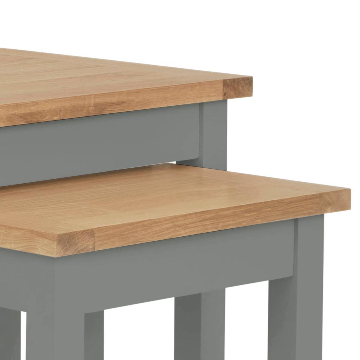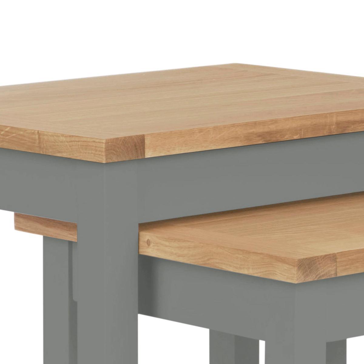 Dunelm Exclusive - Designed and Developed by Dunelm. The Bromley range is ideal for adding a country classic touch to your home, whilst having the advantage and flexibility of furnishing the most compact of living spaces. Constructed from a solid pine and oak veneer, each piece features slate paint with a contrasting waxed oak finish. Supplied with smooth sliding drawers, this range comes complete with beautiful silver coloured metal handles, perfect for a range of rooms in the home. Designed to maximise storage space, this partly assembled nest of tables features a minimalistic finish and comes complete with two assorted size tables that fit together neatly for convenience.