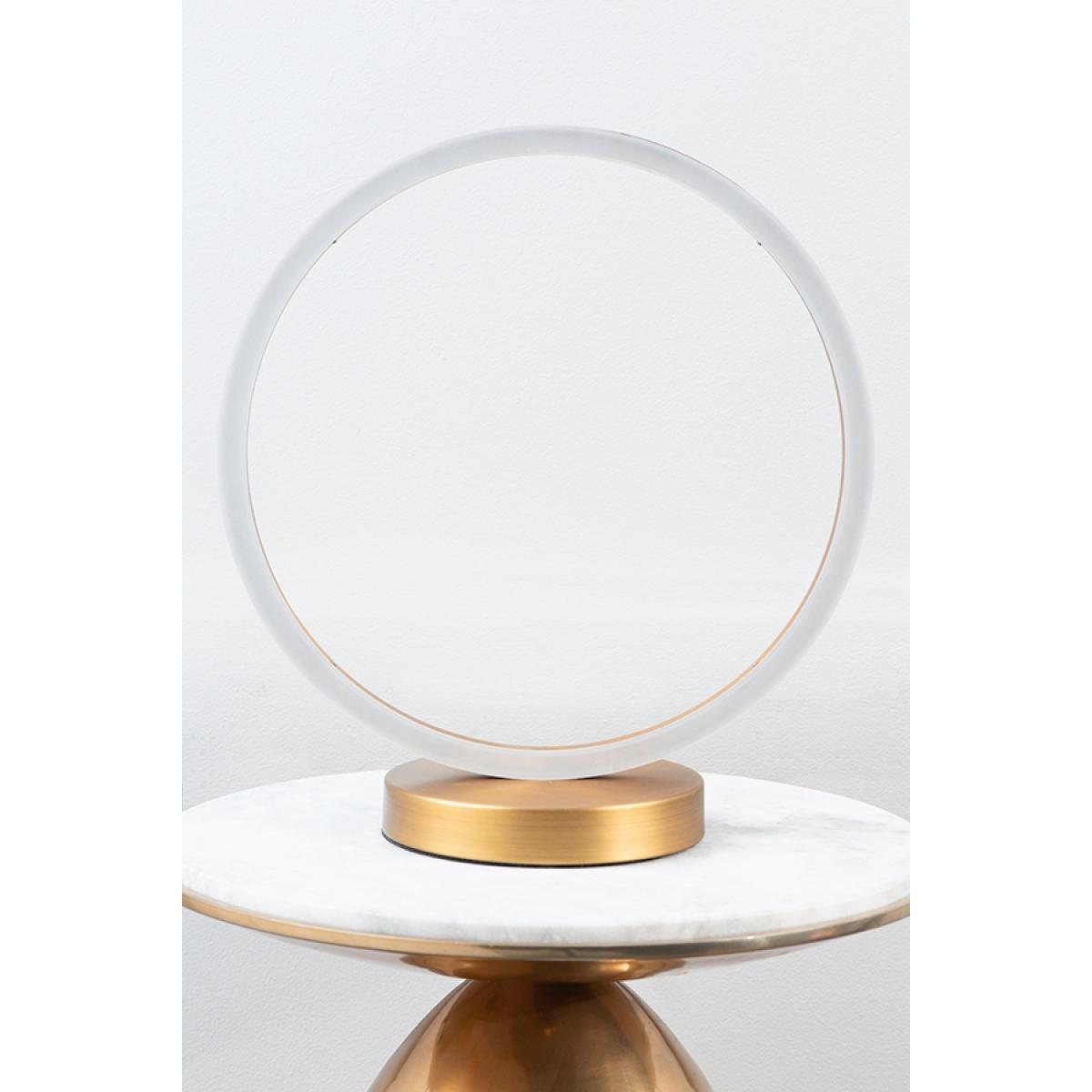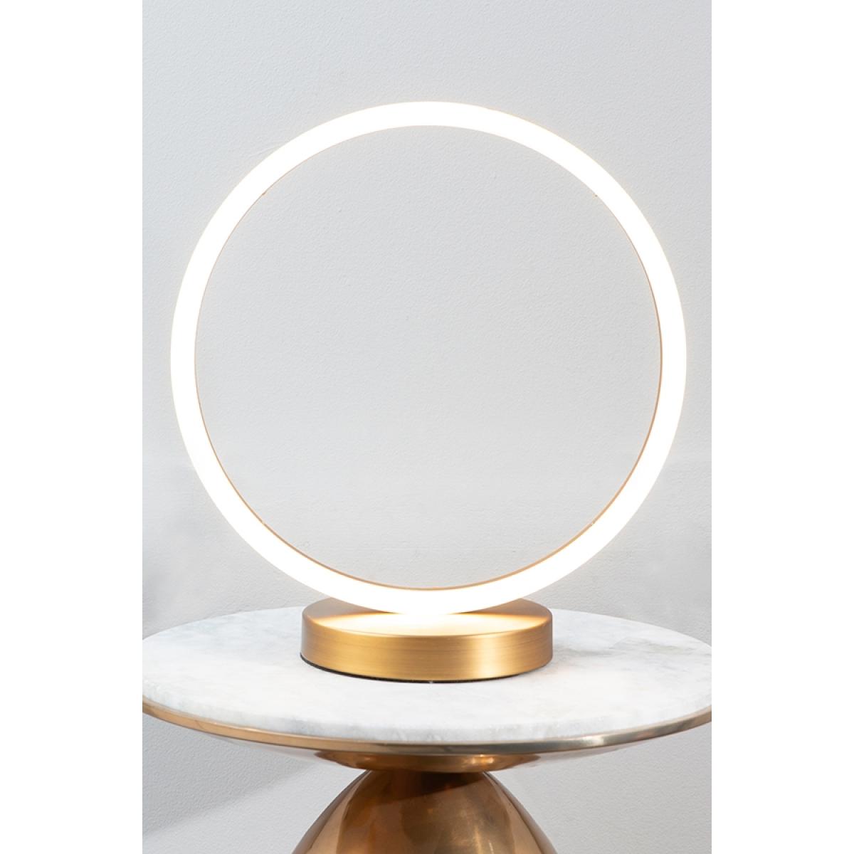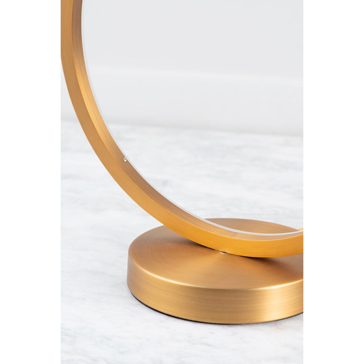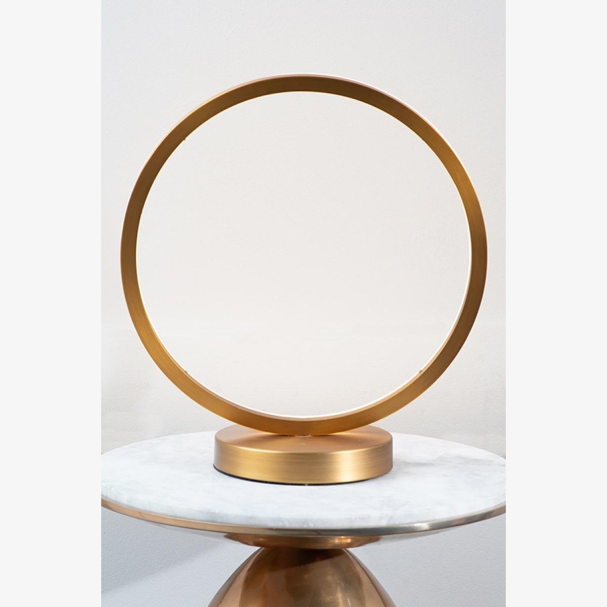 Contemporary table light with a graphic hoop silhouette. Steel with brushed brass finish. Low energy LED light strip and driver concealed inside the structure. Frosted acrylic diffuser creates a practical yet ambient lighting mood. Gold colour braided fabric cable.