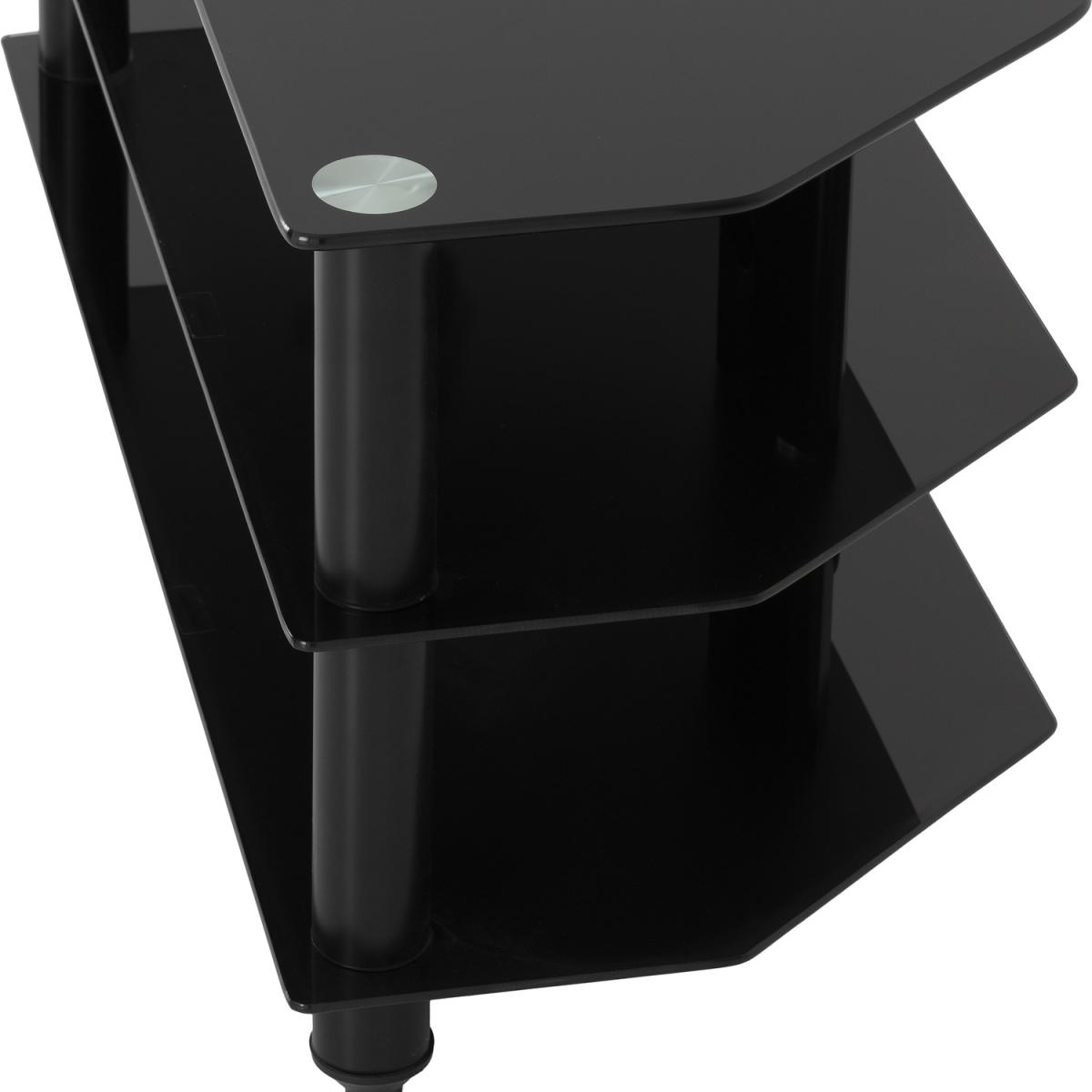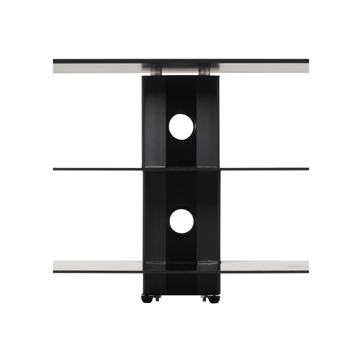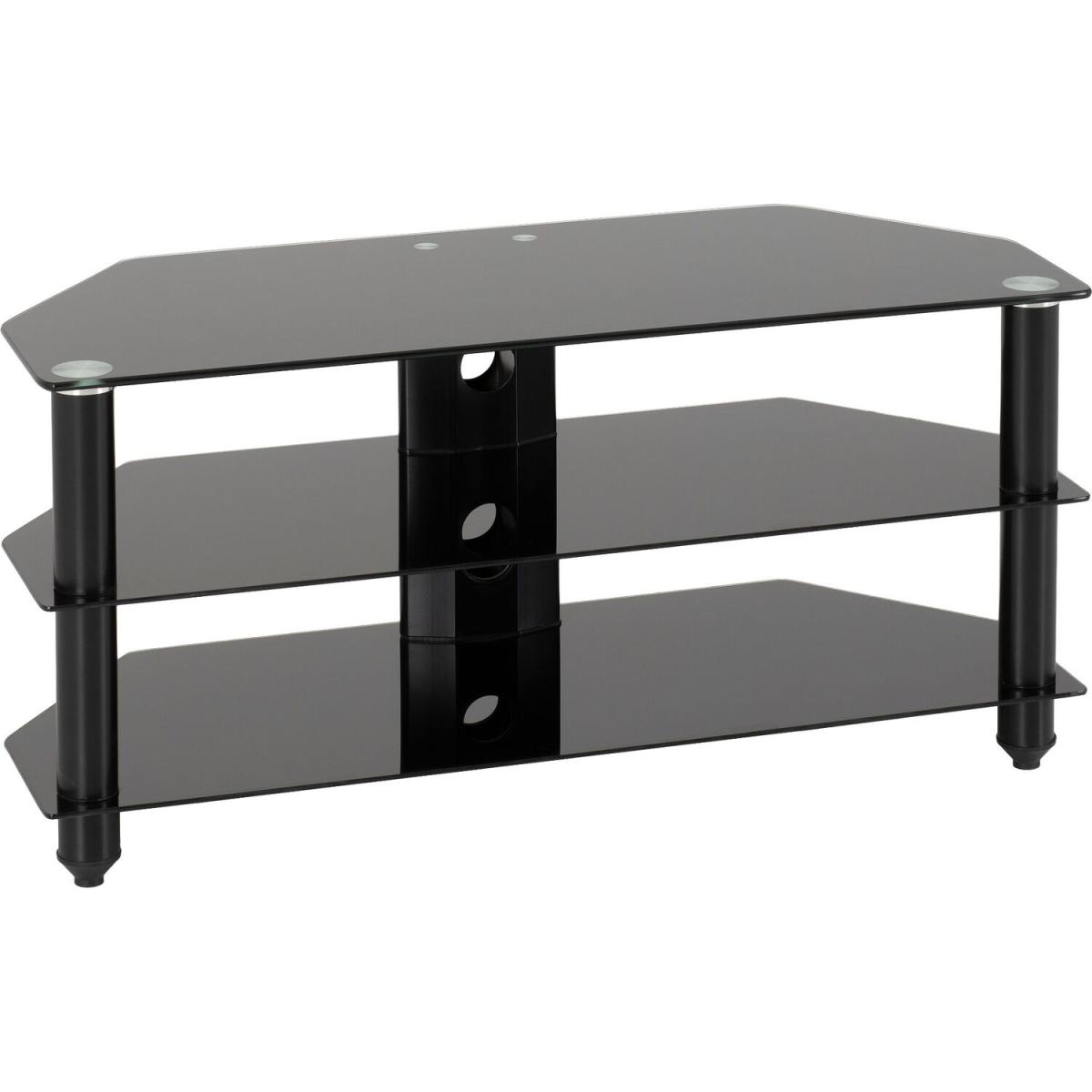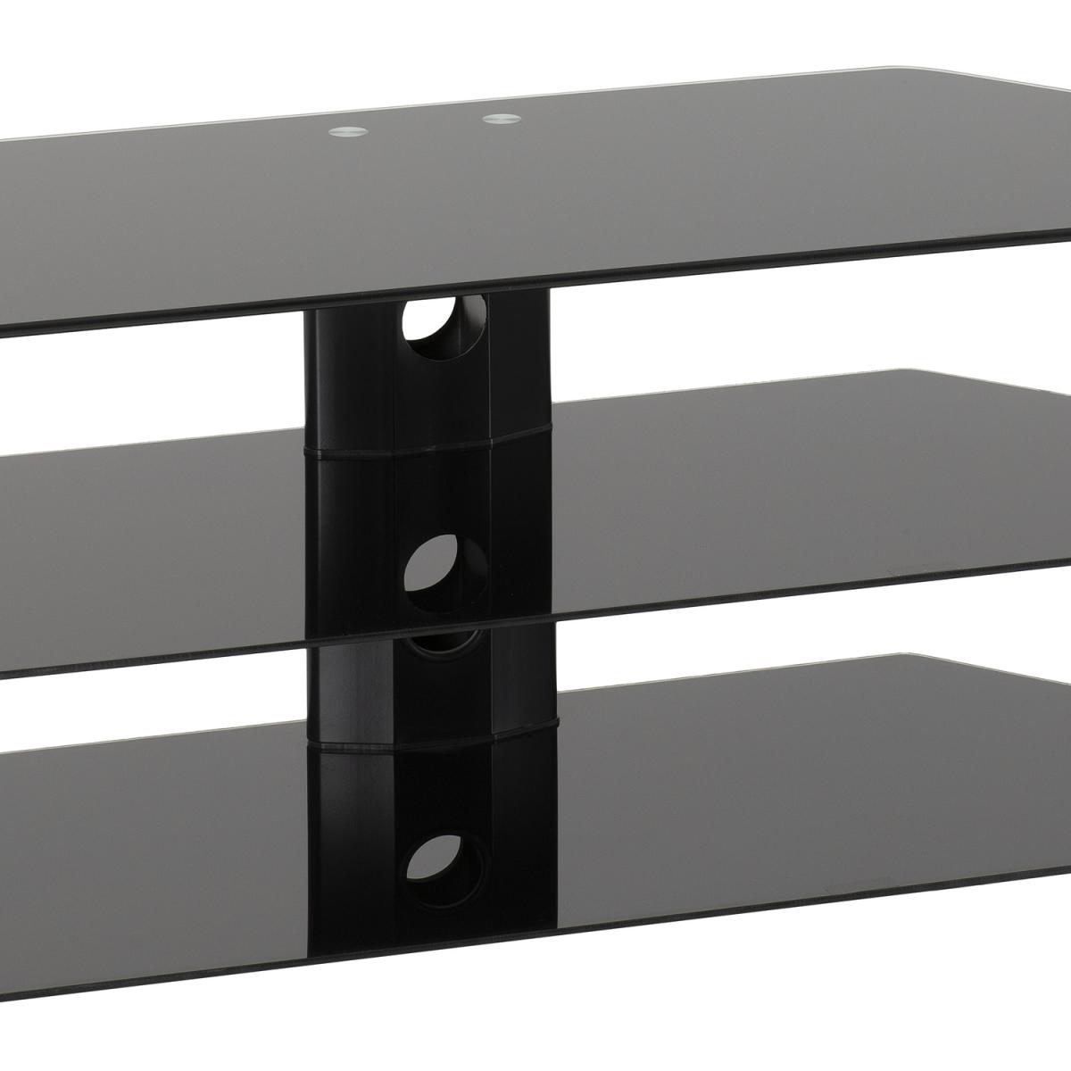 Featuring two tempered glass shelves, this black-finished TV Bench is sure to suit every look. The Bromley TV Stand in Black Glass/Black has 3 shelves for storage. With each shelf measuring 92cm wide and approximately 17cm in height, the stand is capable of holding wide and thin electrical devices such as DVD players. Made with glass and metal.