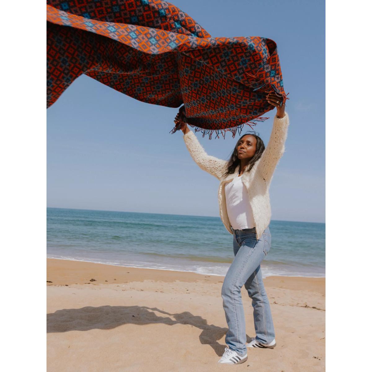 I love the Bronte throw for its bold, geometric pattern and rich navy and brick colours, which add warmth and personality to a space. It works well in both contemporary and traditional interiors, particularly those with neutral tones where it can serve as a statement piece or layered with other textiles for added texture. Practical styling tips include draping it over the back of a sofa or armchair to add visual interest, or folding it neatly at the foot of a bed for cosy, inviting decor. Its colour palette makes it versatile enough to pair with timber accents or metallic accessories, making it a great all-rounder for a variety of interiors.