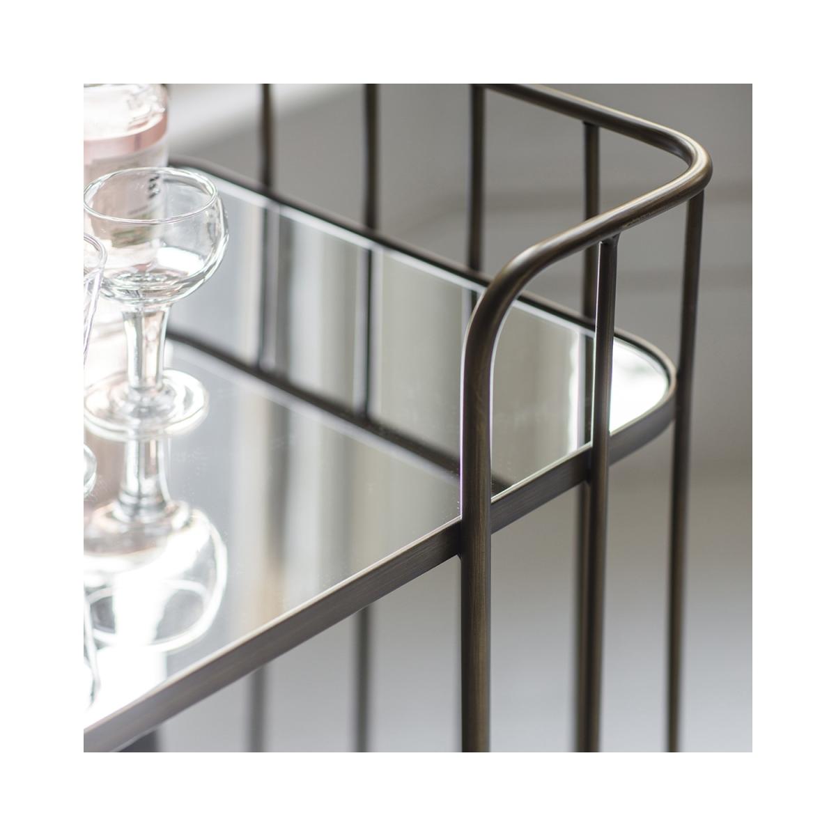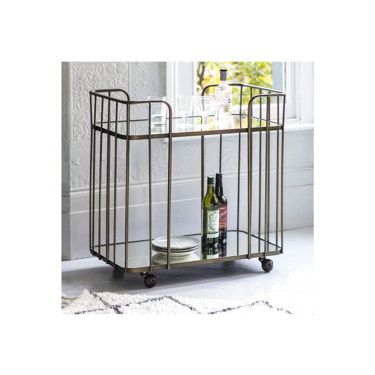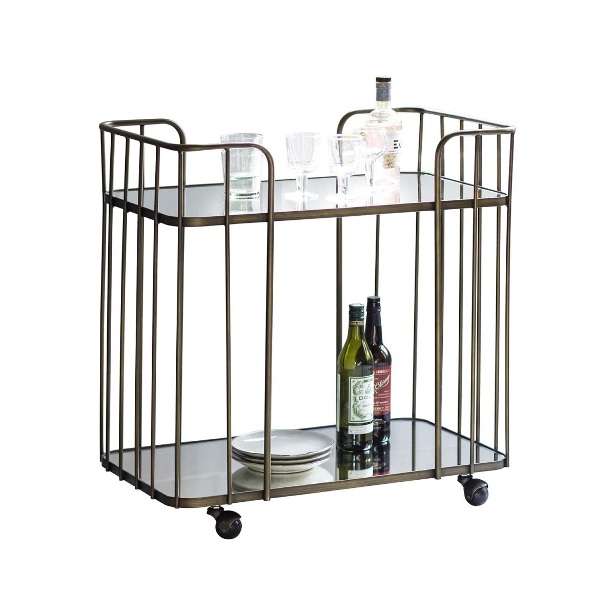 Dimensions W75 x D46 x H79cm. This entertaining essential features a toughened glass top and shelf with an art deco styled antique bronze finished metal frame and castors so it can effortlessly be wheeled into position whenever required. Features. On trend drinks trolley Perfect for entertaining2 mirrored shelves. Bronzed finish. Metal castors to move it where ever you want. No assembly required..