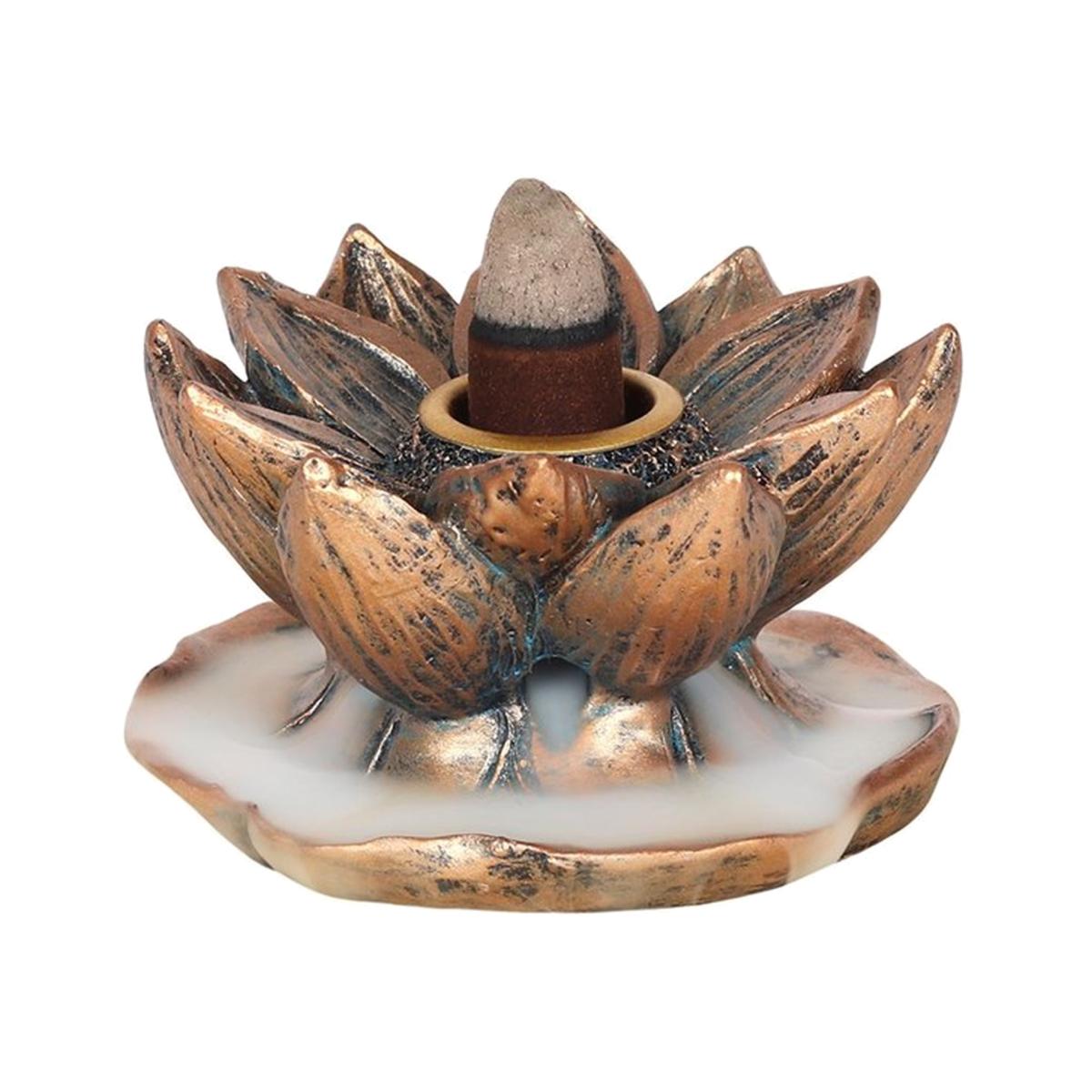 A beautiful backflow incense burner in a bronze lotus flower design. When the cone is lit the smoke from the cone cascades downwards in a mesmerising waterfall effect to pool at the bottom. Beautiful to watch. For best effects burn indoors in an area away from any sudden air movements. Please note that after burning it is normal for a light oily residue to appear on the oil burner, for this reason we recommend protecting any furniture it is placed upon suitably. The residue can be easily wiped off the burner with a damp cloth. Please exercise caution when burning incense. Only backflow incense cones should be used with this product standard incense cones will not create the desired effect. It is normal for cones to take up to 10 minutes after being lit to start creating the smokingmist effect.