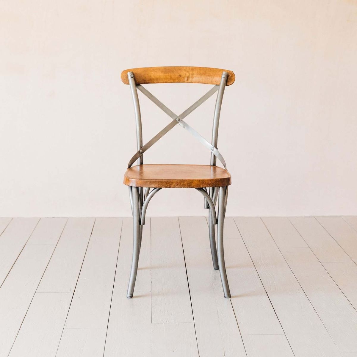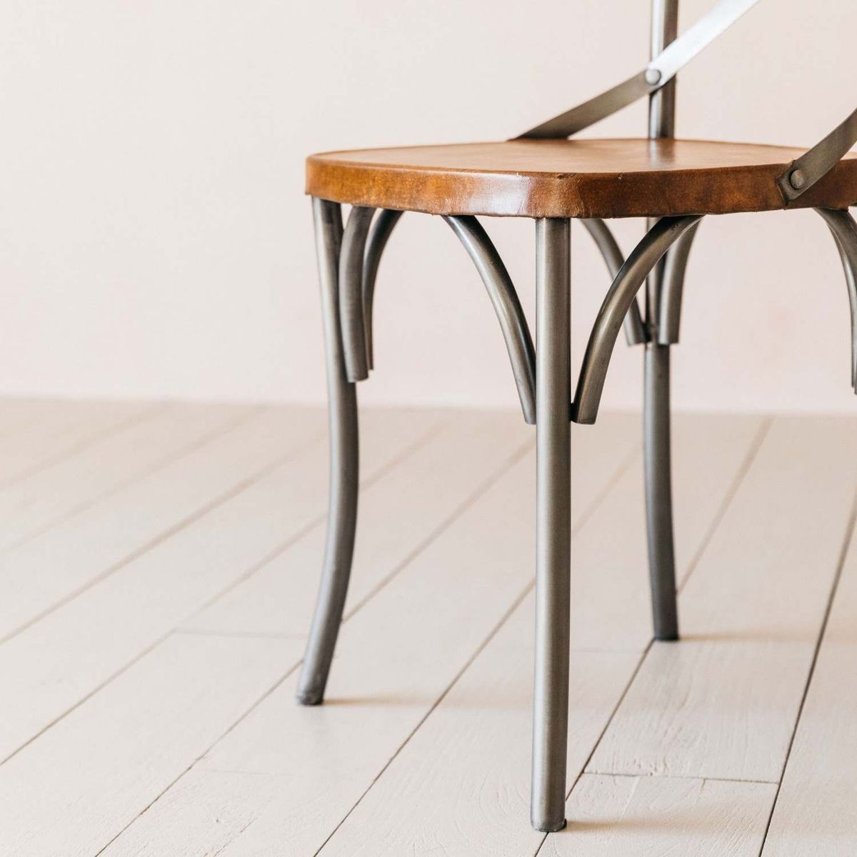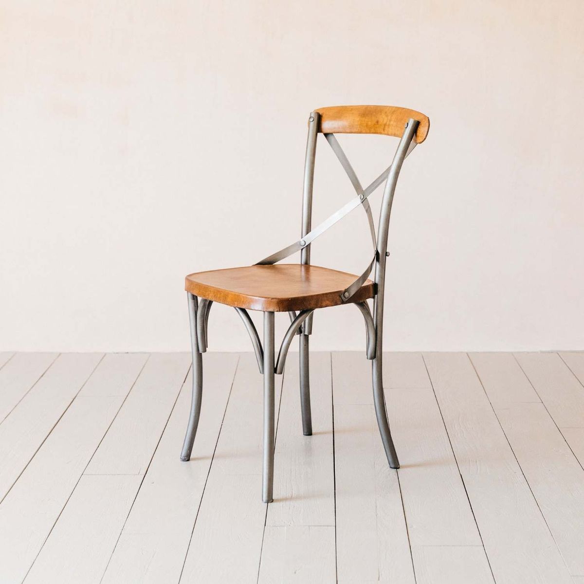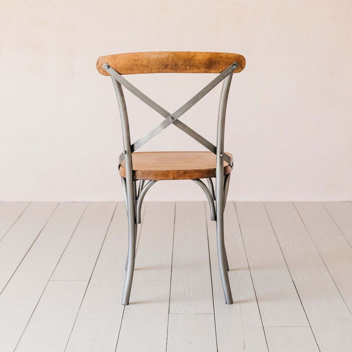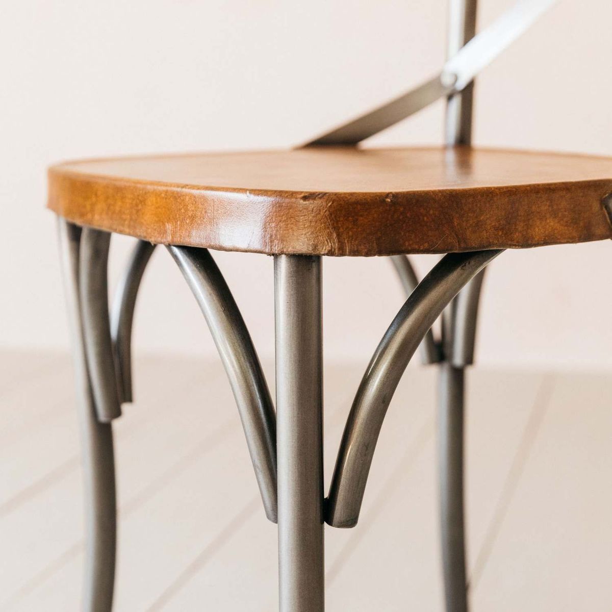 Crafted from weighty iron with an antique zinc finish, our Brook dining chair features a cross-style back, stylish sabre legs and a tan leather seat; an industrial design with a French twist.