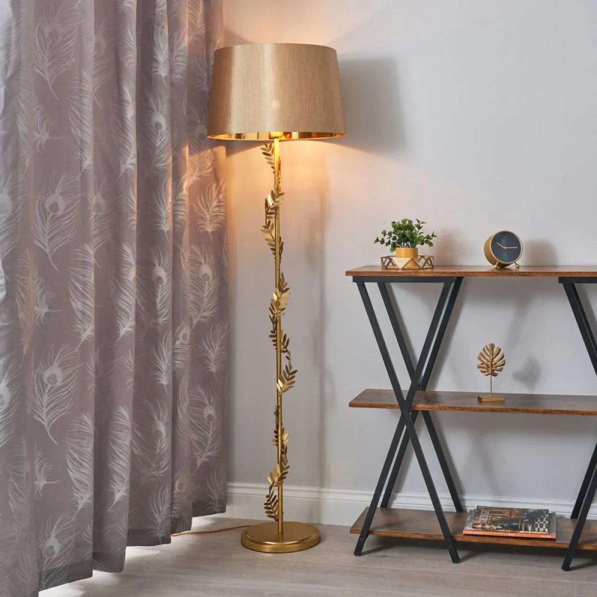 Add a quirky accent lighting to your interior décor with the Brookby Stem Floor Lamp. This floor light comes in a stylish satin brass finish, looking ideal in post modern, or art deco inspired interiors and casts a warm glow across the room as the light reflects off the brass palm leaf design. Style this floor lamp next to any arm chair, couch, or bed for the perfect accent light to illuminate any dark corners in your living room or bedroom, perfect for reading.