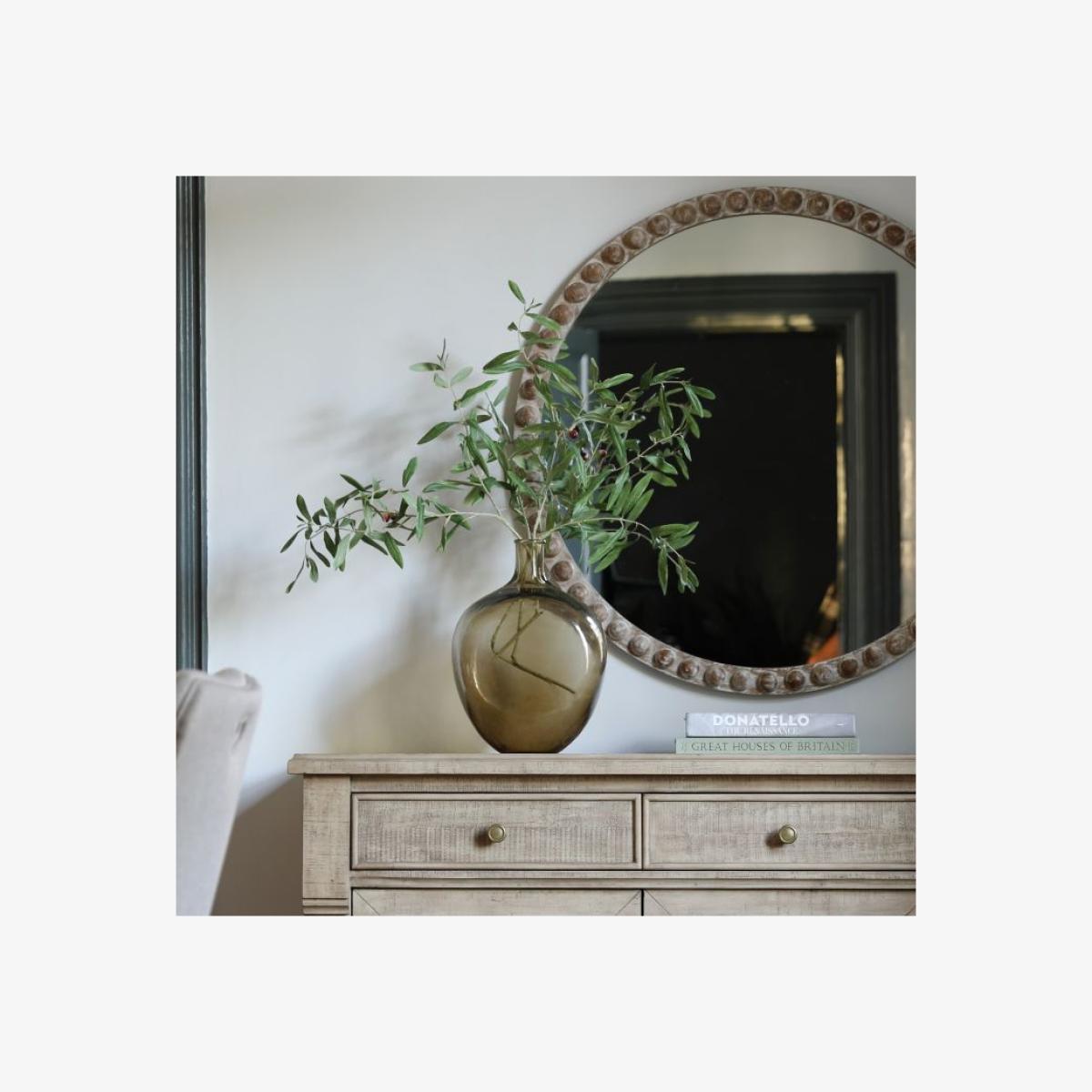 This charming round mirror combines the allure of vintage design with rustic elegance. The weathered finish adds character and warmth to the home whilst the round detailing on the frame adds a subtle classic touch to the home. Shape: Round. Material: MDF 60% / Glass 40%. Colour/Finish: Natural.