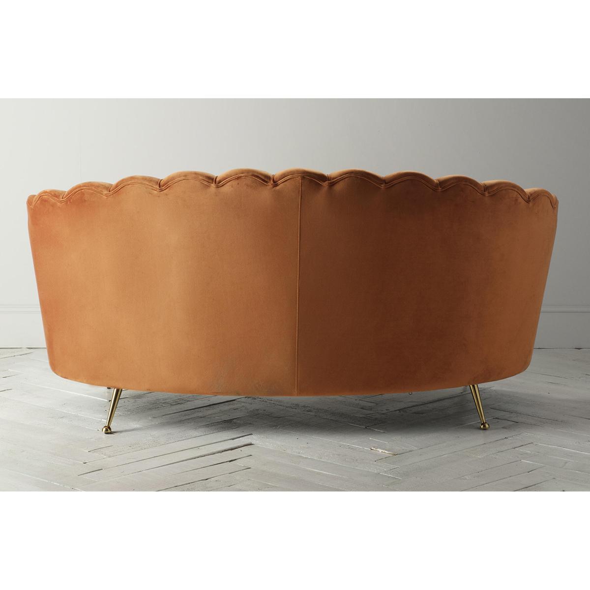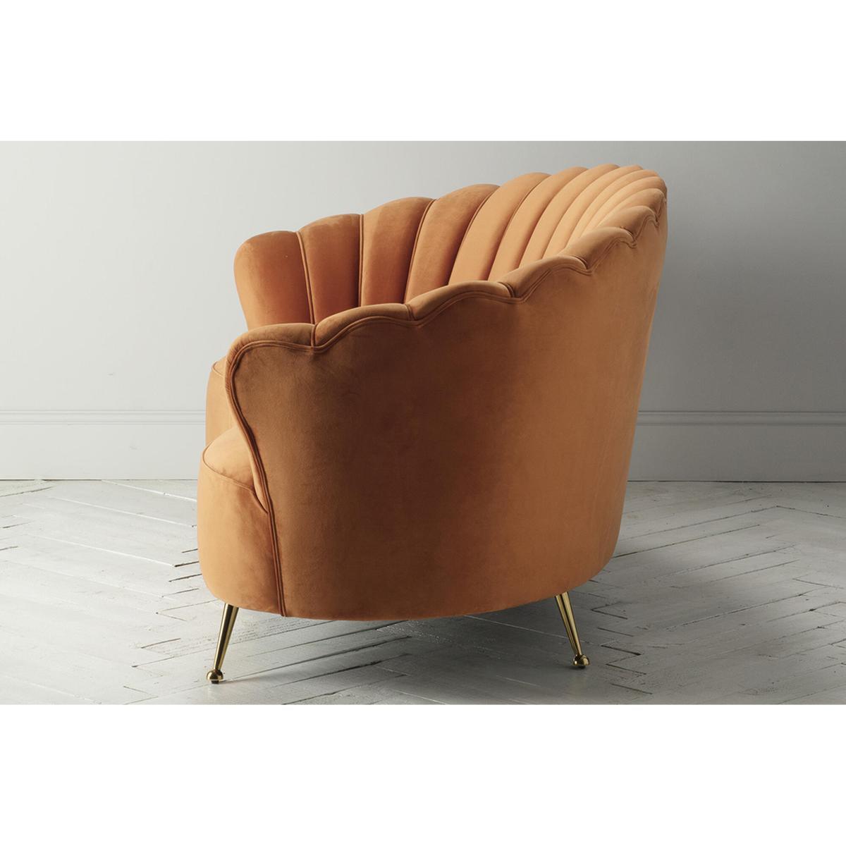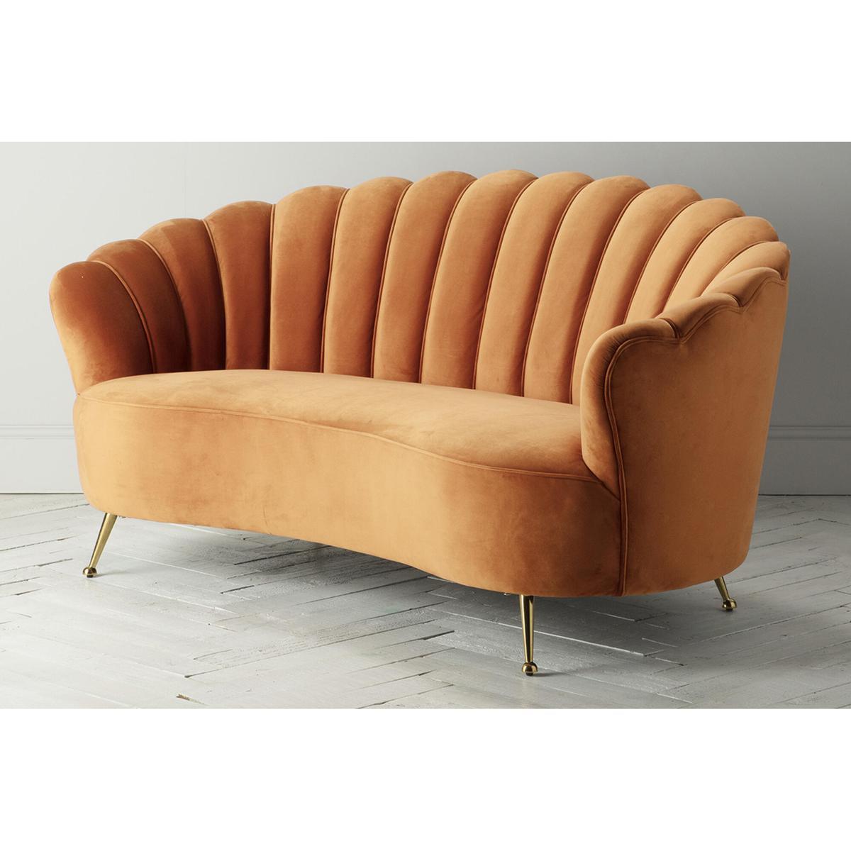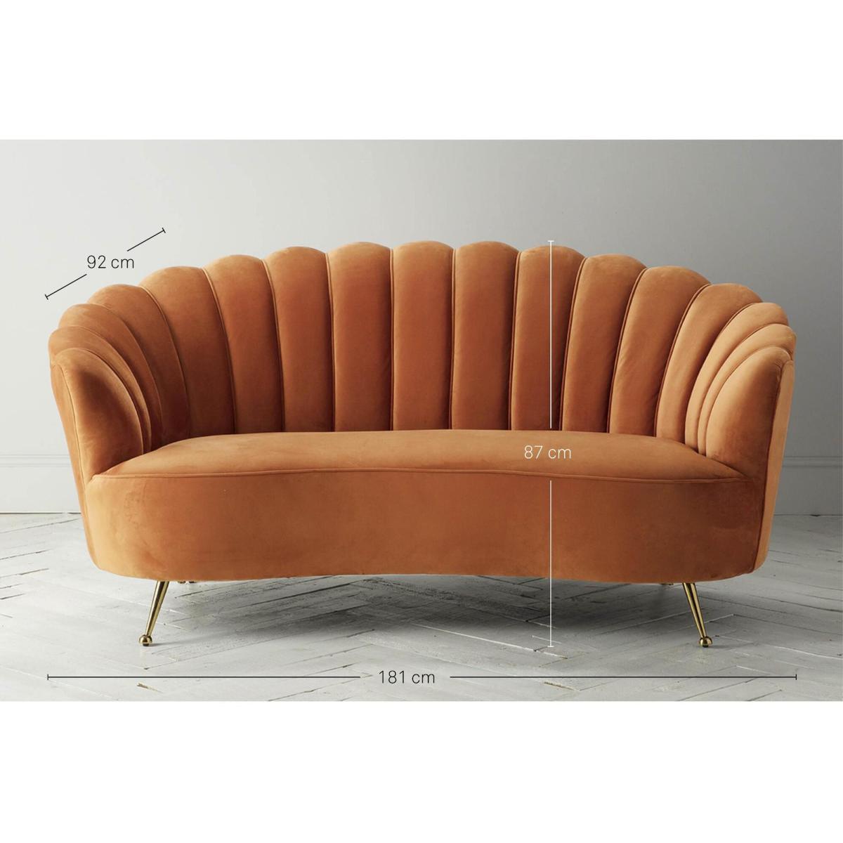 I love this sofa for its rich rust-orange hue and the luxurious velvet finish, which instantly adds warmth and sophistication to any space. It works particularly well in eclectic or bohemian interiors, where bold colours and textures are celebrated, but it can also bring a pop of colour to more neutral schemes. For styling, keep accessories simple-think neutral cushions or throws to highlight the sofa’s shade, or go bold with contrasting patterns and colours. Styling tips include pairing it with brass or gold accents to complement its legs, and placing it against a darker wall to really make the colour stand out. Its curved, scalloped design also makes it a statement piece that can anchor a room without overpowering it.
