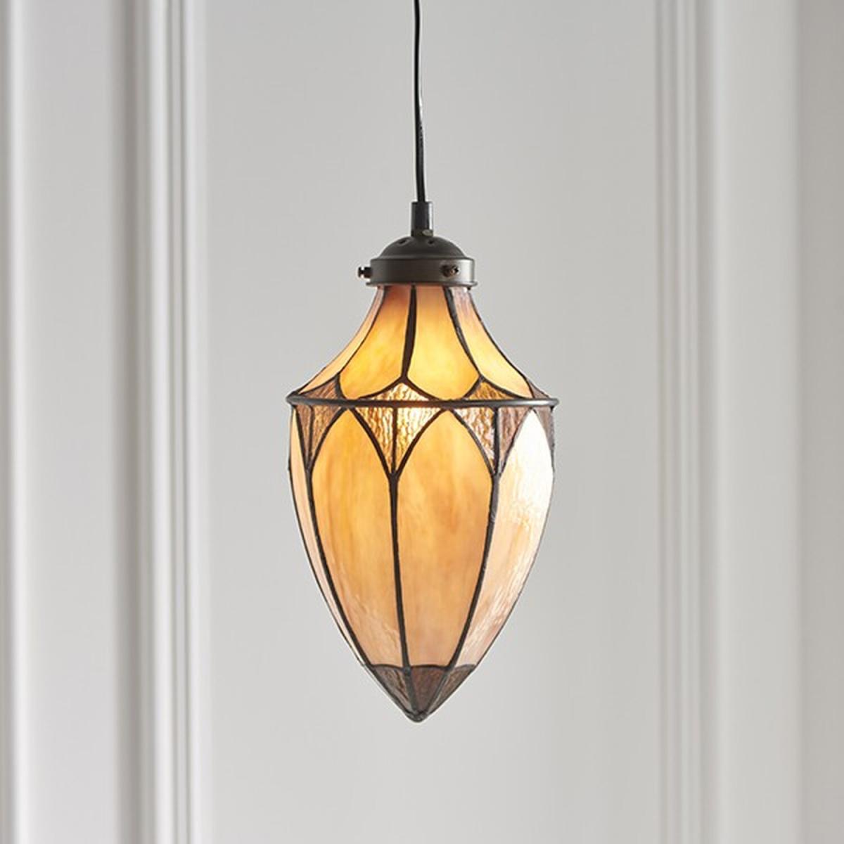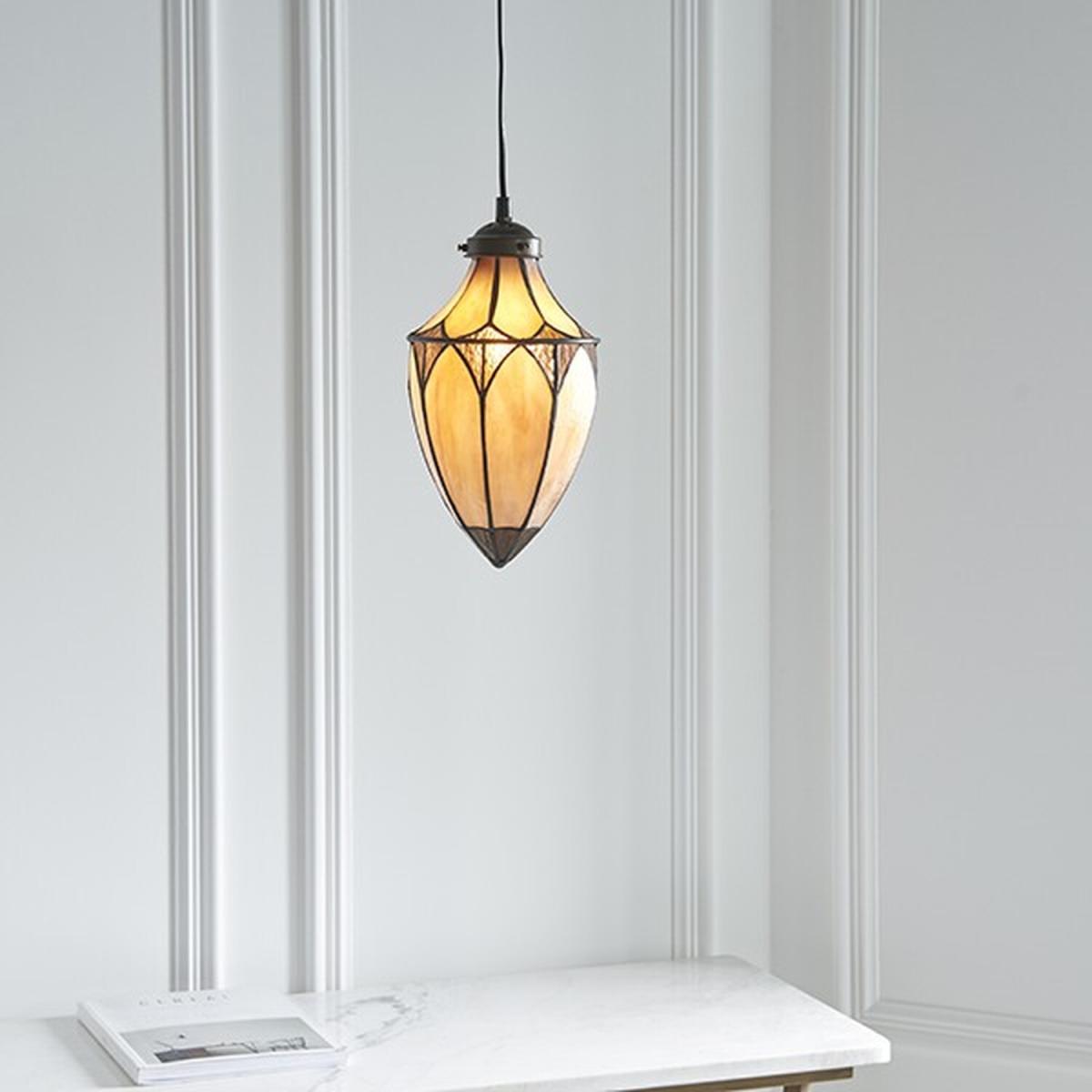 Inspired by the Art Deco period, the Tiffany small acorn pendant features an unusual shape, bevelled and textured glass combined with rich cream art glass creating a striking finish. Compatible with LED lamps and matching items available.