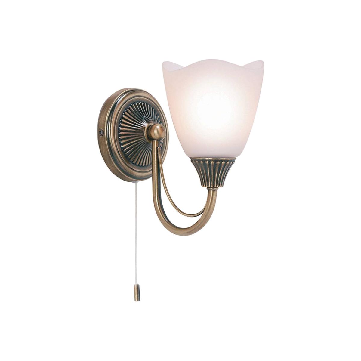 The Brooklyn 1 Light Wall Bracket from Lighting is a stunning wall light with a classic design. The light features a circular plate with a curved arm which supports a stunning opal glass shade. The antique brass finish completes the traditional look of the lamp. A pull cord allows for ease of use and means the light can be operated individually. This wall bracket measures a height of 200mm and has a width of 110mm. Requires 1x Candle SES bulbs not exceeding 60w. product code: 601-1A N The Brooklyn 1 Light Wall Bracket from Lighting is a stunning wall light with a classic design. The light features a circular plate with a curved arm which supports a stunning opal glass shade. The antique brass finish completes the traditional look of the lamp. A pull cord allows for ease of use and means the light can be operated individually. This wall bracket measures a height of 200mm and has a width of 110mm. Requires 1x Candle SES bulbs not exceeding 60w. product code: 601-1A N