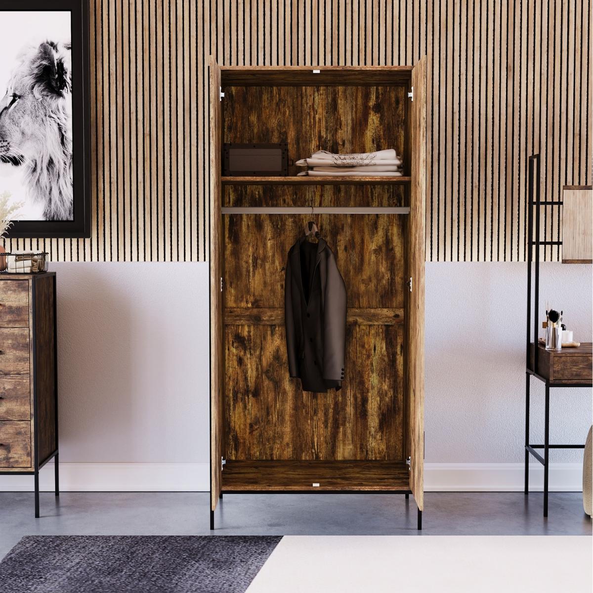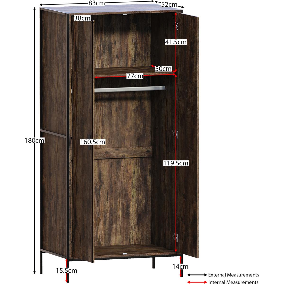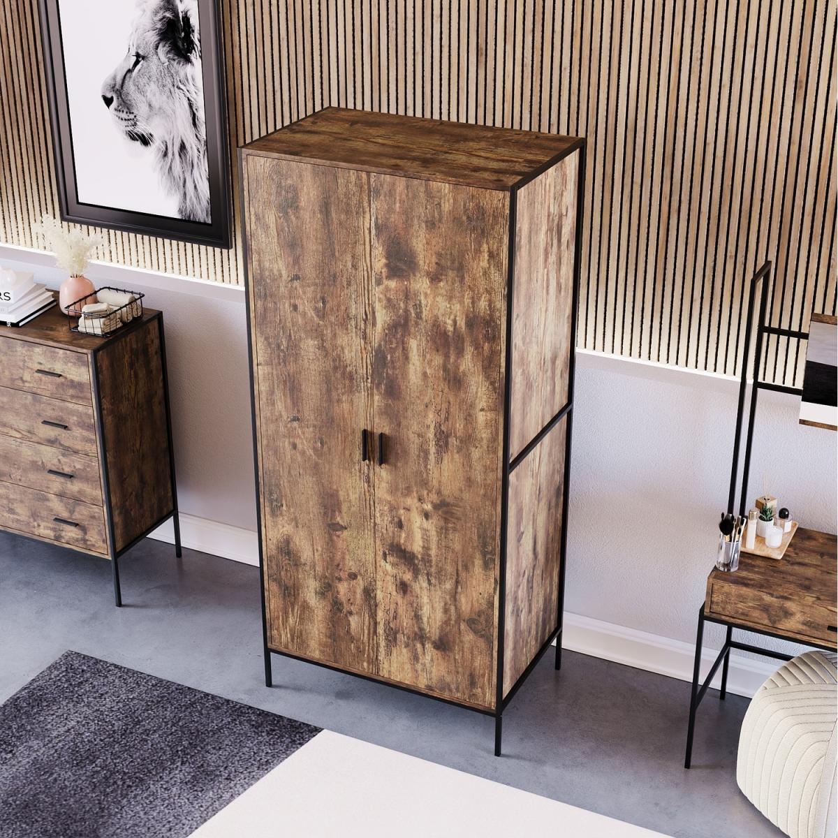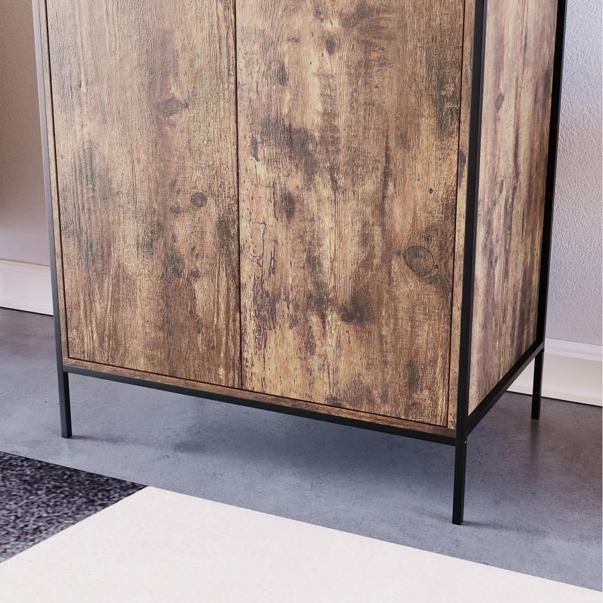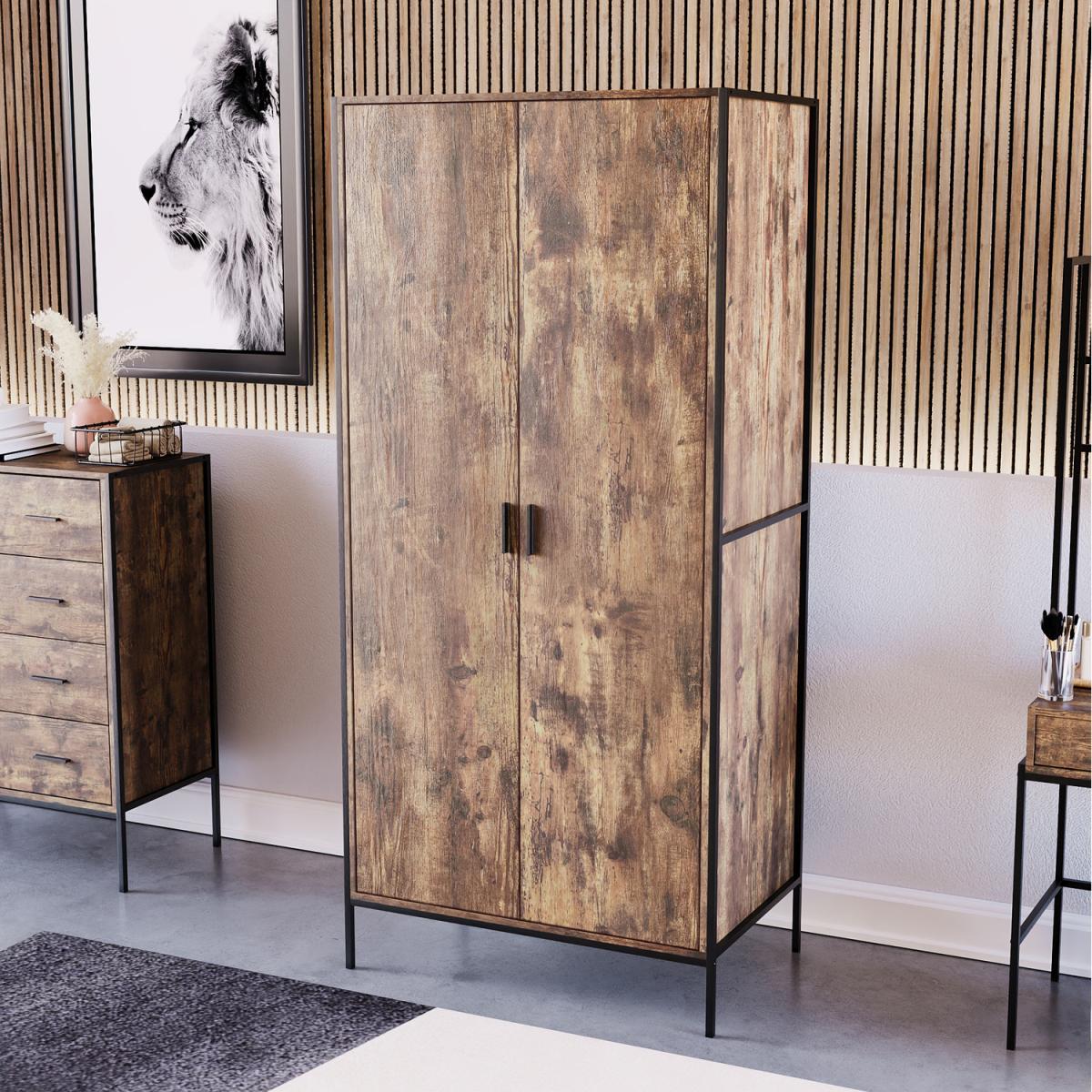 As part of the Brooklyn collection, this 2-door wardrobe combines a powder-coated black iron frame, rustic dark wood or grey wood carcass. It is complemented with a black aluminium handle to create the ideal industrial-style inspired furniture. Coming in two neutral colour options, you have the perfect opportunity to choose the wardrobe which would be the perfect match for your bedroom. It features a hanging rail and a large storage shelf above where you can easily store a large number of clothes without them getting creased or untidy.