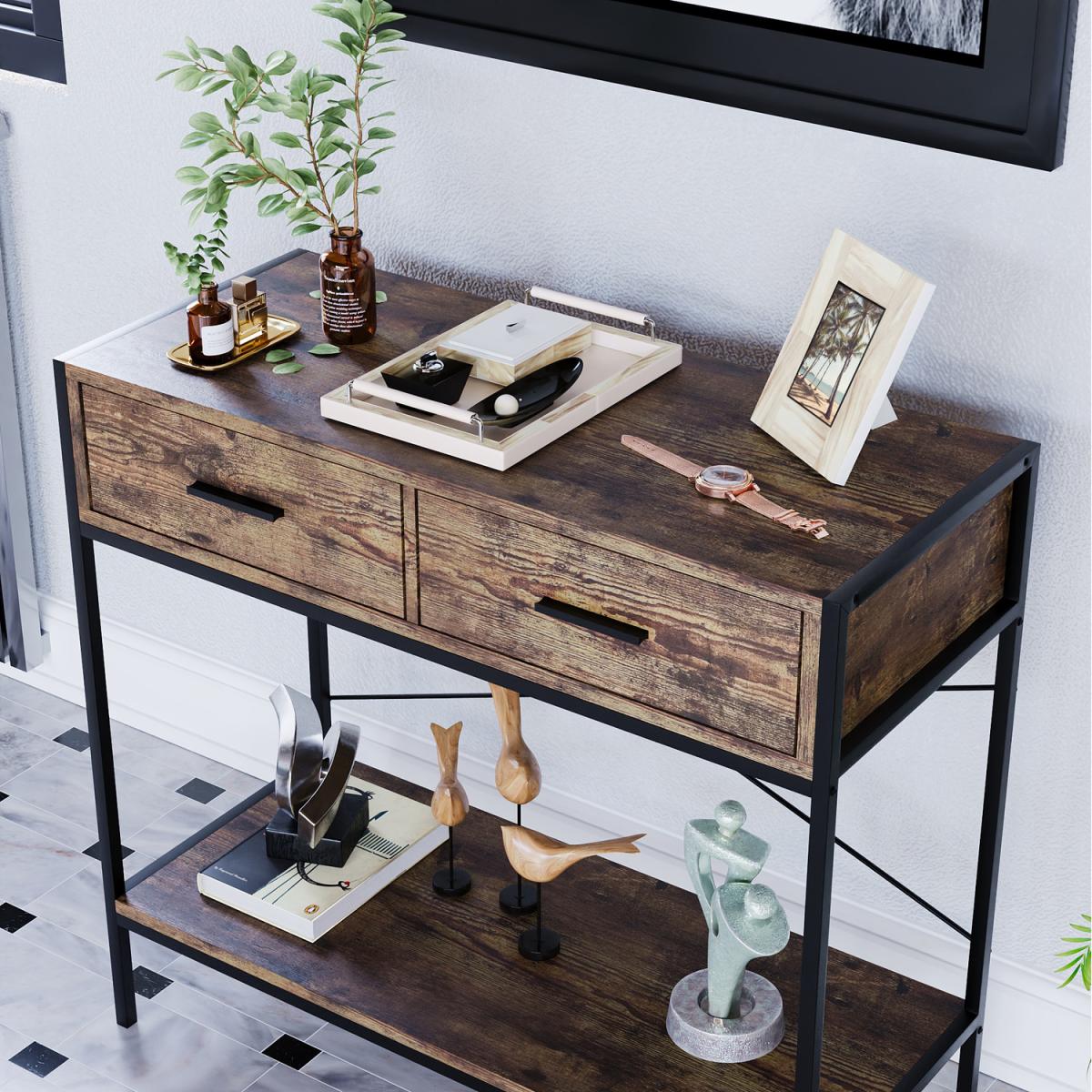 As part of the Brooklyn collection, this 2-drawer console table combines a powder-coated black iron frame, comes in 2 colour options of either grey or dark wood and is complemented with black aluminium handles to create the ideal industrial-style inspired furniture. Featuring two drawers which slide seamlessly on metal runners, a spacious table top to display photos and a shelf underneath to help you keep your space tidy.