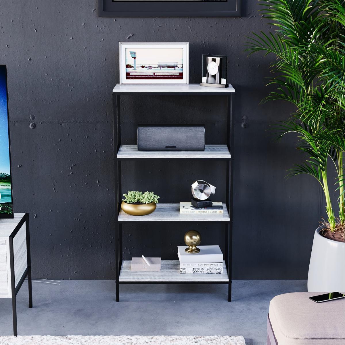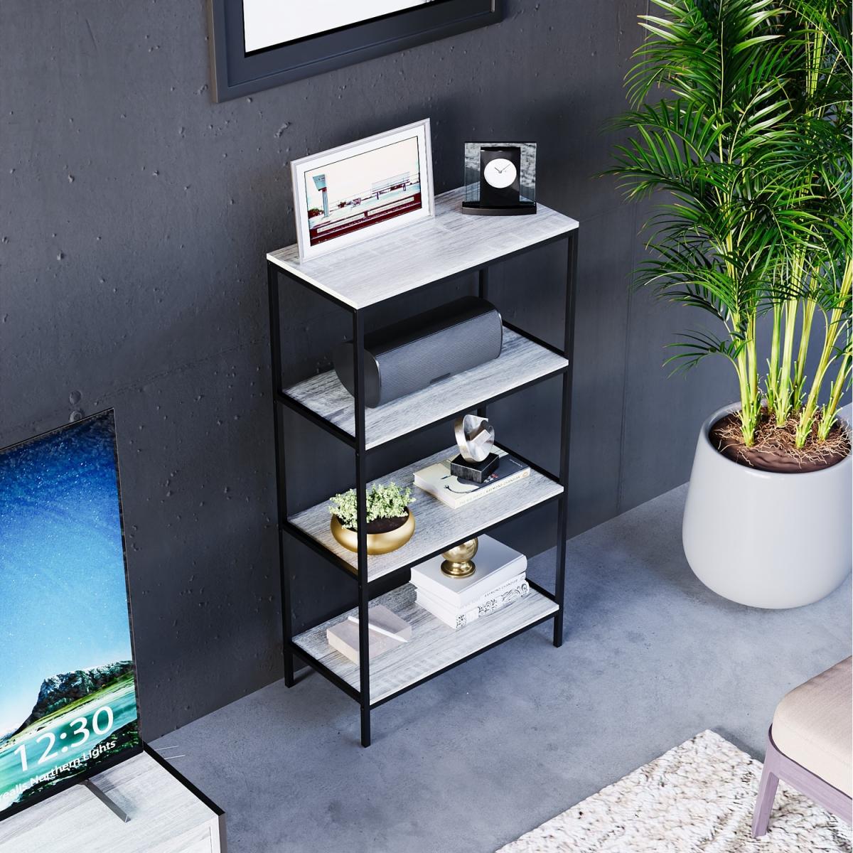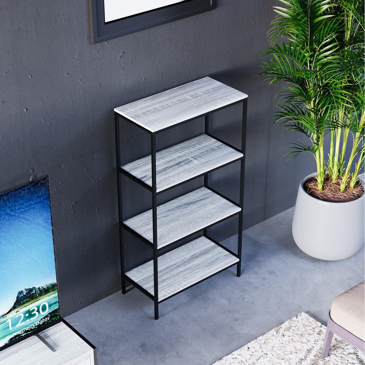 I love how this grey 4-tier shelf’s slim black frame and timber-effect planks keep things looking fresh without overwhelming a room. It works equally well in modern, Scandi or industrial schemes, slipping neatly into a living room, hallway or home office. For practical styling, alternate books with attractive storage boxes, add a trailing plant or two on the top shelf, and arrange decorative objects in odd-numbered clusters. Leave a little empty space on each tier to maintain an open, airy feel.