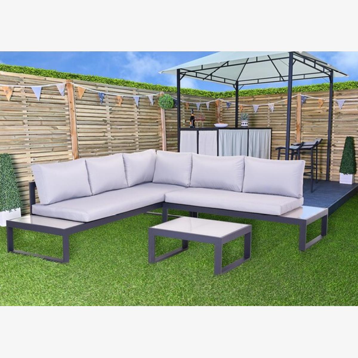 A beautiful addition to your patio or conservatory, this Brooklyn Corner 3 Piece Sofa Set is the perfect place to kick back and relax with family and friends. This comfortable lounge set comes with a padded seat and back cushions that are great for soaking up the sun. Featuring a corner sofa and table, this set is ideal for hosting barbecues and other outdoor get-togethers, allowing you to all stretch out comfortably while still facing each other so you can chat. The Brooklyn features a smart black, blocky frame made from steel, which contrasts nicely with the powder grey cushions, adding simple sophistication to your garden.