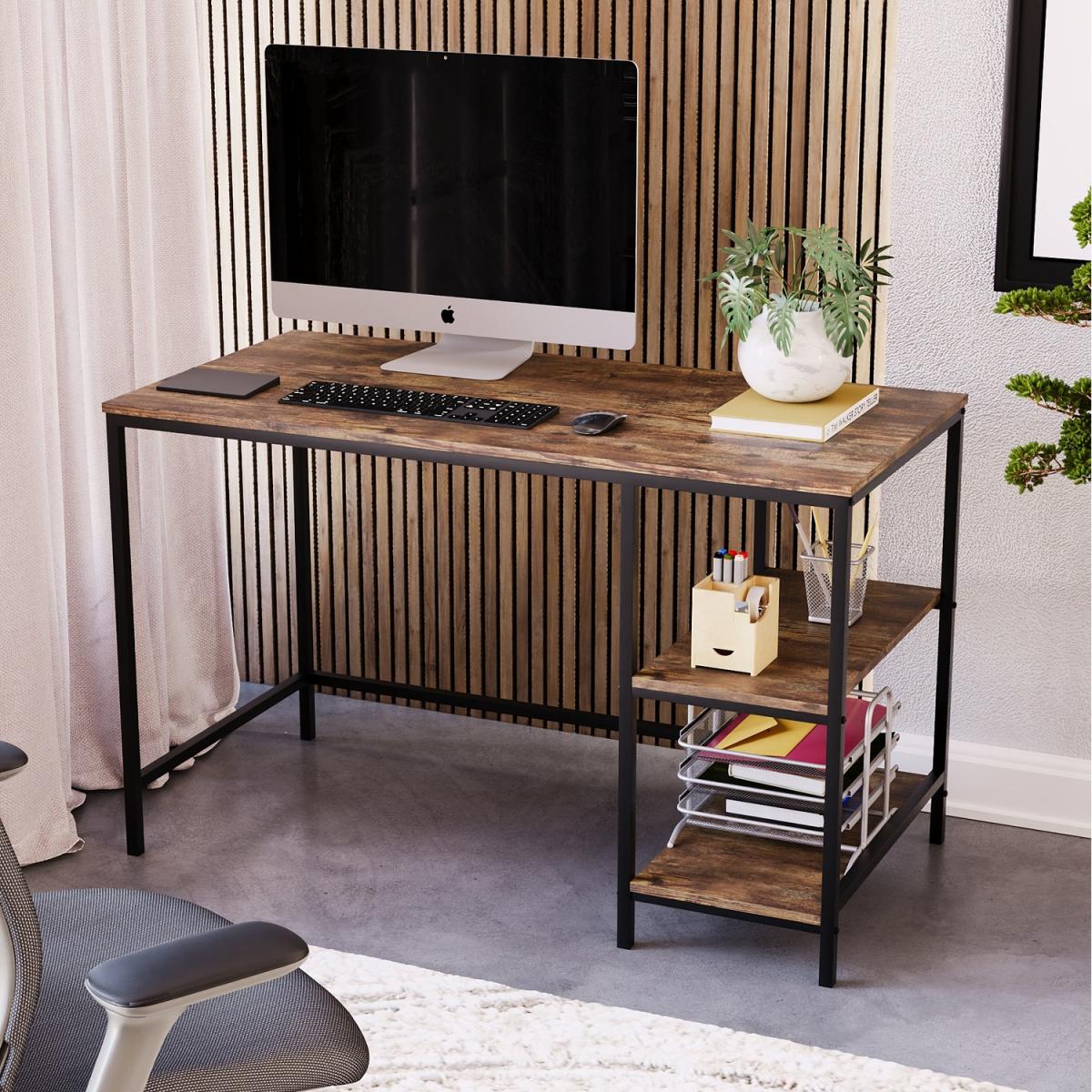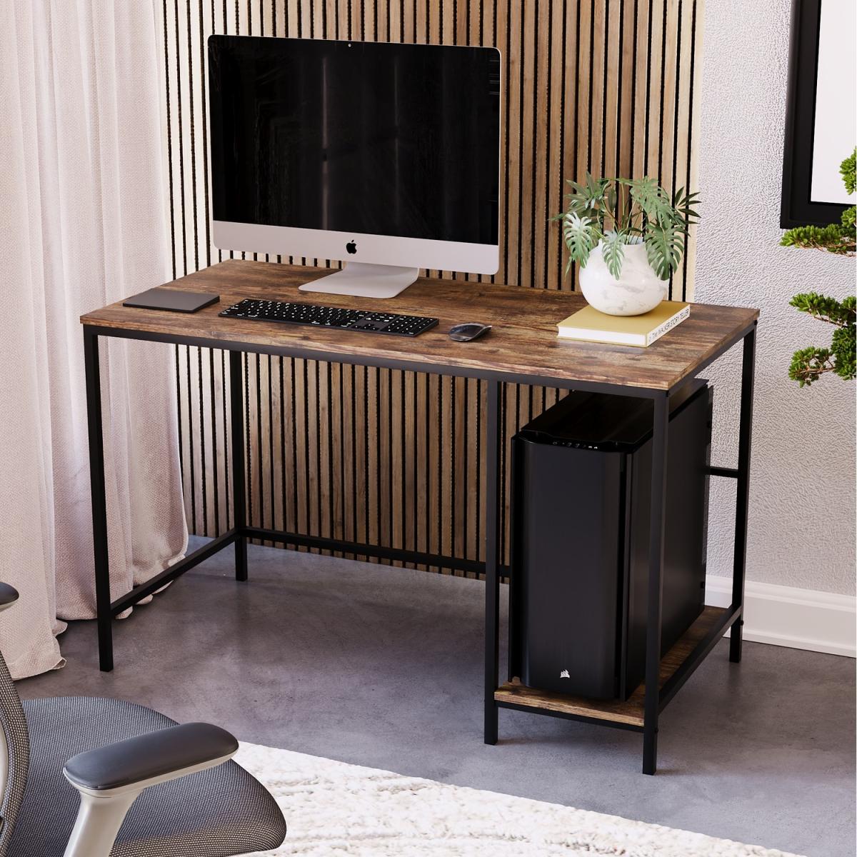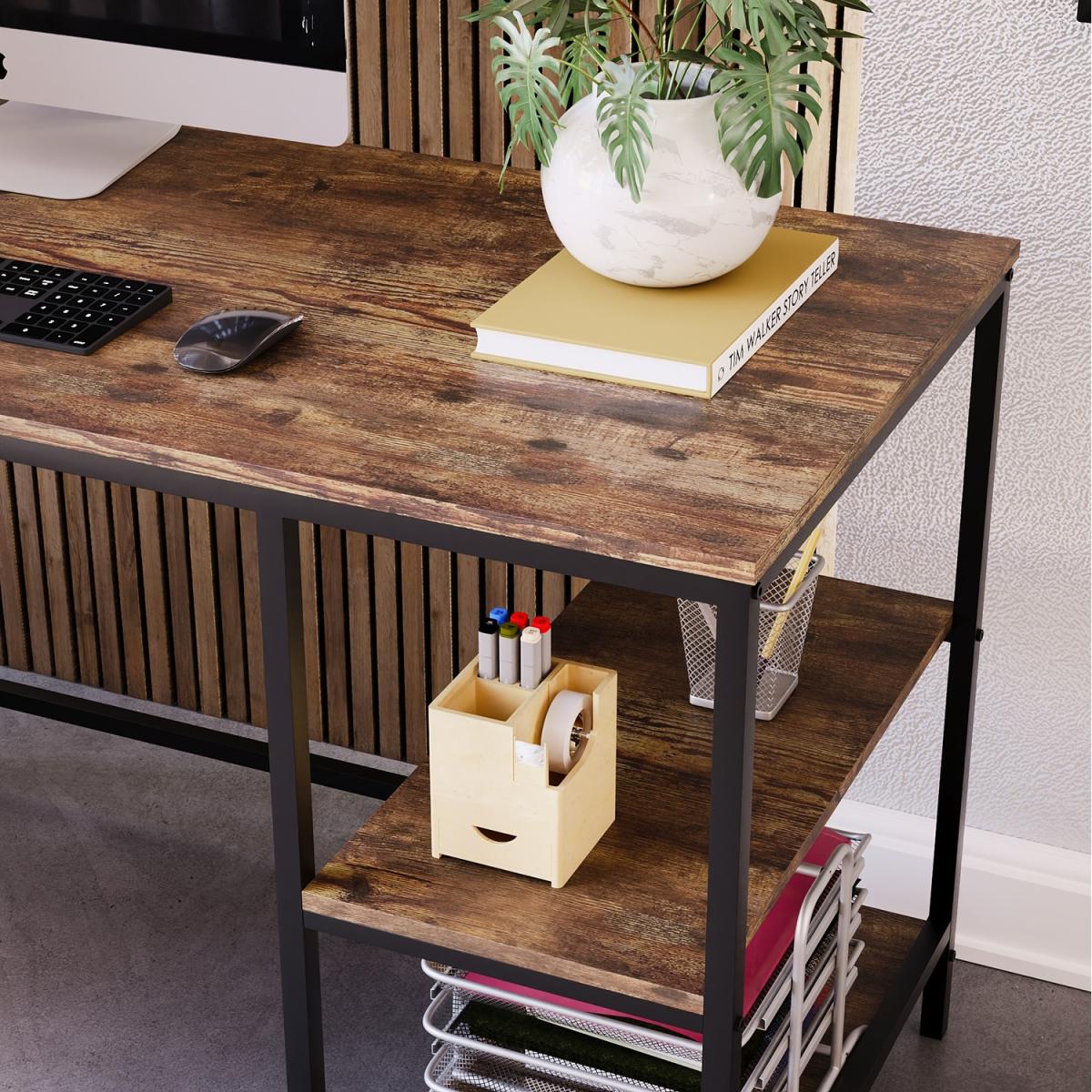 Displaying rustic charm, this Brooklyn computer desk combines a powder-coated black iron frame and rustic dark wood or grey wood top to create the ideal industrial-style inspired furniture. It radiates industrial chic and is a perfect choice for the modern home. Featuring a spacious tabletop and two shelves which can be assembled on either the left- or right-hand side, everything can be within your reach. If you need space for a large computer, simply remove the top shelf for extra room.