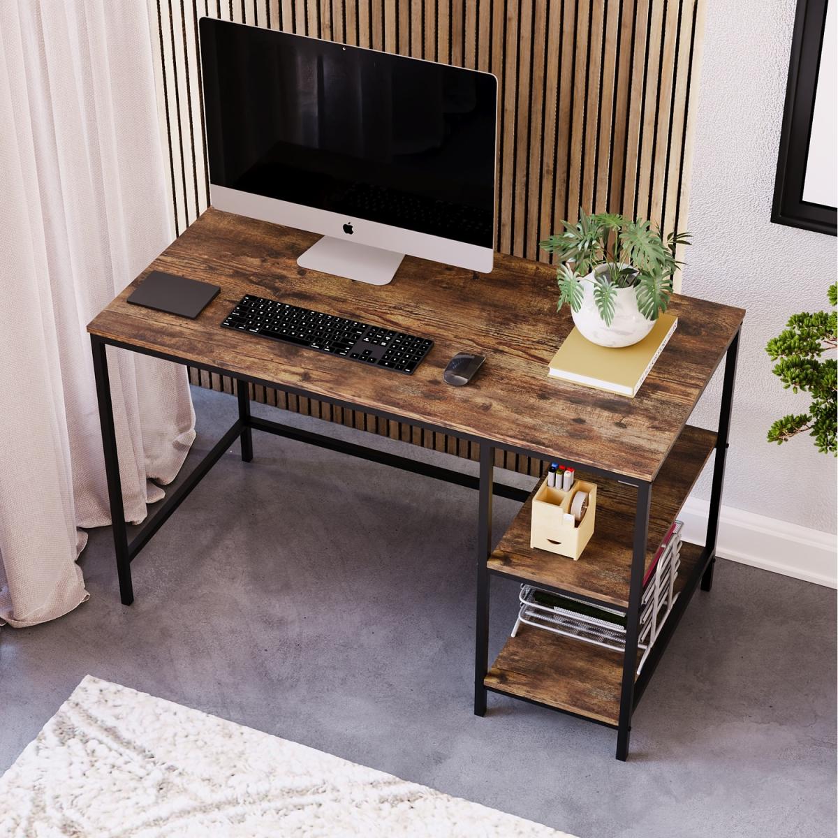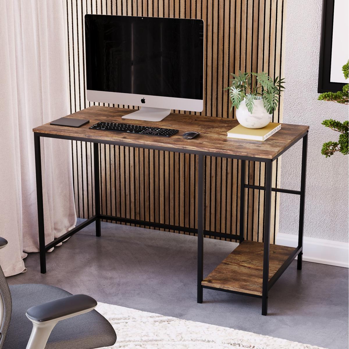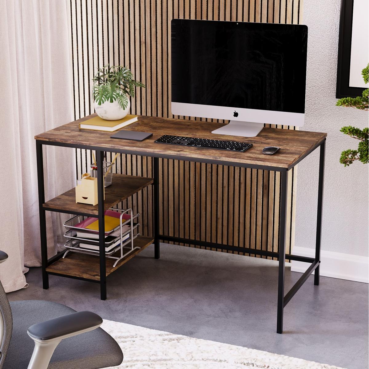 Displaying rustic charm, this Brooklyn computer desk combines a powder-coated black iron frame and rustic dark wood or grey wood top to create the ideal industrial-style inspired furniture. It radiates industrial chic and is a perfect choice for the modern home. Featuring a spacious tabletop and two shelves which can be assembled on either the left- or right-hand side, everything can be within your reach. If you need space for a large computer, simply remove the top shelf for extra room.