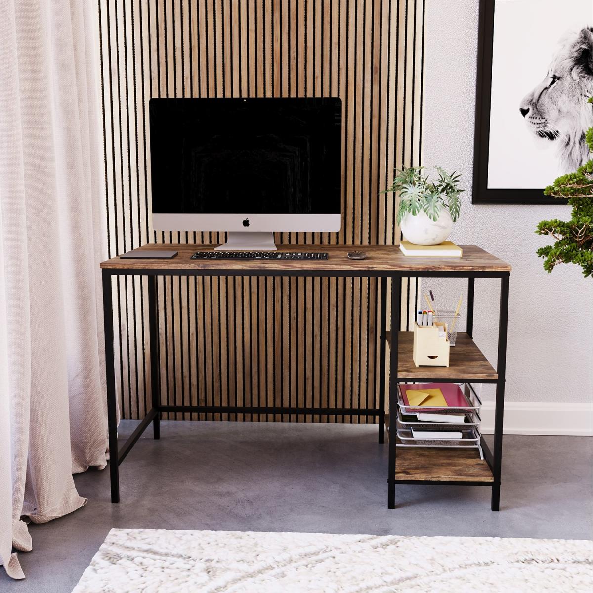 I’m a fan of the Brooklyn desk for its clean lines and sturdy metal frame teamed with dark-wood surfaces - it feels both modern and timeless. Its two open shelves make it ideal for smaller home offices, loft-style living rooms or a minimalist study, as you get storage without the bulk of closed cabinetry. To style it, keep the desktop clutter-free: choose a slim desk lamp, a low-profile monitor stand and a small planter for a touch of green. On the shelves, mix labelled boxes or magazine holders with a few decorative objects - this balances function and form while maintaining an airy look. Don’t forget simple cable clips underneath to keep wires neatly out of sight.