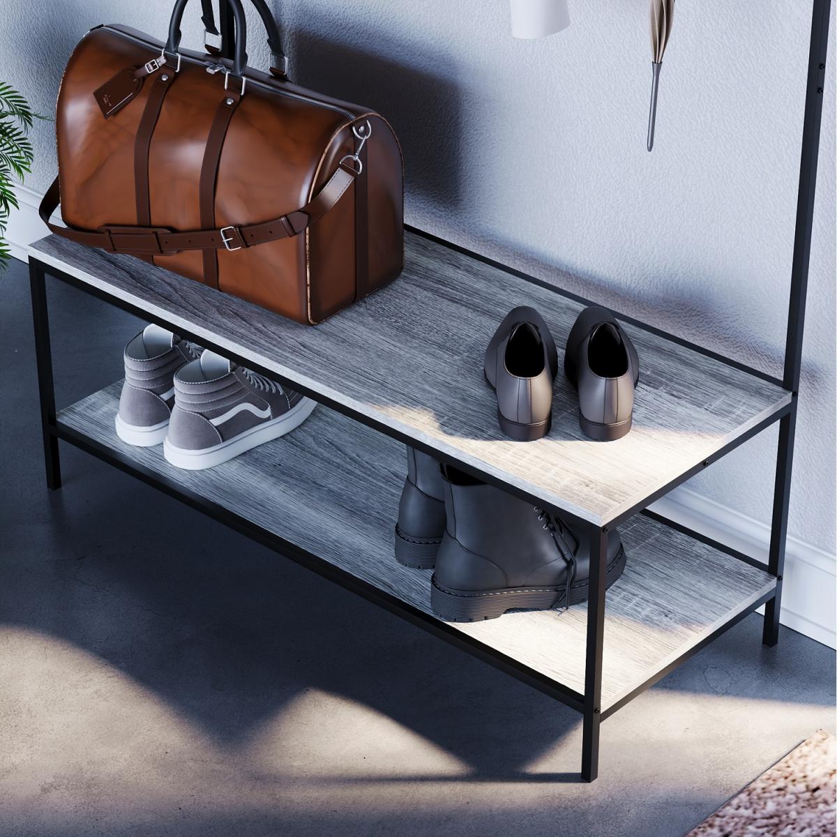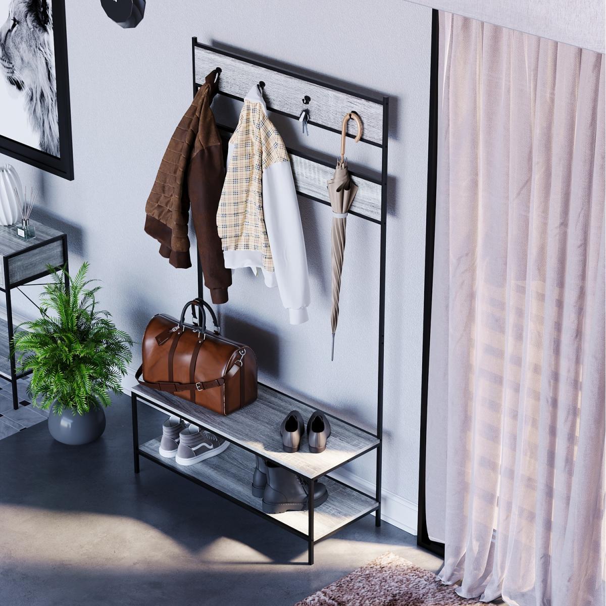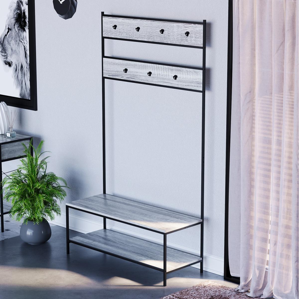 As part of the Brooklyn collection, this hallway unit combines a powder-coated black iron frame and rustic dark wood or grey wood top to create the ideal industrial-style inspired furniture. Keep your entryway neat and tidy with this smart coat & shoe rack hallway unit. Featuring 7 hooks to hang your coats, hats and scarves, a bench seat to remove your shoes and an underneath shelf to store your shoes.