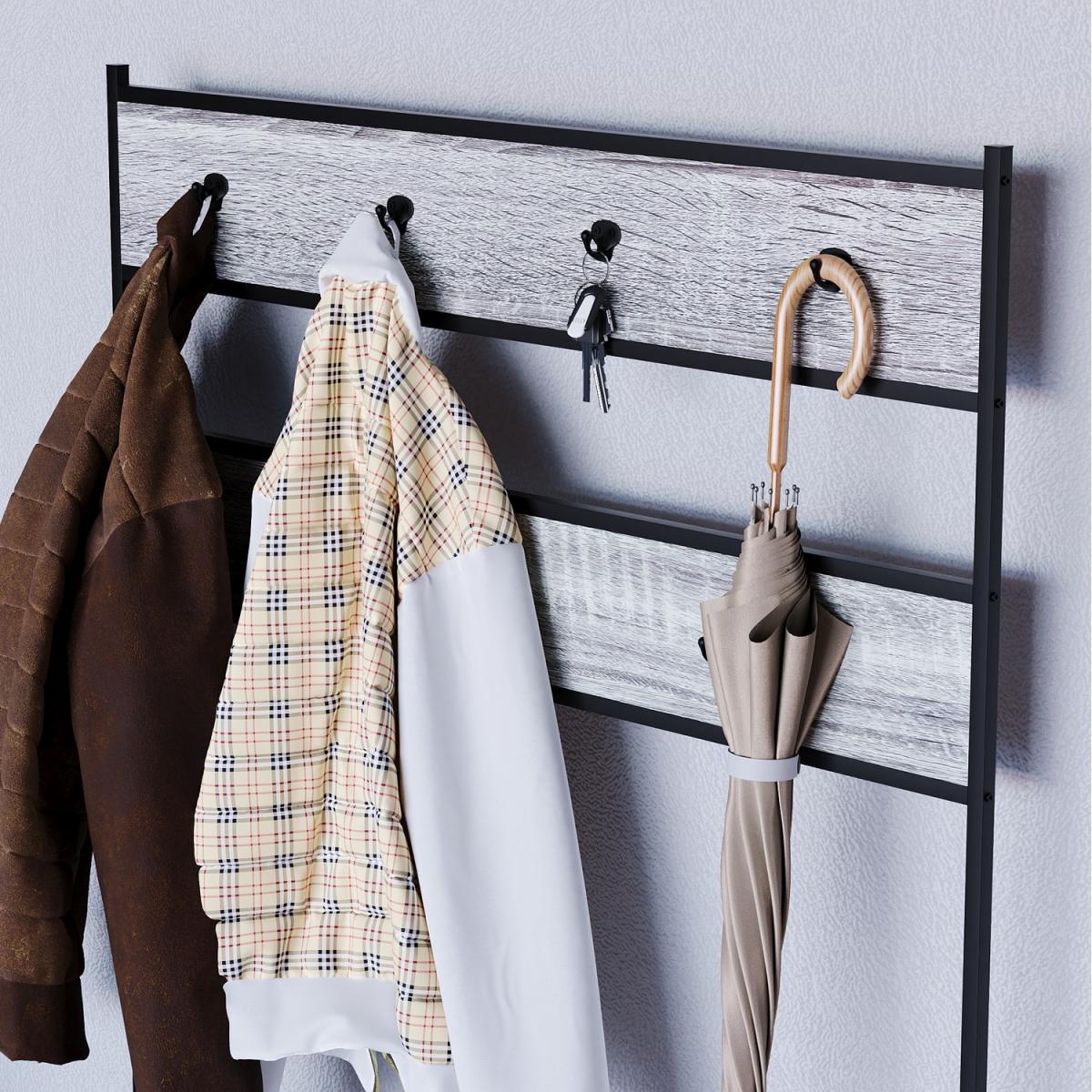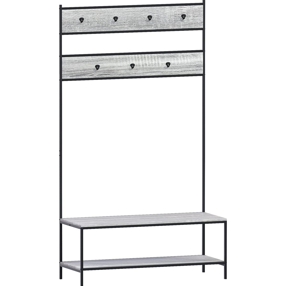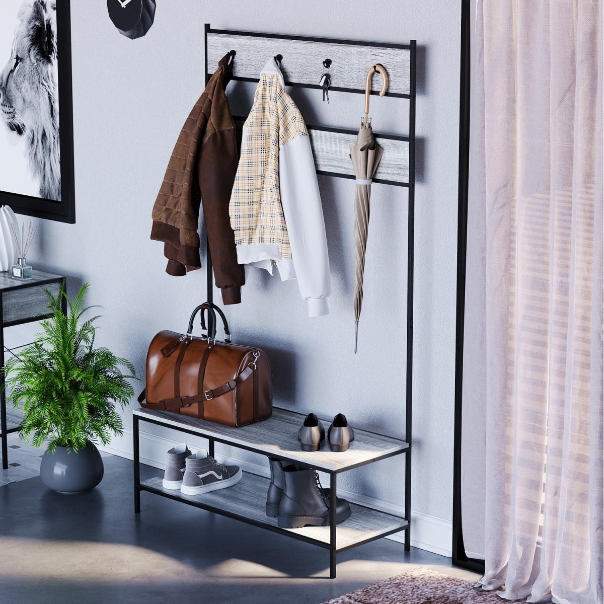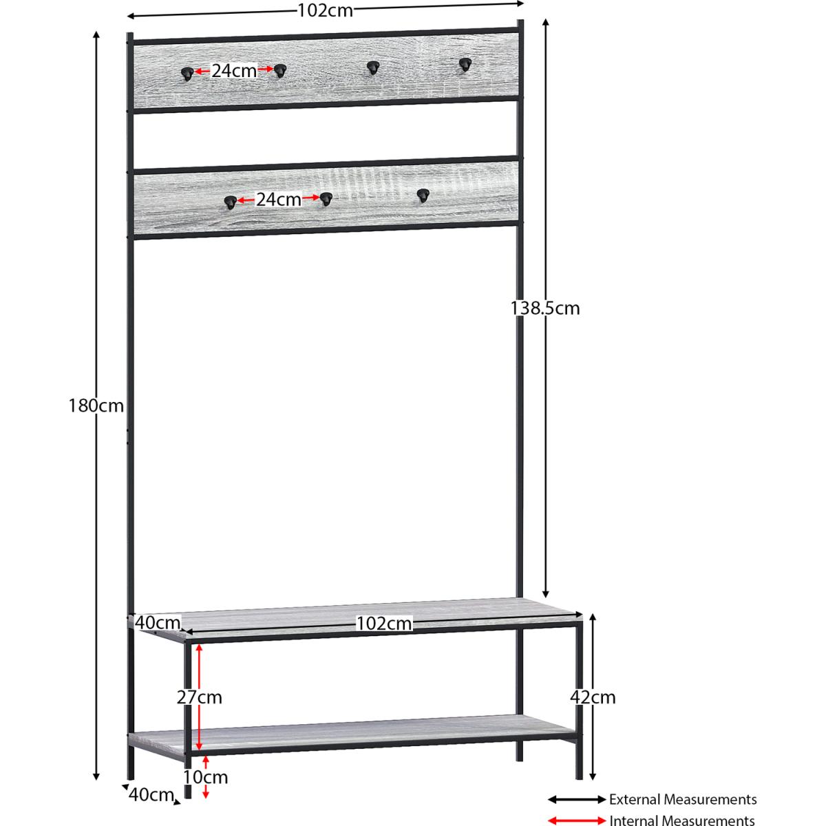 As part of the Brooklyn collection, this hallway unit combines a powder-coated black iron frame and rustic dark wood or grey wood top to create the ideal industrial-style inspired furniture. Keep your entryway neat and tidy with this smart coat & shoe rack hallway unit. Featuring 7 hooks to hang your coats, hats and scarves, a bench seat to remove your shoes and an underneath shelf to store your shoes.