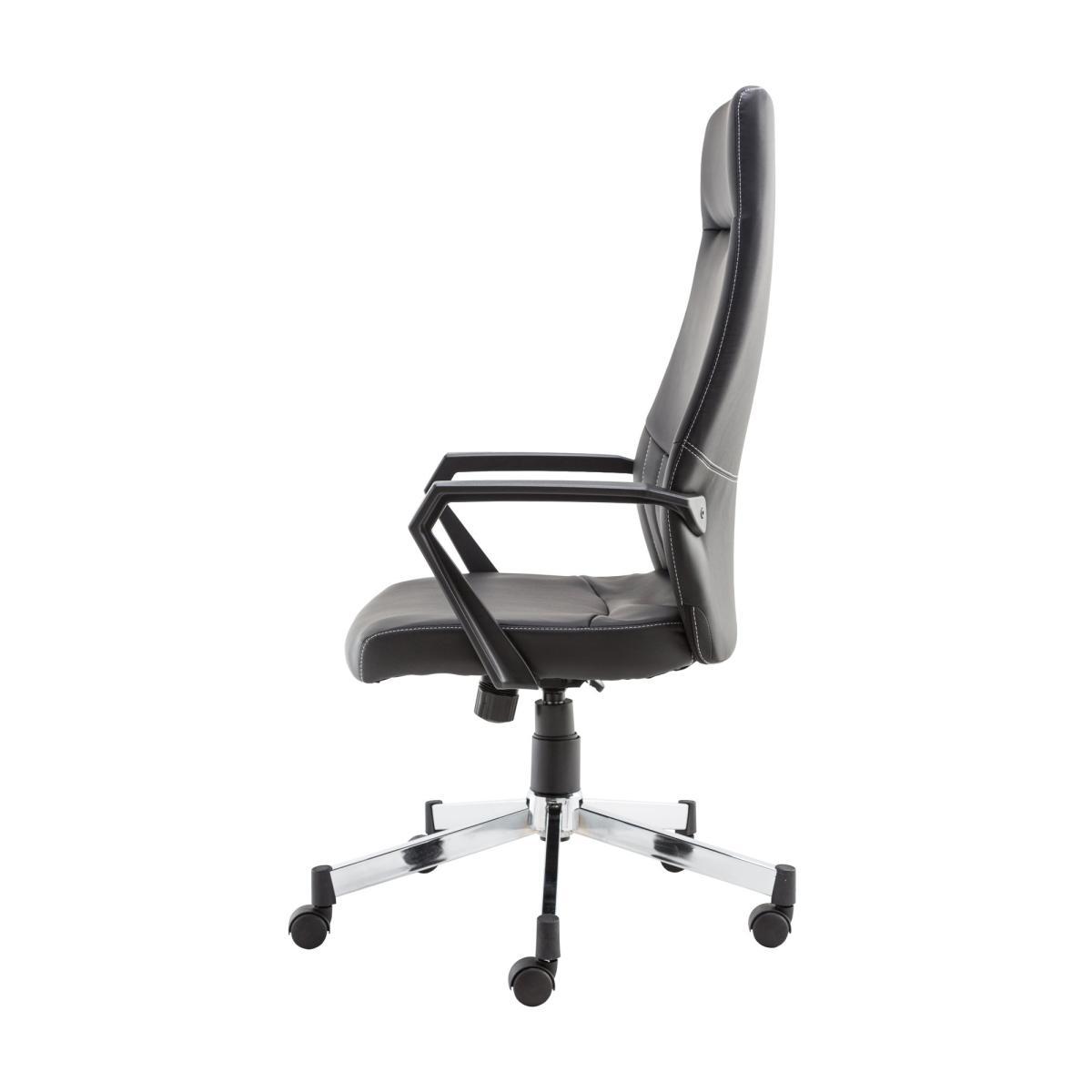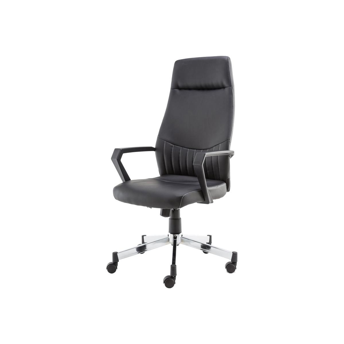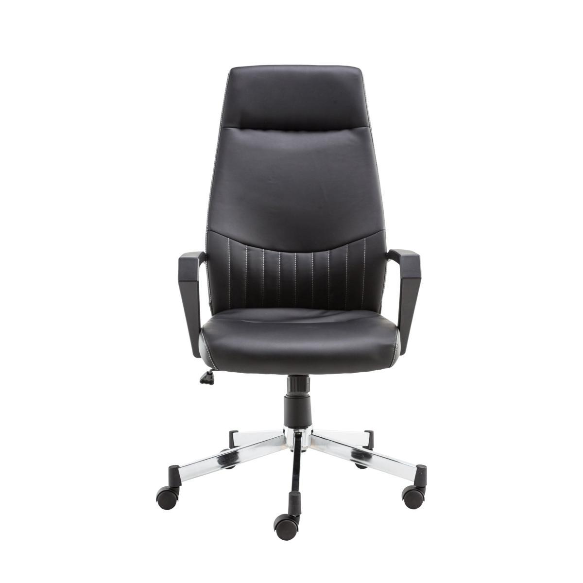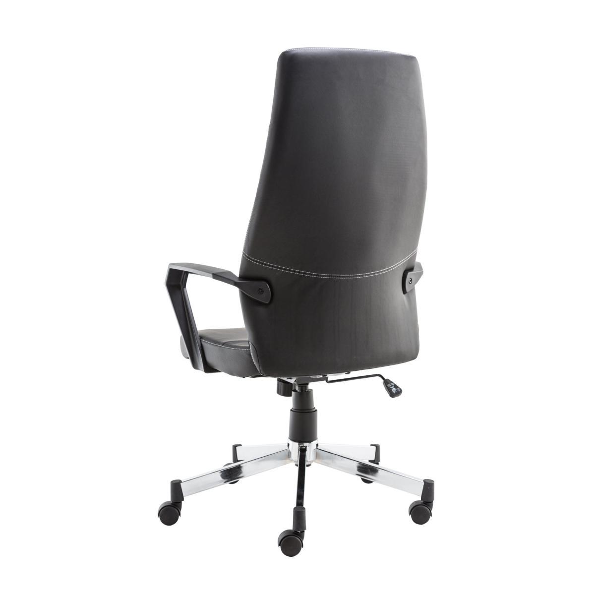 Designed with both style and comfort in mind, the Brooklyn high back office chair features a contemporary design boasting a mix of curved edges and striking angled legs and armrests. The ergonomically shaped back and headrests and foam padded seat are upholstered in a black faux leather with a gorgeous silver stitching detail, offering plenty of comfort and support. Finished off with a modern chrome base and a tilt mechanism with tension control, this self-assembly office chair would make a stunning addition to your home office. Please note, unfortunately we cannot deliver this item to Northern Ireland or the Channel Islands.