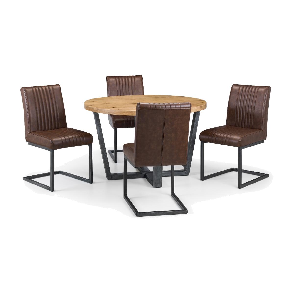 Made from solid oak, this round dining table offers a rustic finish emphasising the stunning natural wood grain. The Brooklyn Round Dining Table offers a vintage edge featuring industrial trestle style metal legs. This spacious table can seat up to 4 people, perfect for a wide range of modern decor. Part of the Julian Bowen Brooklyn Dining and Occasional Collection.