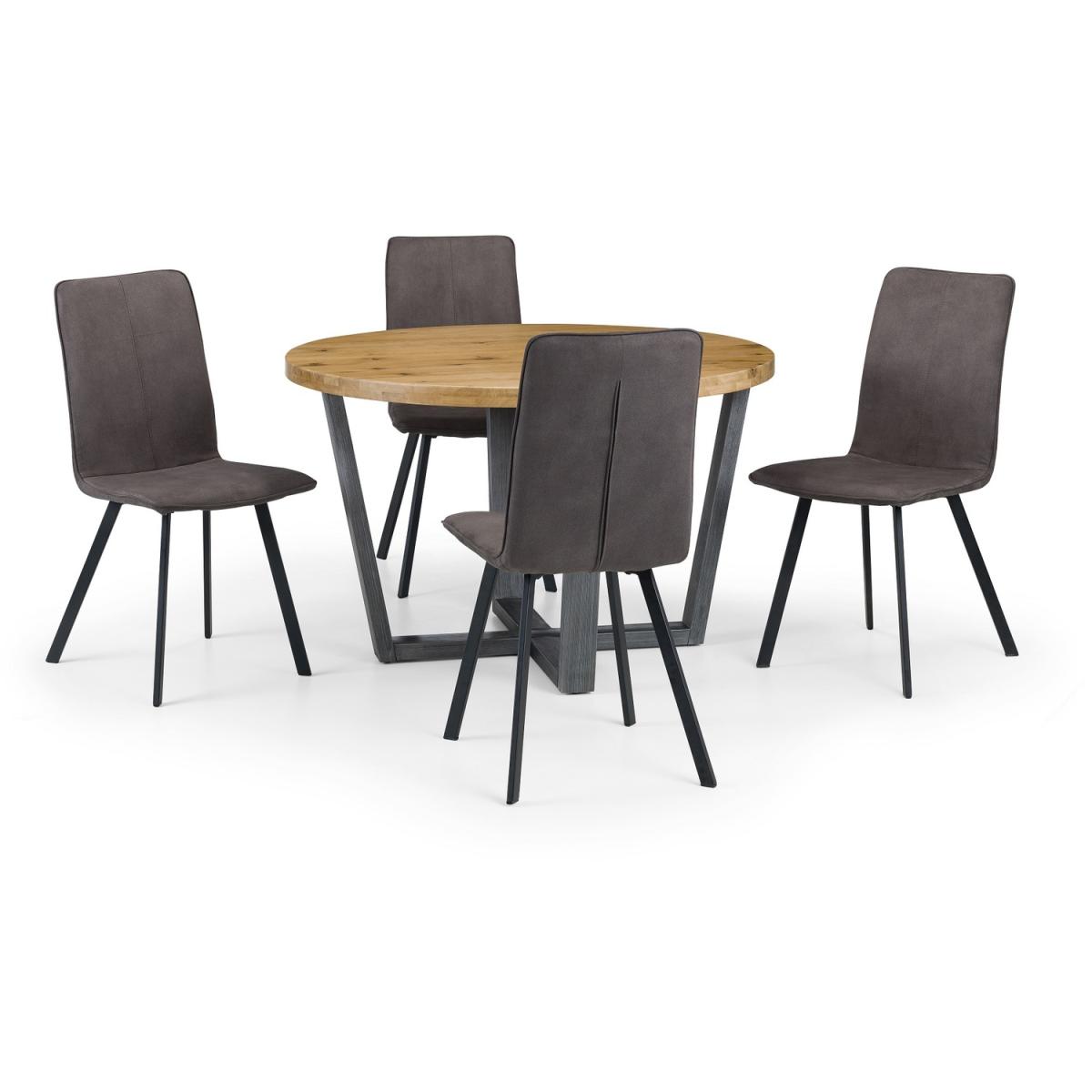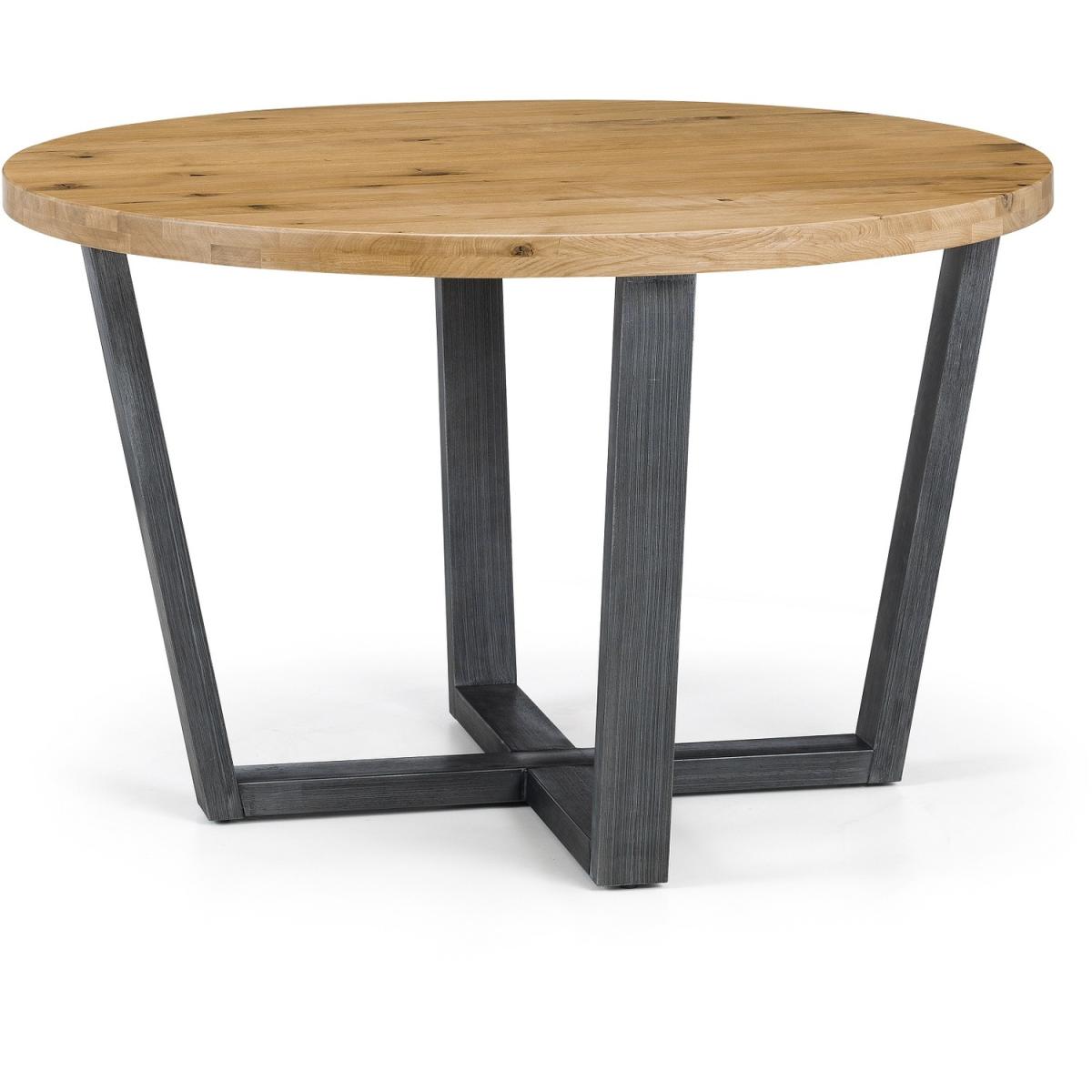 Made from solid oak, this round dining table offers a rustic finish emphasising the stunning natural wood grain. The Brooklyn Round Dining Table offers a vintage edge featuring industrial trestle style metal legs. This spacious table can seat up to 4 people, perfect for a wide range of modern decor. Part of the Julian Bowen Brooklyn Dining and Occasional Collection.