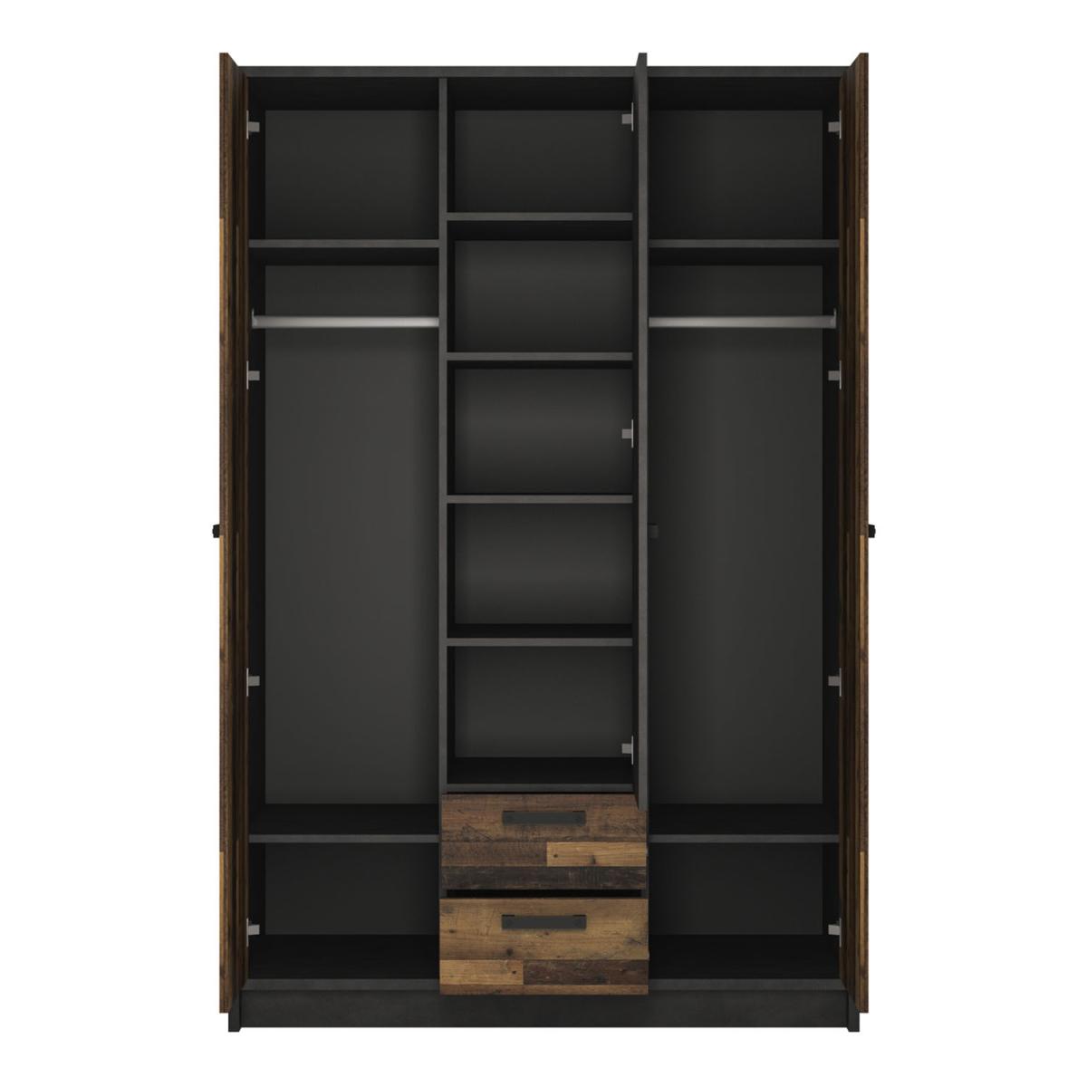 I’m a fan of the Brooklyn wardrobe because its mix of reclaimed-style timber panels and charcoal-grey finish adds character without feeling fussy. It suits industrial lofts or modern farmhouse bedrooms equally well and works just as nicely in a pared-back Scandi scheme where you want a touch of warmth. For styling, keep the top clear or add a couple of low-profile baskets to maintain clean lines. Inside, use slimline hangers and labelled storage boxes on the shelf to make the most of the deep compartments. Pair it with matte-black bedside tables or a woven rug in natural fibres to balance out the heavier look of the wood.