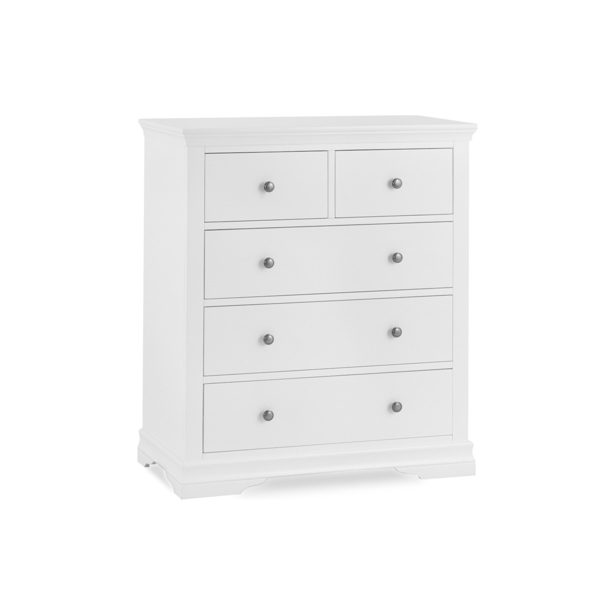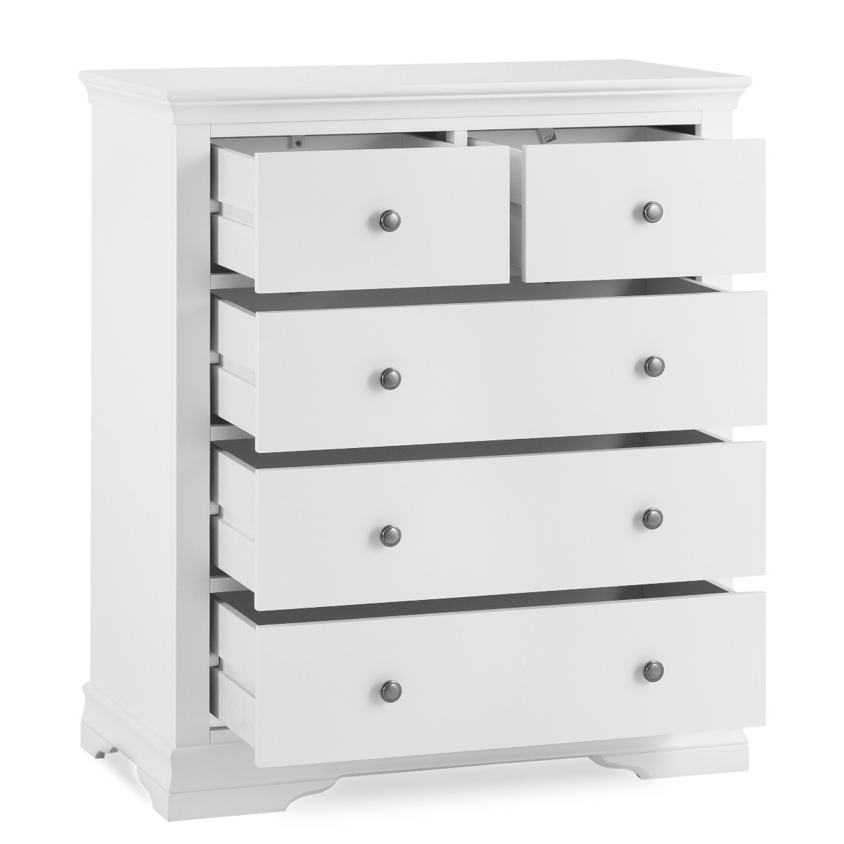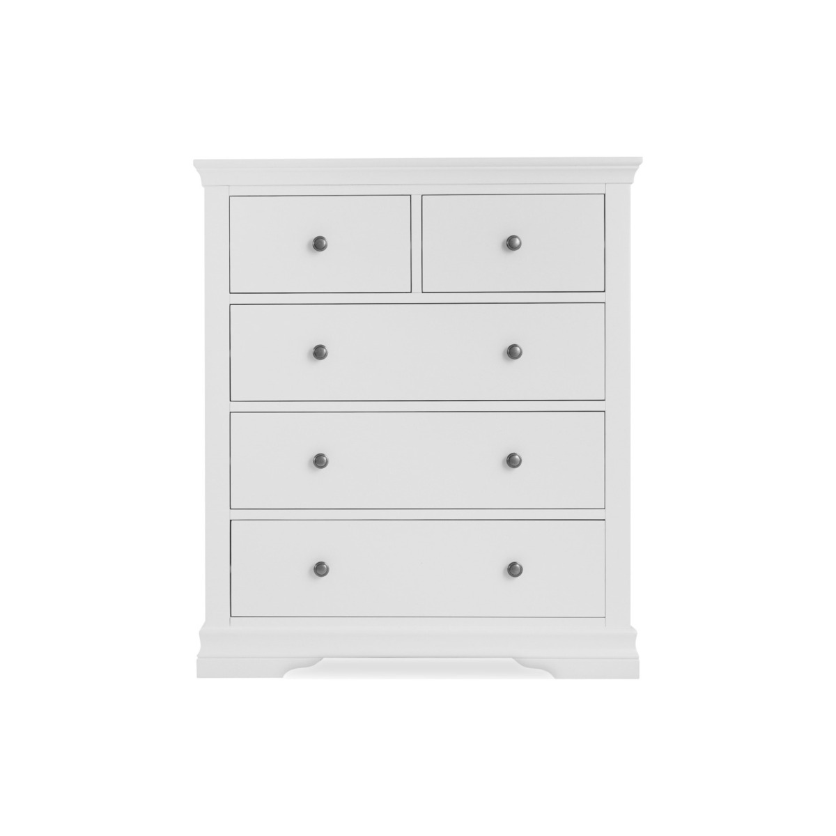 Brooklyn White 2 Over 3 Chest of Drawers brings timeless style to your bedroom setting. Featuring two small drawers over three large drawers, the stylish chest of drawers is a stunning bedroom storage solution. The chest of drawers is complete with pewter effect knobs. Stylish 2 over 3 chest of drawers Timeless white painted finish Pewter effect knobs complete the look Drawers on wooden guides Matching items from the range available