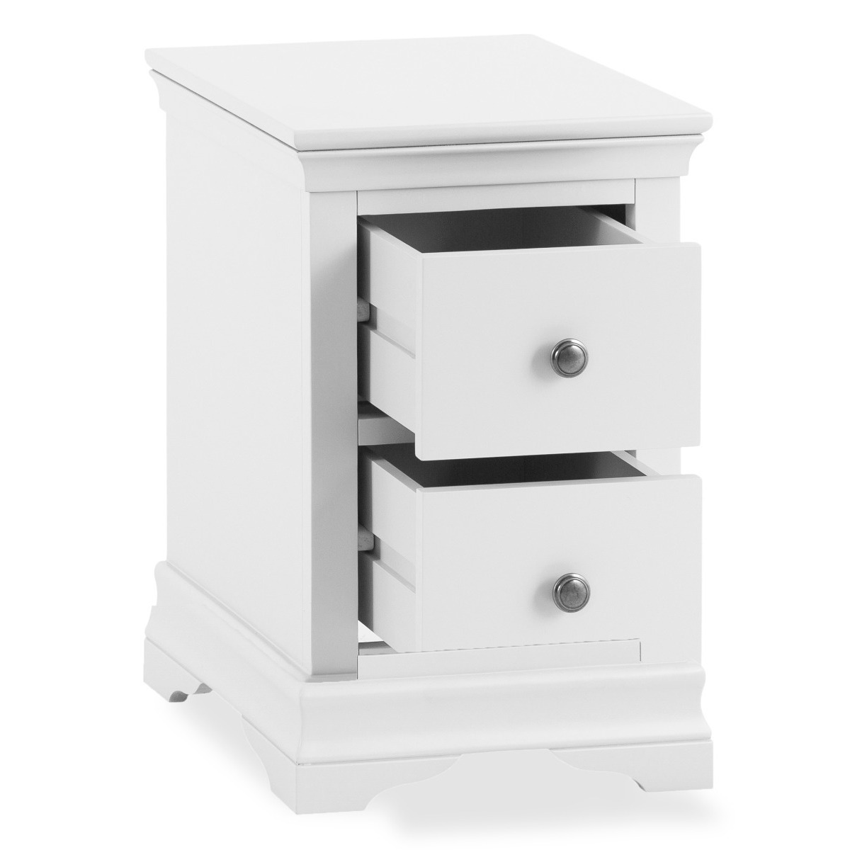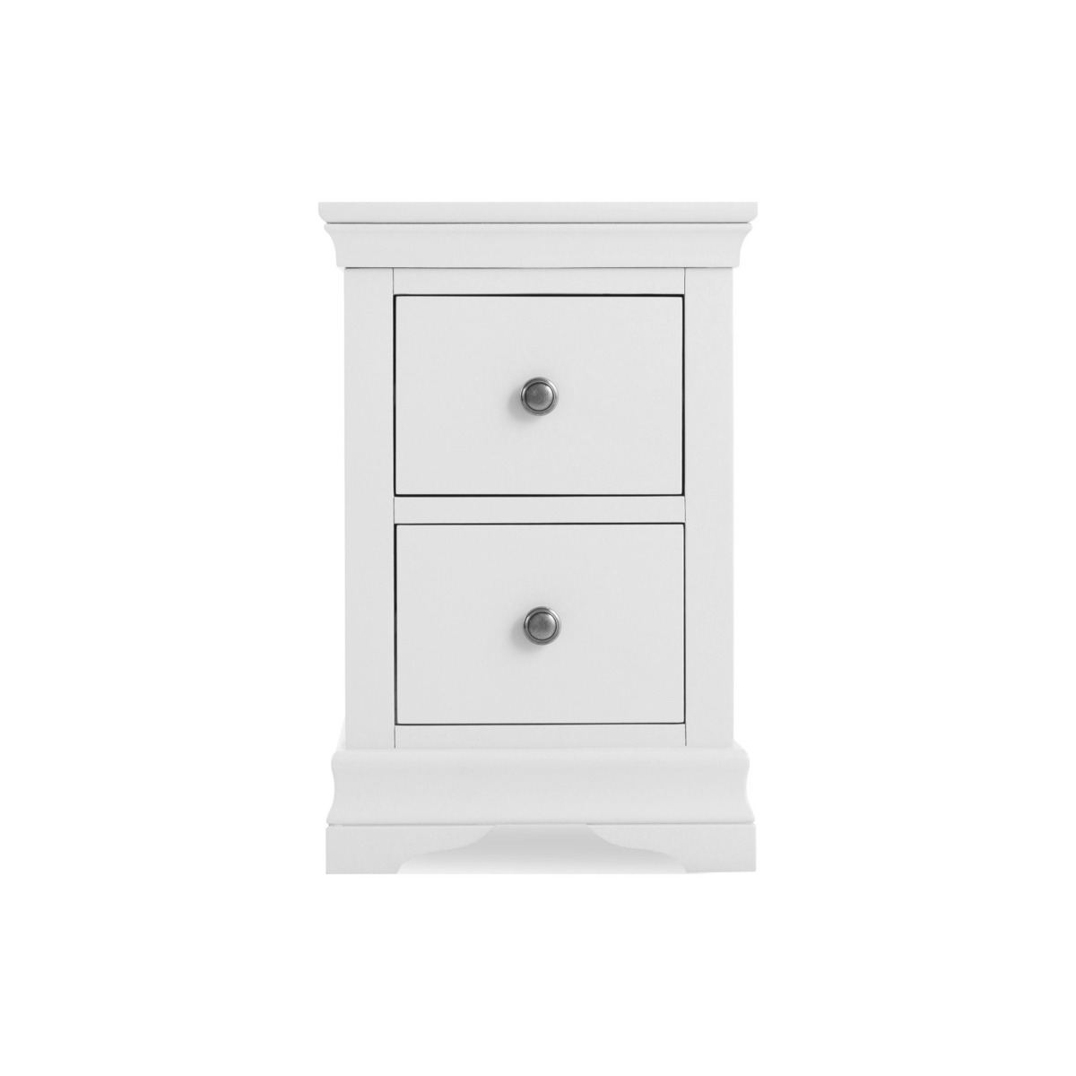 Practical and compact, the Brooklyn White Small Bedside Table is a stylish addition to your bedroom. Classically beautiful, the space saving bedside table features two handy drawers and is complete with a white painted finish. Classically stylish bedside table with storage White painted finish for a minimalist look that suits any décor Two drawers on wooden guides Pewter effect knobs complete the look Complements other items in the white bedroom furniture collection
