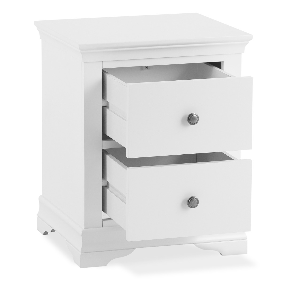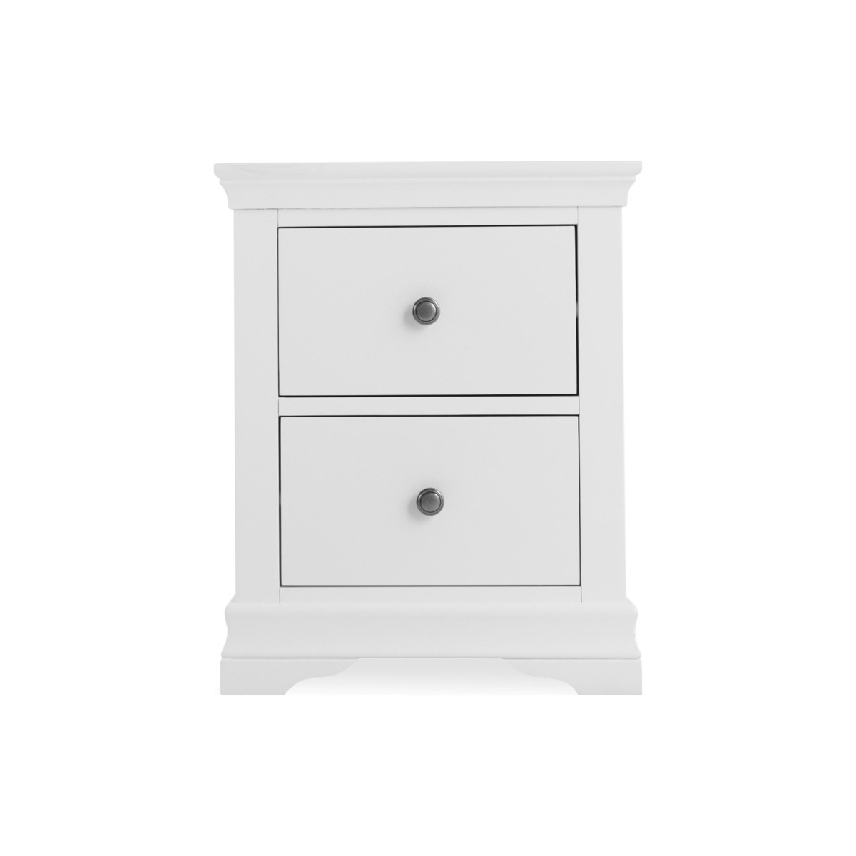 The Brooklyn White Large Bedside Table features a classic design to suit any bedroom. The large bedside table features a smooth white painted finish and is complete with two drawers with pewter effect knobs. Large bedside table with storage Natural white finish for a classic style that suits any bedroom Two drawers with wooden guides Pewter effect knobs complete the look Complements other items in the white bedroom furniture collection