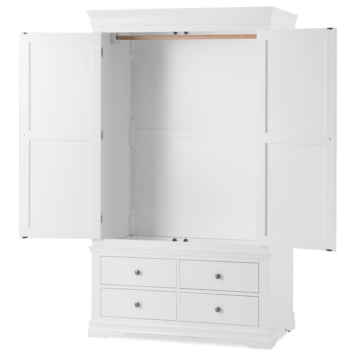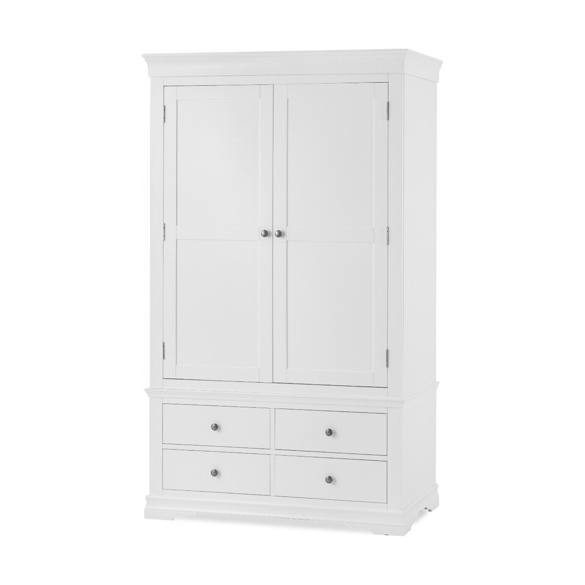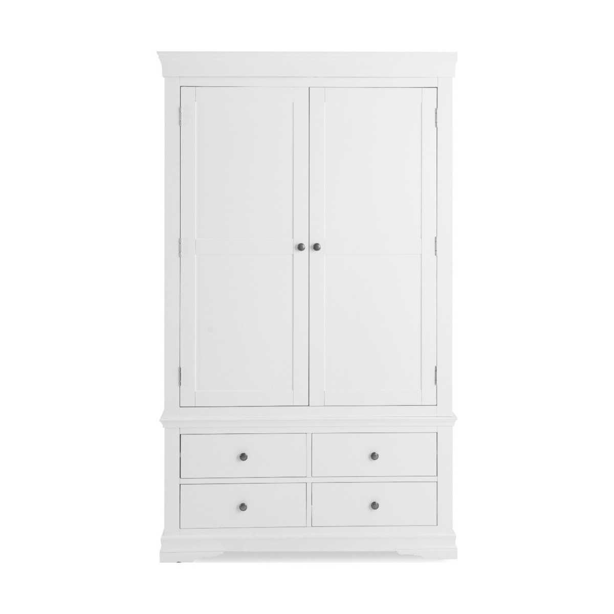 The Brooklyn White Two Door Four Drawer Wardrobe brings style and practicality to your bedroom. The large two-door wardrobe features a white painted finish and is complete with a hardwood hanging rail and additional storage in the form of four lower drawers. The white painted wardrobe is complete with pewter effect knobs. Large two door painted wardrobe White painted finish for a clean classic look Hardwood hanging rail provides optimal support Four lower drawers with wooden guides for additional storage Complete with pewter effect knobs Complements other items in the white bedroom furniture collection