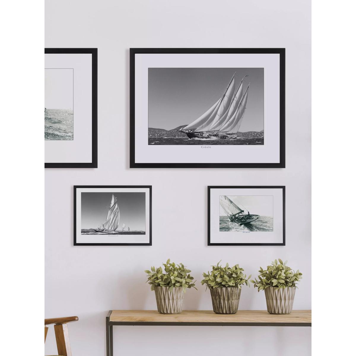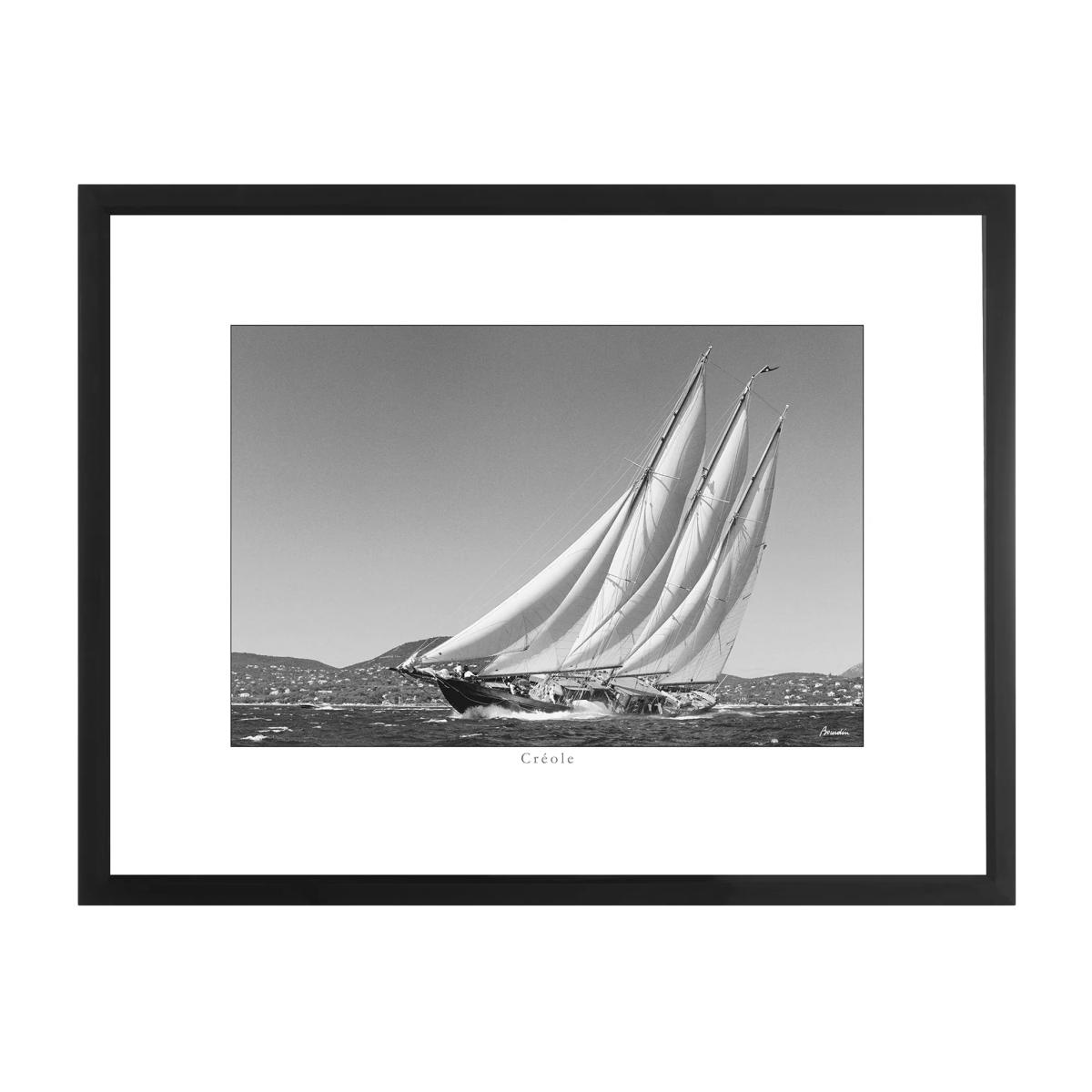 Black and white photograph of Créole, the world's largest wooden sailing yacht, launched in 1927. Made in the UK, the print is set within a white mountboard that beautifully frames the image. Printed on uncoated 250gsm premium paper to guarantee a glare-free finish. Displayed in a stylish black-gloss finish studio frame. Ready to hang on your wall. Have you thought about wall hooks and fittings?
