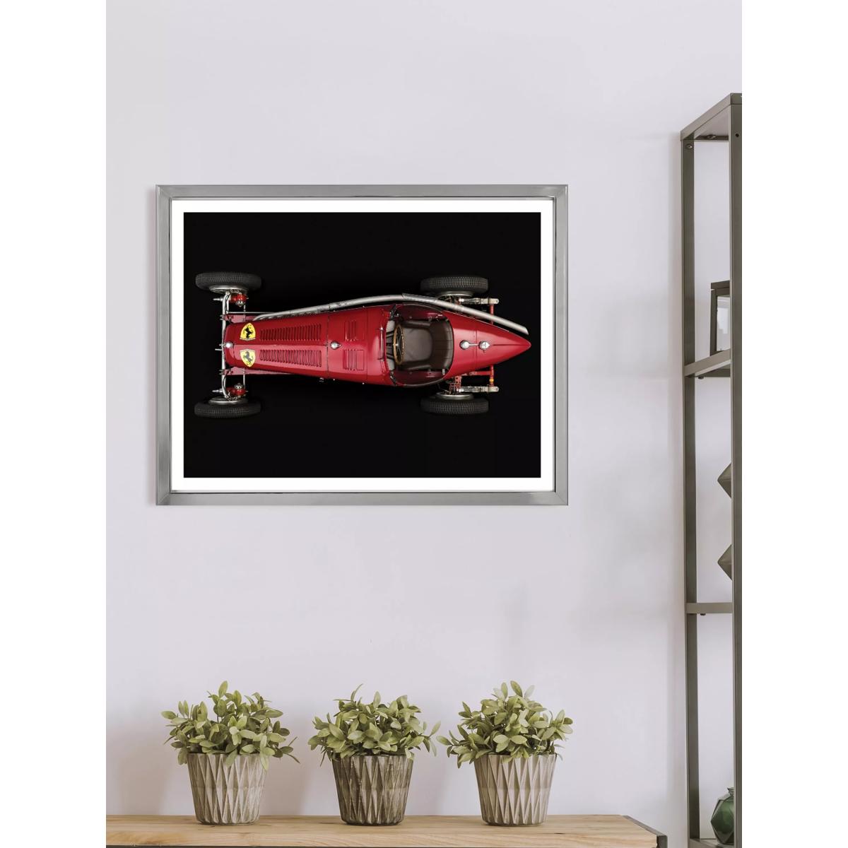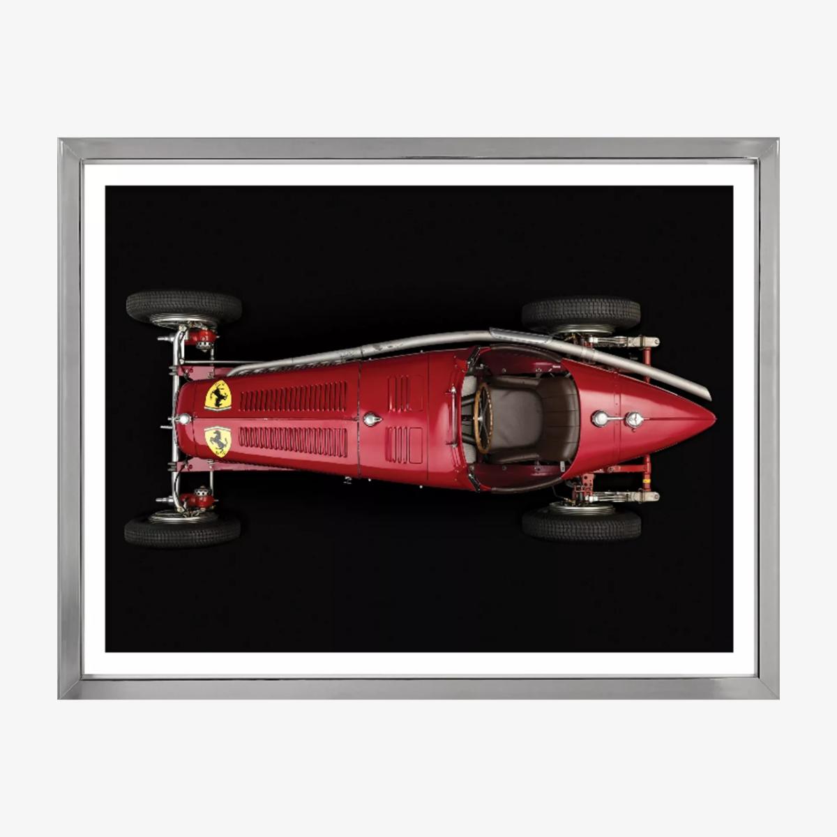 An aerial photograph of the Alfa Romeo P3 or Tipo B, considered to be the world's first genuine single-seat Grand Prix racing car. The Alfa Romeo P3 was raced by the Scuderia Ferrari team in its Grand Prix-winning year 1933. Made in the UK, the print is set within a white mountboard that beautifully frames the image. Printed in-house by Brookpace Lascelles on uncoated 250gsm premium paper to guarantee a glare-free finish. Displayed in a 5cm-deep, Italian-made, wood and chrome metal-covered Chelsea frame, ready to hang on your wall. Have you thought about wall hooks and fittings?