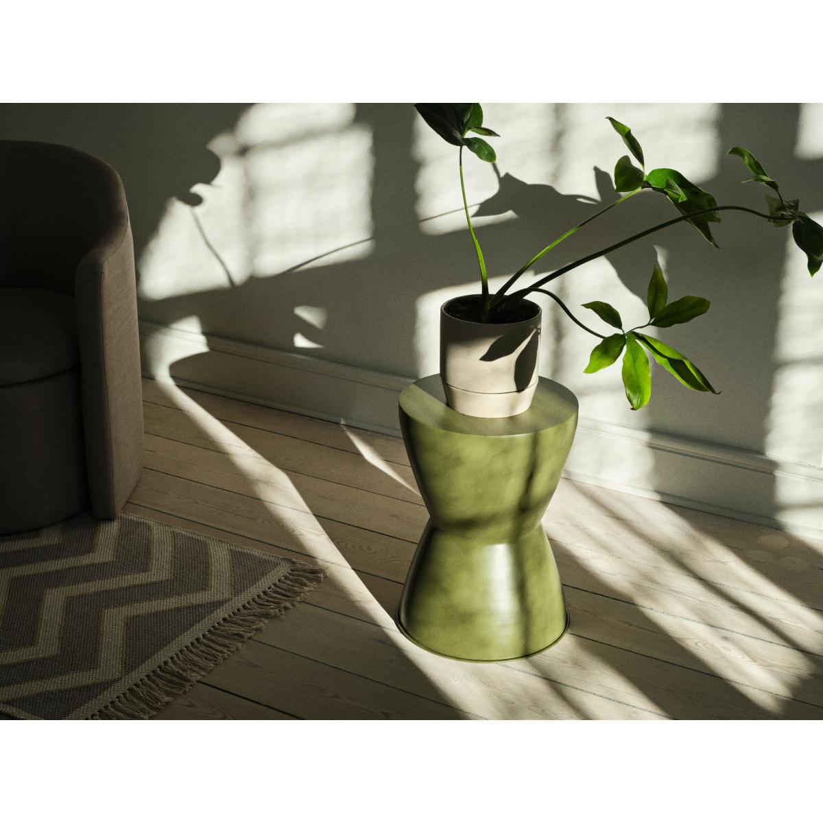 The Ebbe stool in army green is a versatile piece that adds a subtle pop of colour while maintaining a modern, minimalist aesthetic. I love its sculptural form, which makes it equally suitable as extra seating or a small side table in living rooms or bedrooms. Its compact size (Ø33x46 cm) makes it perfect for smaller spaces or as a functional accent in open-plan settings. I recommend pairing it with neutral or earthy interiors to let its colour and shape stand out, and it works well under a statement lamp or next to a cosy armchair. Practical styling tips include layering with textured cushions or placing it alongside other natural materials like wood or rattan for a warm, cohesive look.
