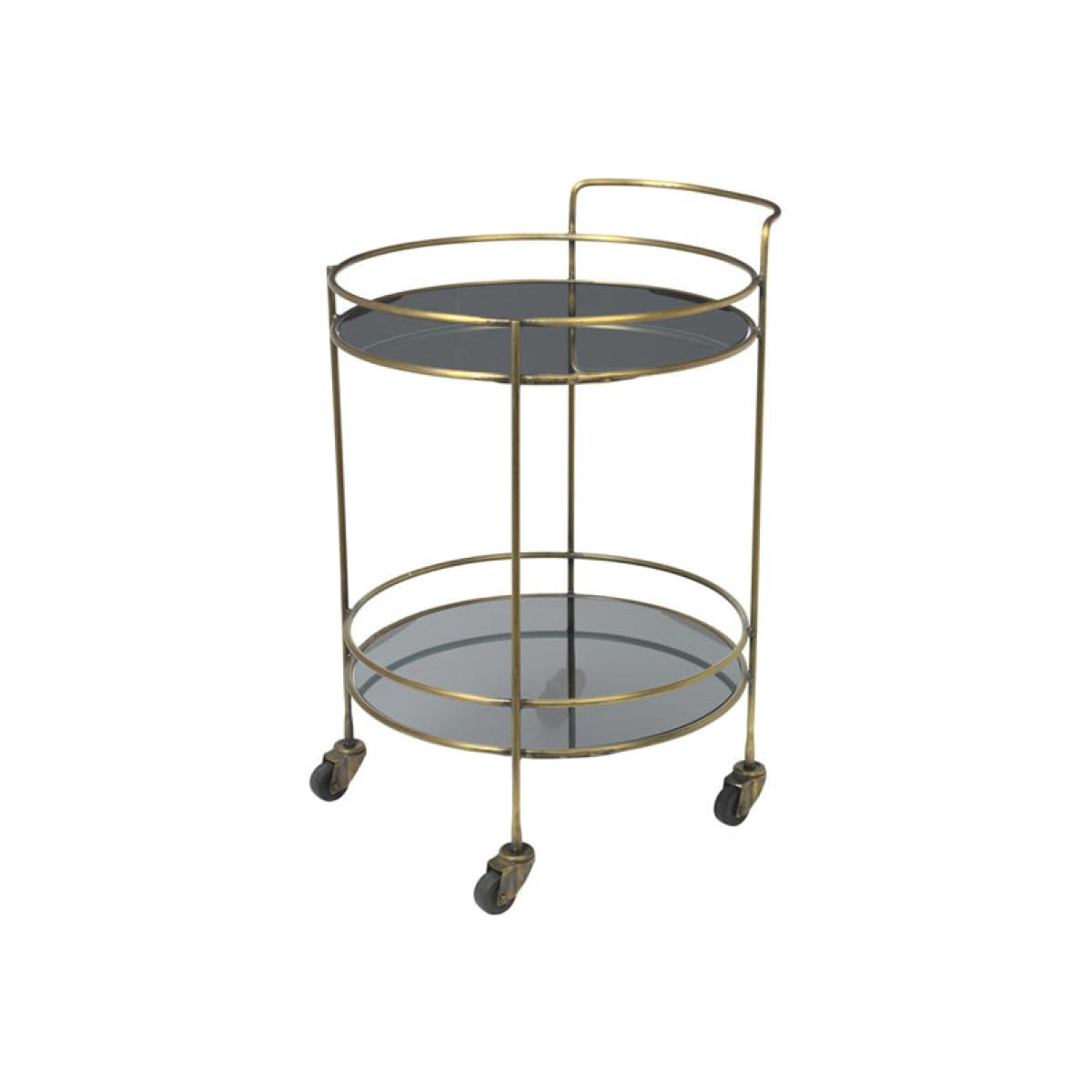 Be the perfect hostess with this stunning Roger antique brass drinks cabinet from. Broste. Copenhagen. Both stylish and practical, it is perfect for storing and serving your favourite drinks with its two circular smoky glass trays looking chic and elegant in the antique brass frame. Set on four small wheels and with a small brass push-along handle, you can easily steer this through your home or garden to serve drinks to your guests or enjoy choosing a favourite tipple for yourself. With dimensions of 56cm in diameter and 76cm in height, the double shelves provide lots of storage while still being a nice compact size. *Moot Trading Ltd is not a lender and acts only as an introducer. The credit product is provided by Klarna Bank AB (publ). Credit is only available to permanent UK residents aged 18 and over, subject to status. Terms and conditions apply. Please note that the following products are not regulated by the FCA: Pay in 30 days and Pay in 3 instalments. Read More.