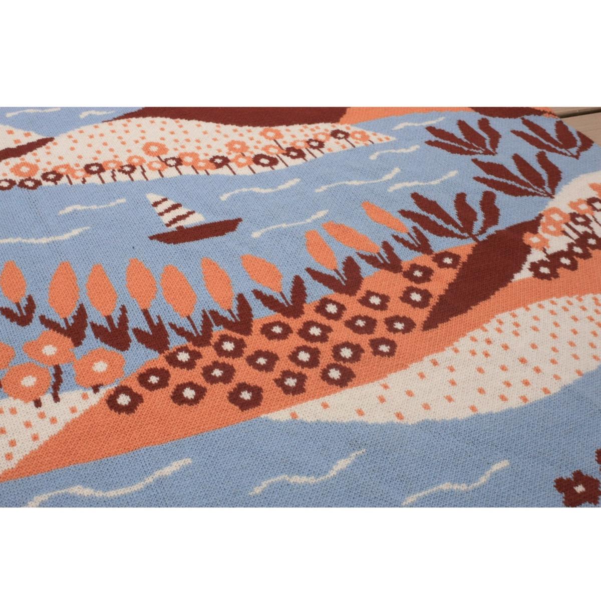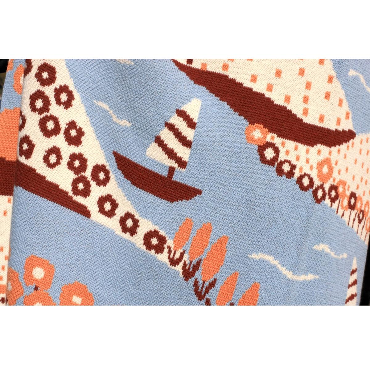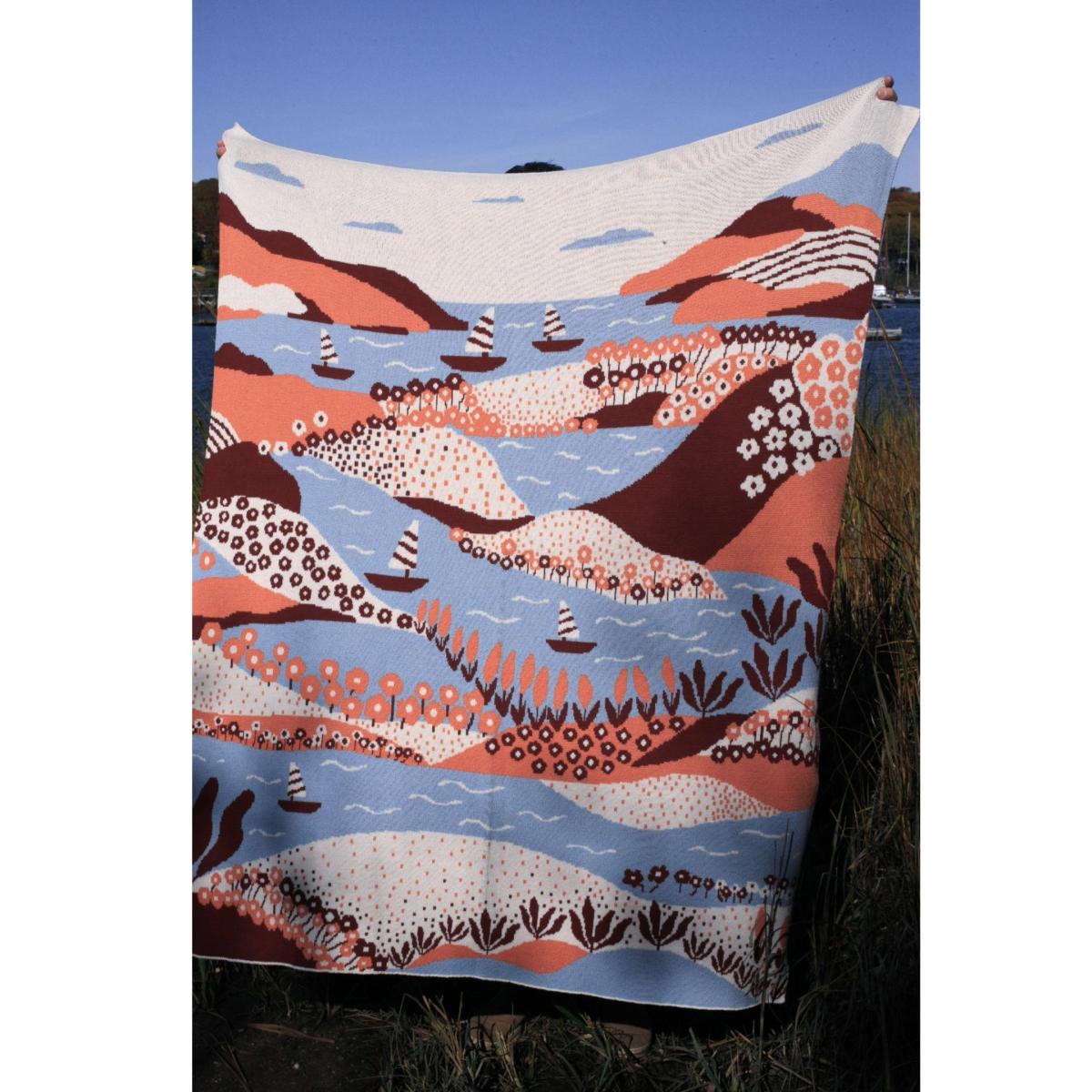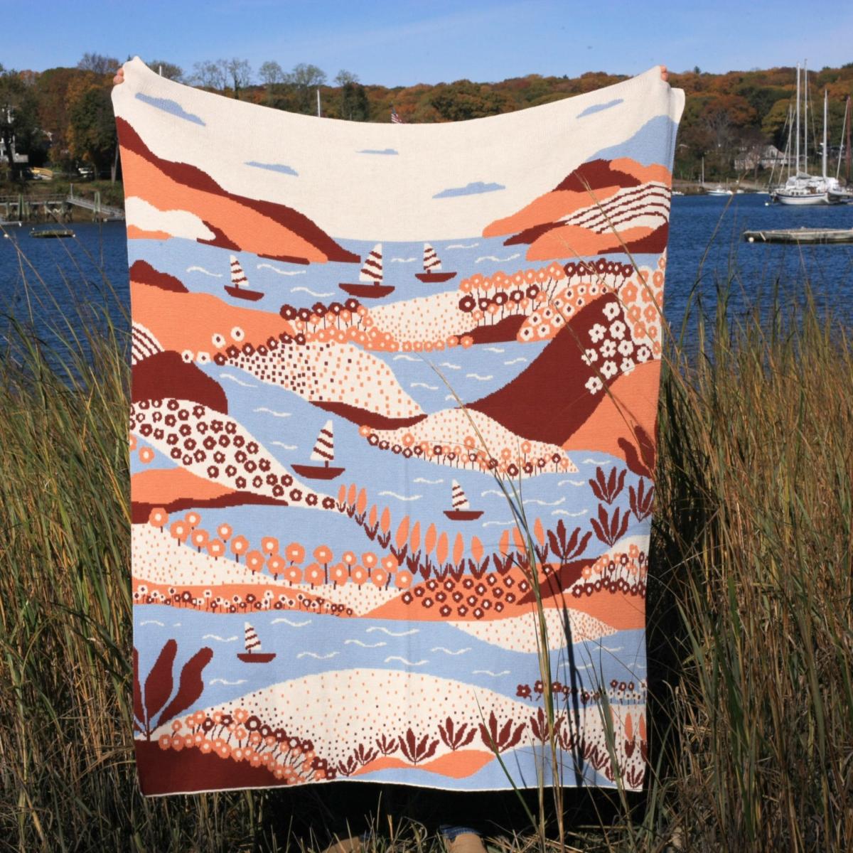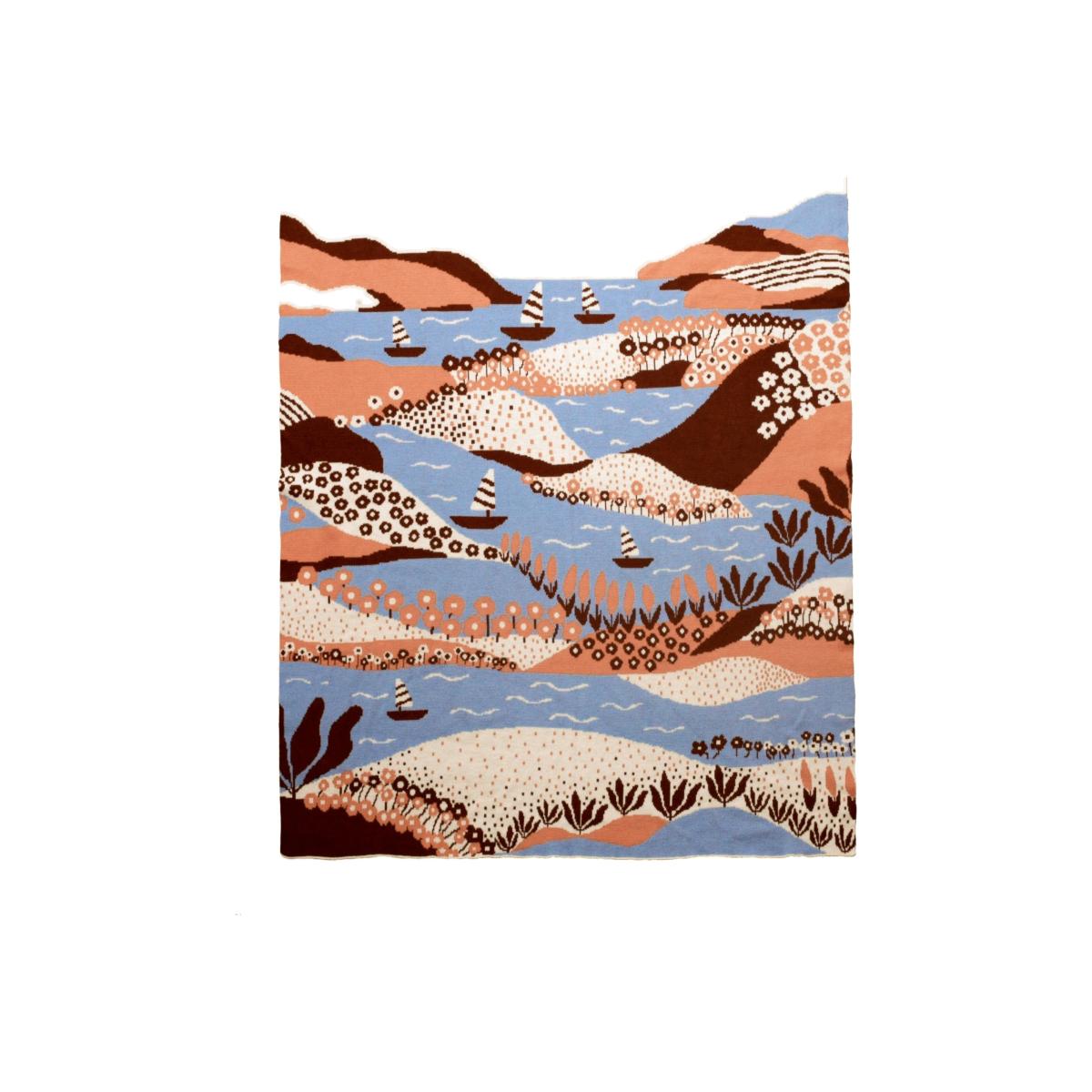 "Summer" is inspired by the seaside in the late afternoon, where the sunset casts a warm hue over the coastline. The imagery features sailboats against the backdrop of seaside hills. Jessie Zhao's knit blankets are crafted with pride in the New York using 100% Extra Fine Italian Merino Wool. The luxurious, machine-washable blankets are knitted with 100% Italian Merino Wool, ensuring both quality and comfort.