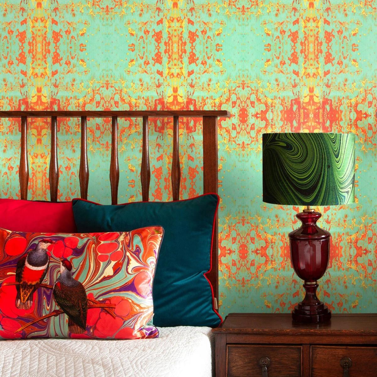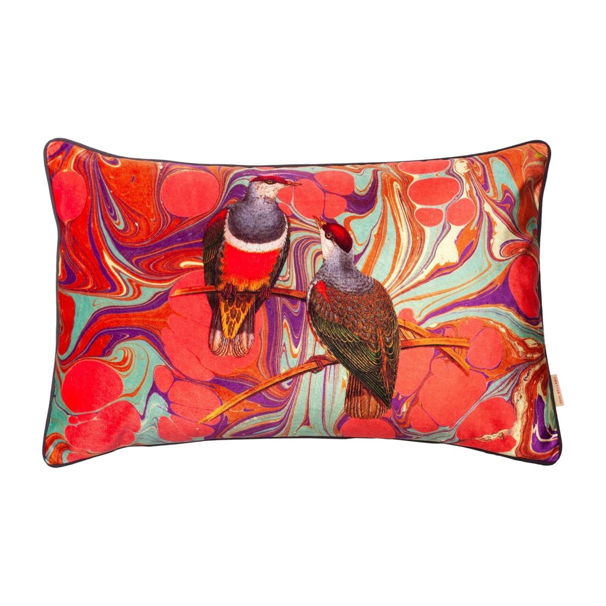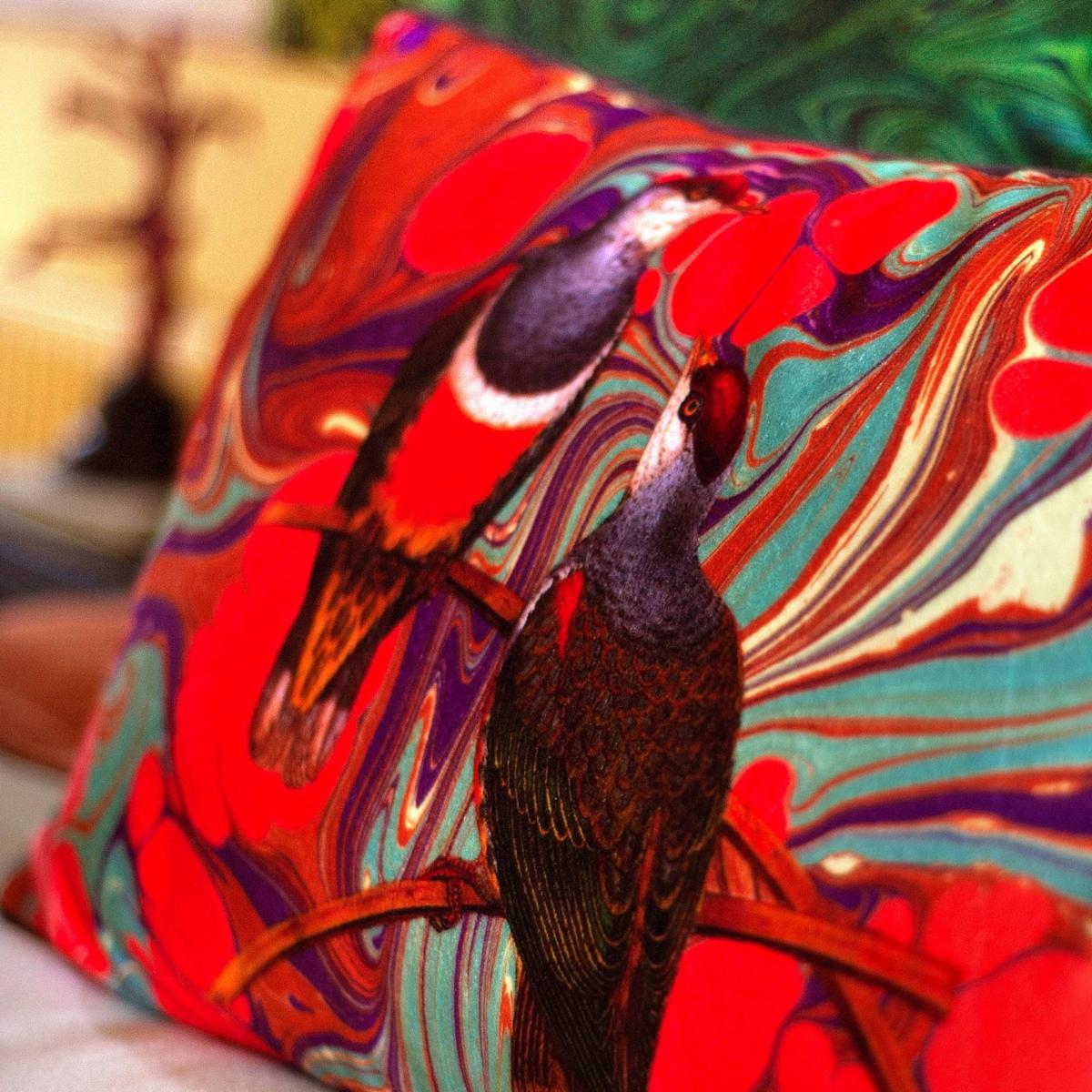 This fun and colourful centrepiece velvet cushion features a bird motif set against a swirling marbled design. They work beautifully for the ultimate in bed styling set against our velvet plains. This cushion has a pine coloured cotton backing and eggplant piping Striving for sustainability and keeping our carbon footprint to a minimum, our cushions are printed in the UK and made by our local artisan makers before being packed up in recycled and recyclable packaging. The inserted cushion pads are made in Norfolk and their duck feathers are ethically and sustainably sourced.