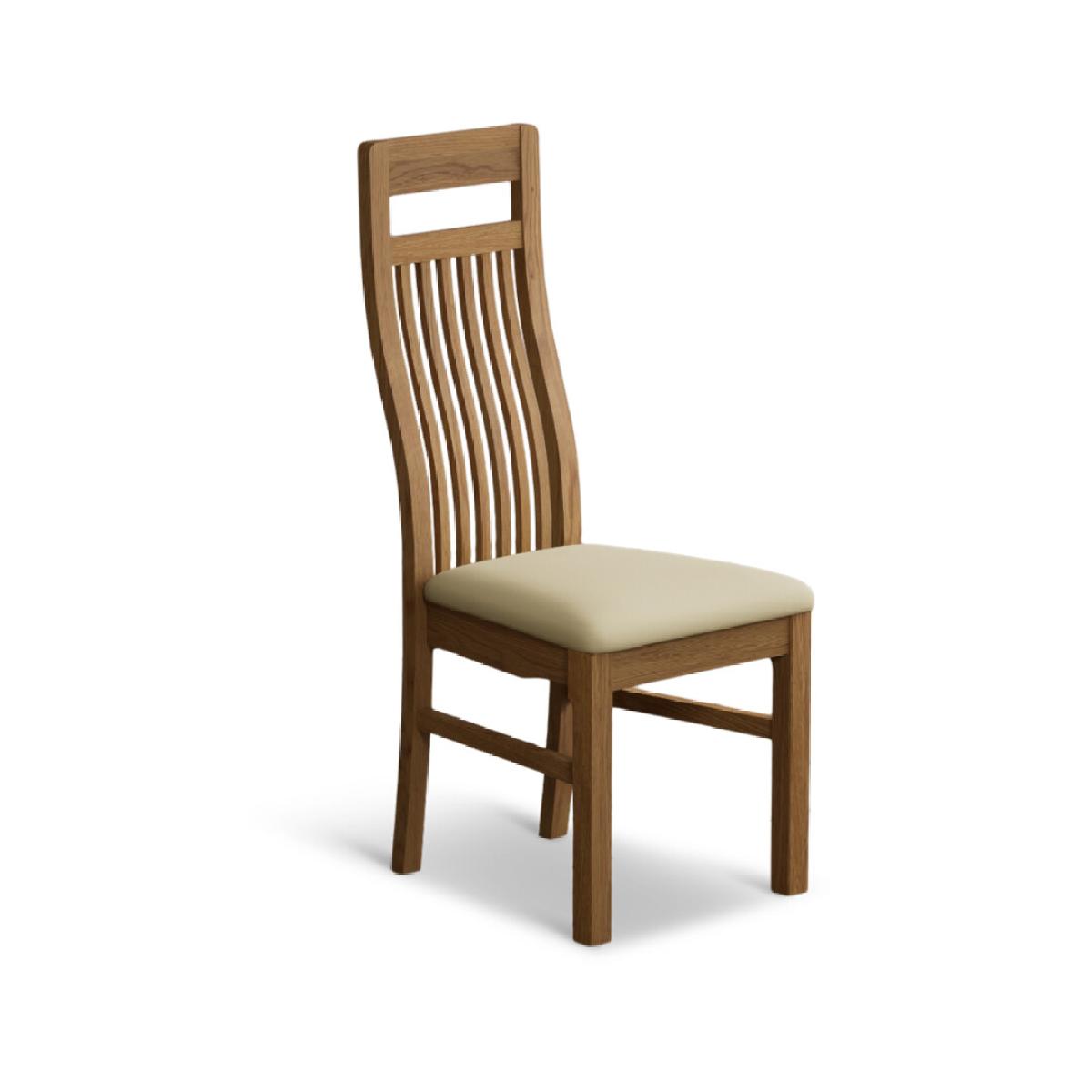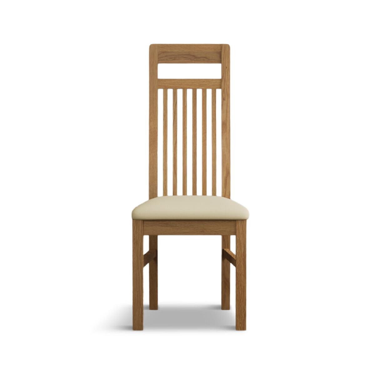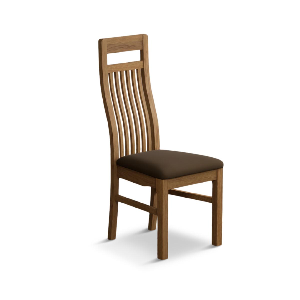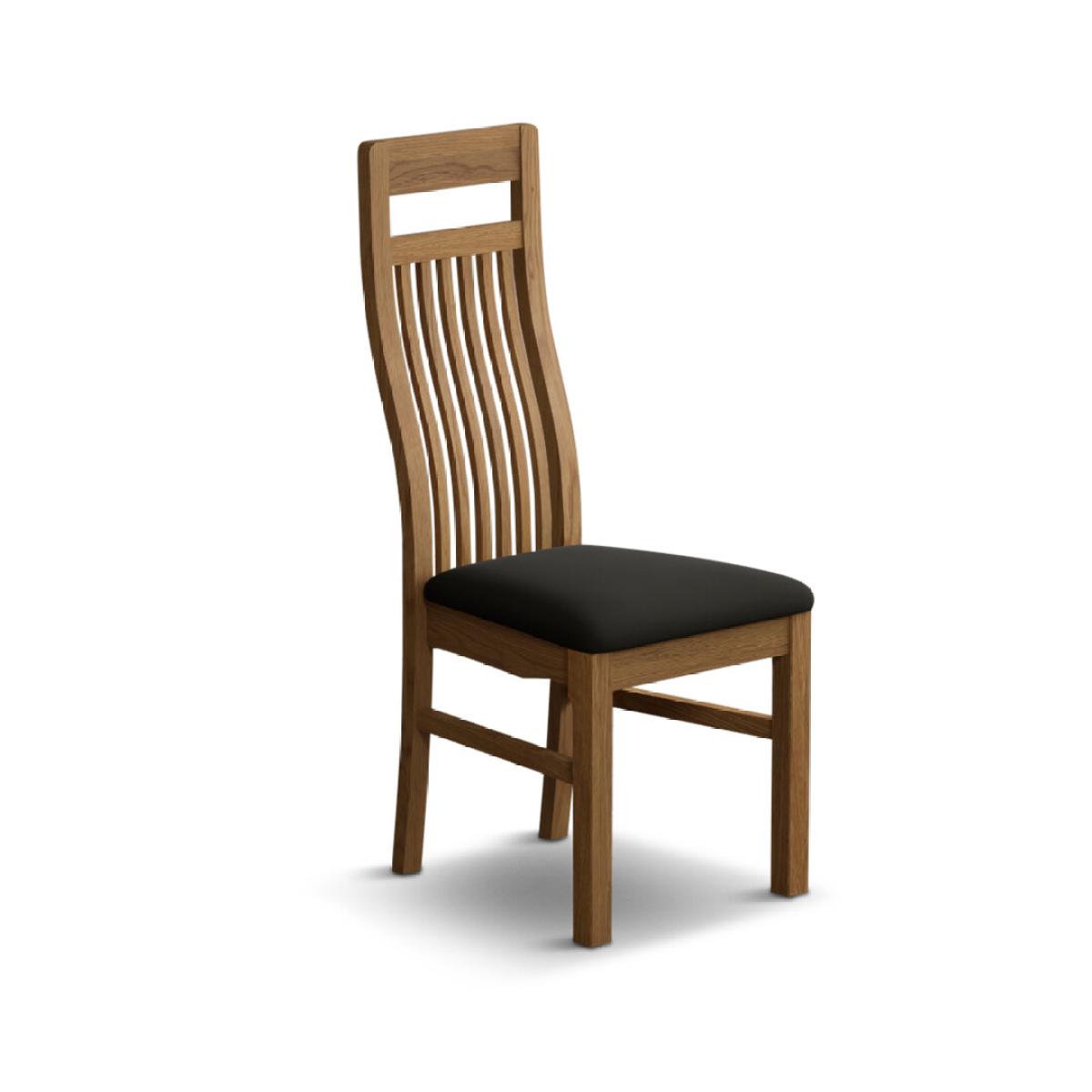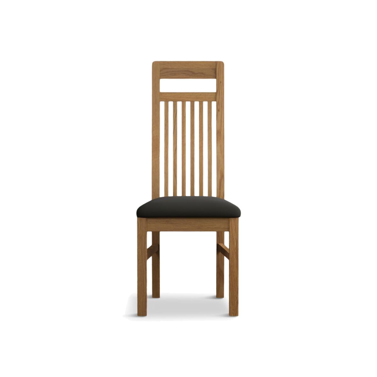 Monroe Solid Oak Dining Chairs with Faux Leather Seat Pad are 100% solid oak dining chairs with slatted backrests and faux leather seats.