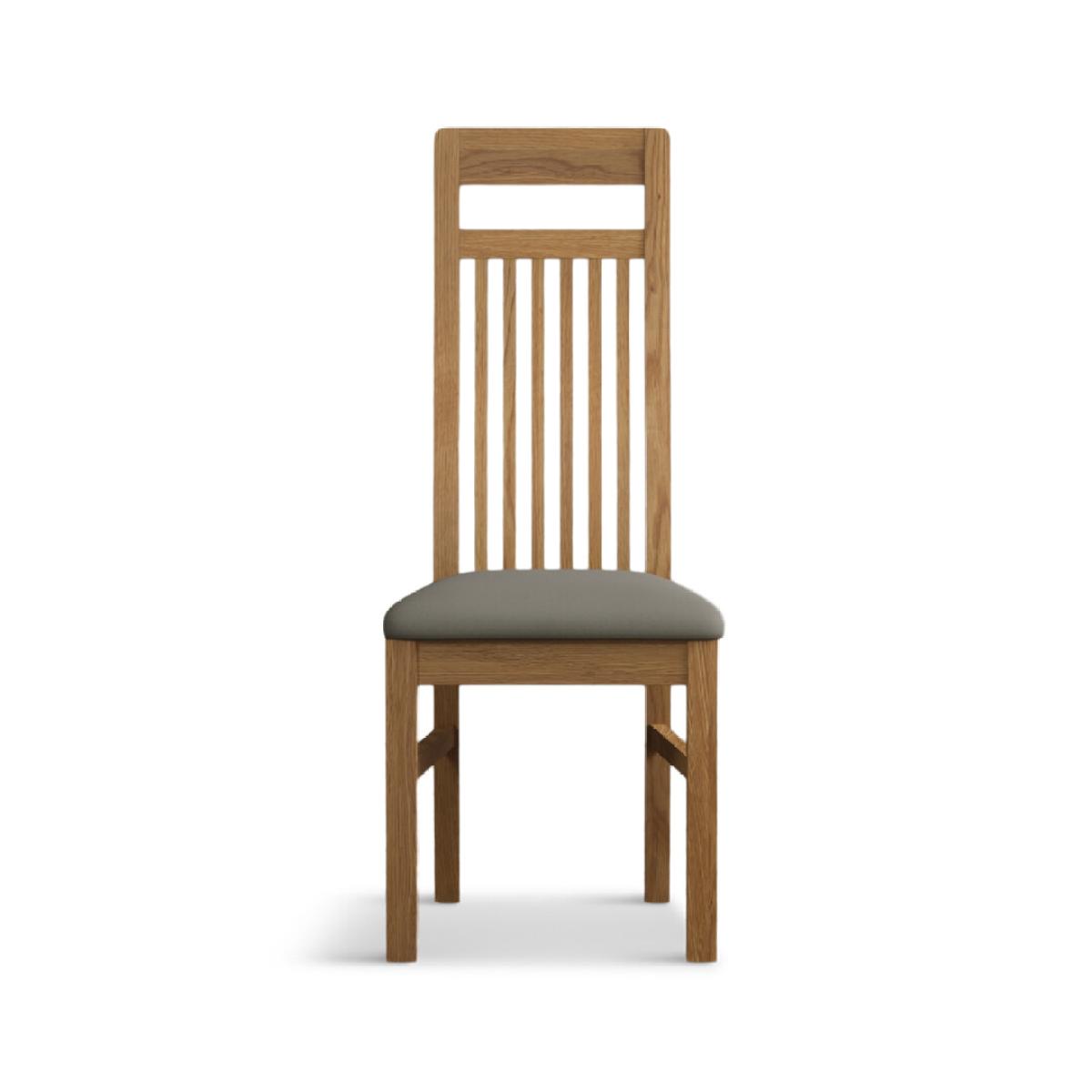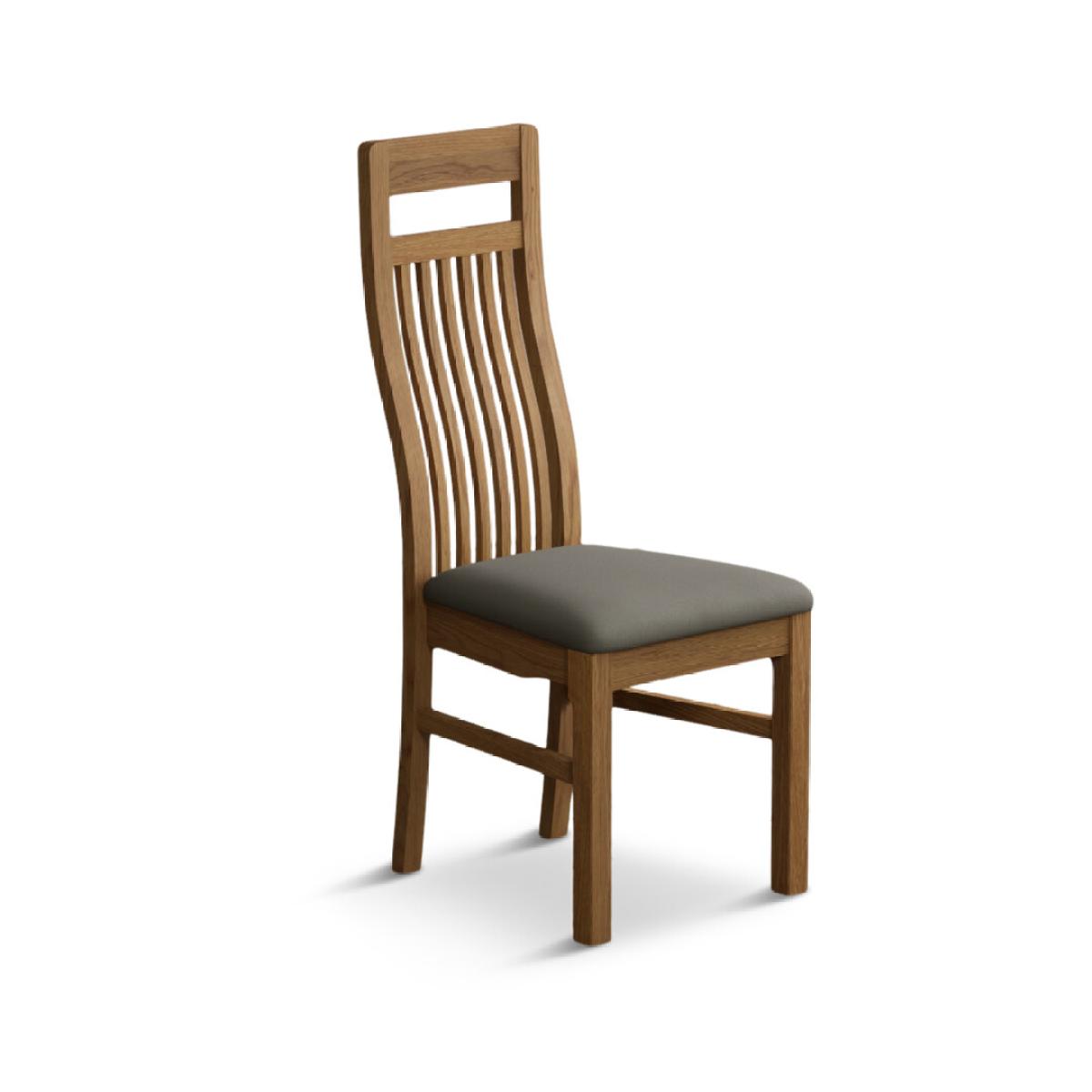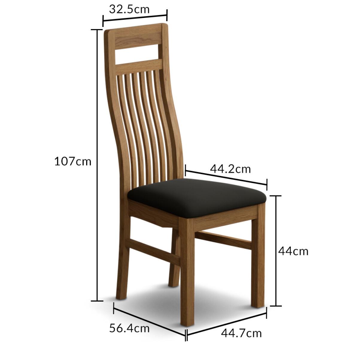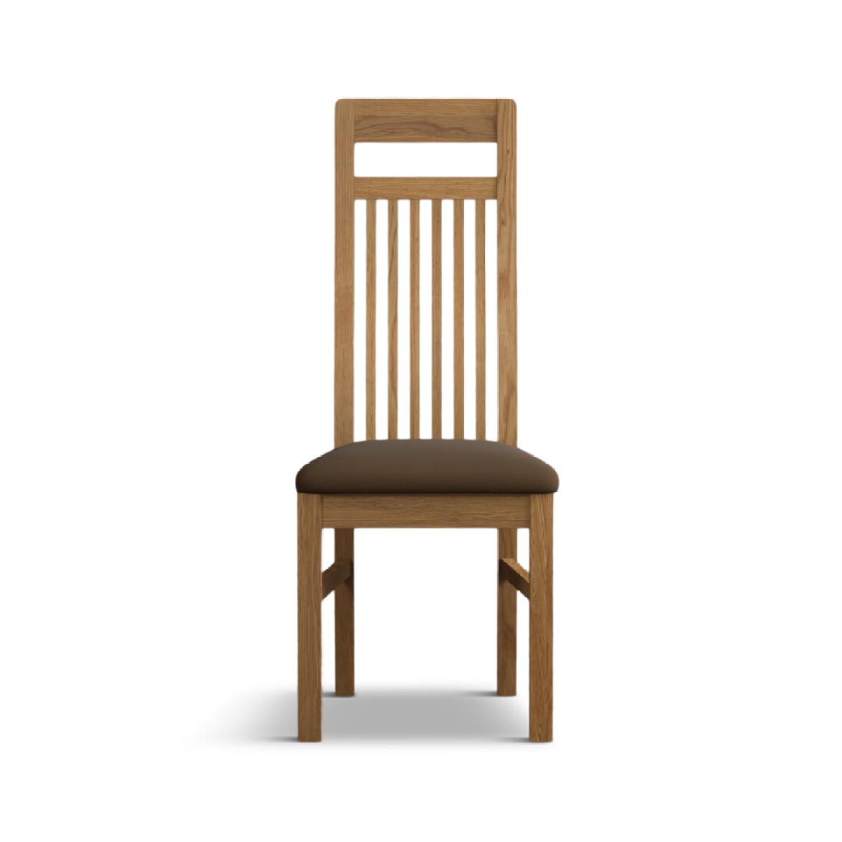 Monroe Solid Oak Dining Chairs with Faux Leather Seat Pad are 100% solid oak dining chairs with slatted backrests and faux leather seats.