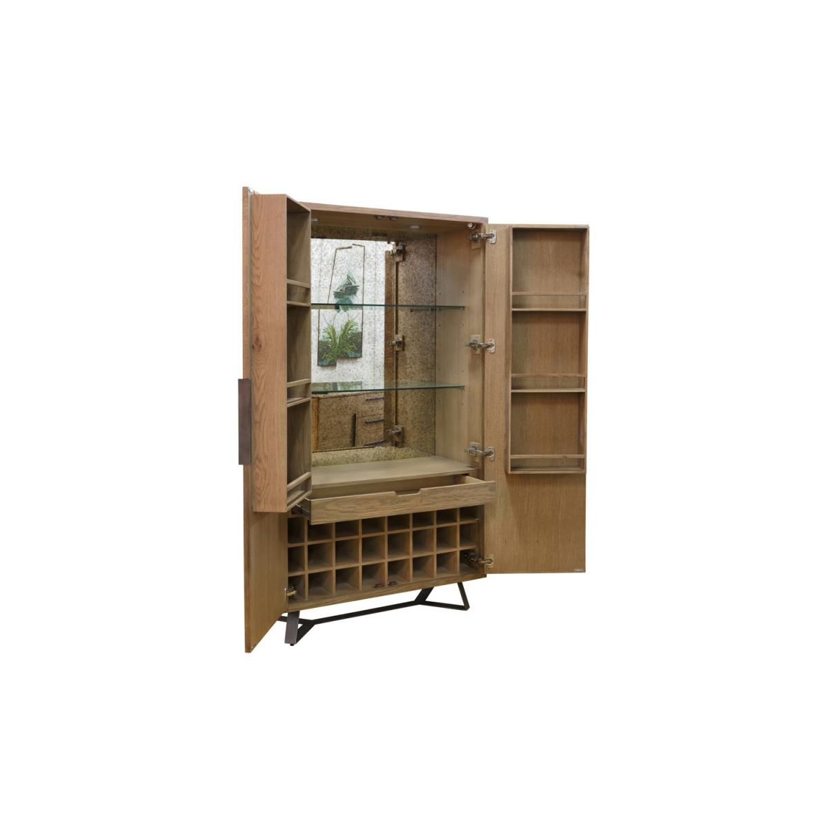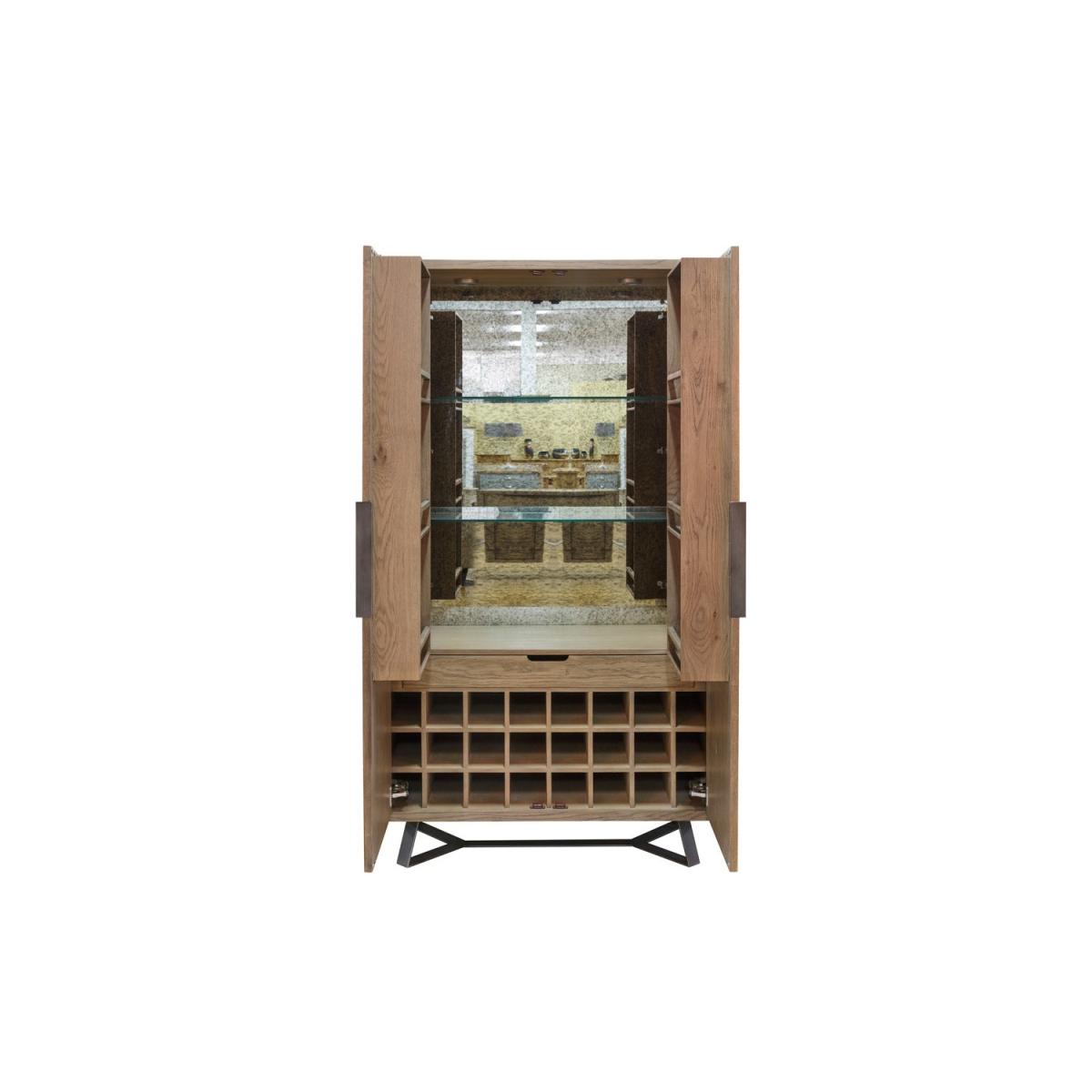 Dimensions:W100 x D45 x H184 cm This industrial drinks cabinet will make a unique and stylish addition to your dining space. It has a sharp, minimal design. The angular legs are finished in a light gun metal grey which brings the traditional and modern together for an stylish look. Features: Soft close doors Aged oakfinish Antiqued mirror with adjustable glass shelves Automatic LED down lights Holds 22 bottles in wine rack Assembly required