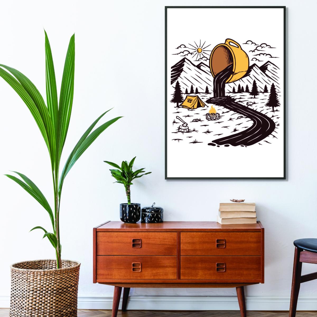 I really like the brown coffee print; its playful yet rustic vibe makes it a versatile addition to many interiors. It works particularly well in casual living rooms, home offices, or kitchens where a touch of personality is welcome. The colour palette keeps it grounded and easy to pair with warm woods or neutral tones, but it can also add a bit of humour to monochrome or minimalist schemes. For styling, consider placing it in a narrow gallery wall or on a mantle with other quirky prints or personal items. Because of its small size, it’s a great piece to add visual interest without overwhelming a space - perfect for smaller areas or layered with larger artworks for a curated look.