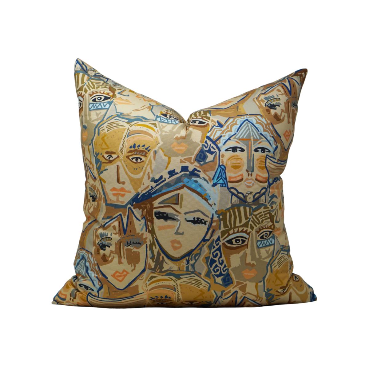 Empress, she chooses to be happy or at least she tries. Decide for yourself what you think her mood is today. One thing is for sure, she comes with a delicious blend of warm tonal browns and pops of blue hues. - 22" Pillow Cover - 100% Cotton - Cover Only - Knife Edge - Heavy Duty Brass Zipper - Pattern Placement Will Vary Spot Clean Only