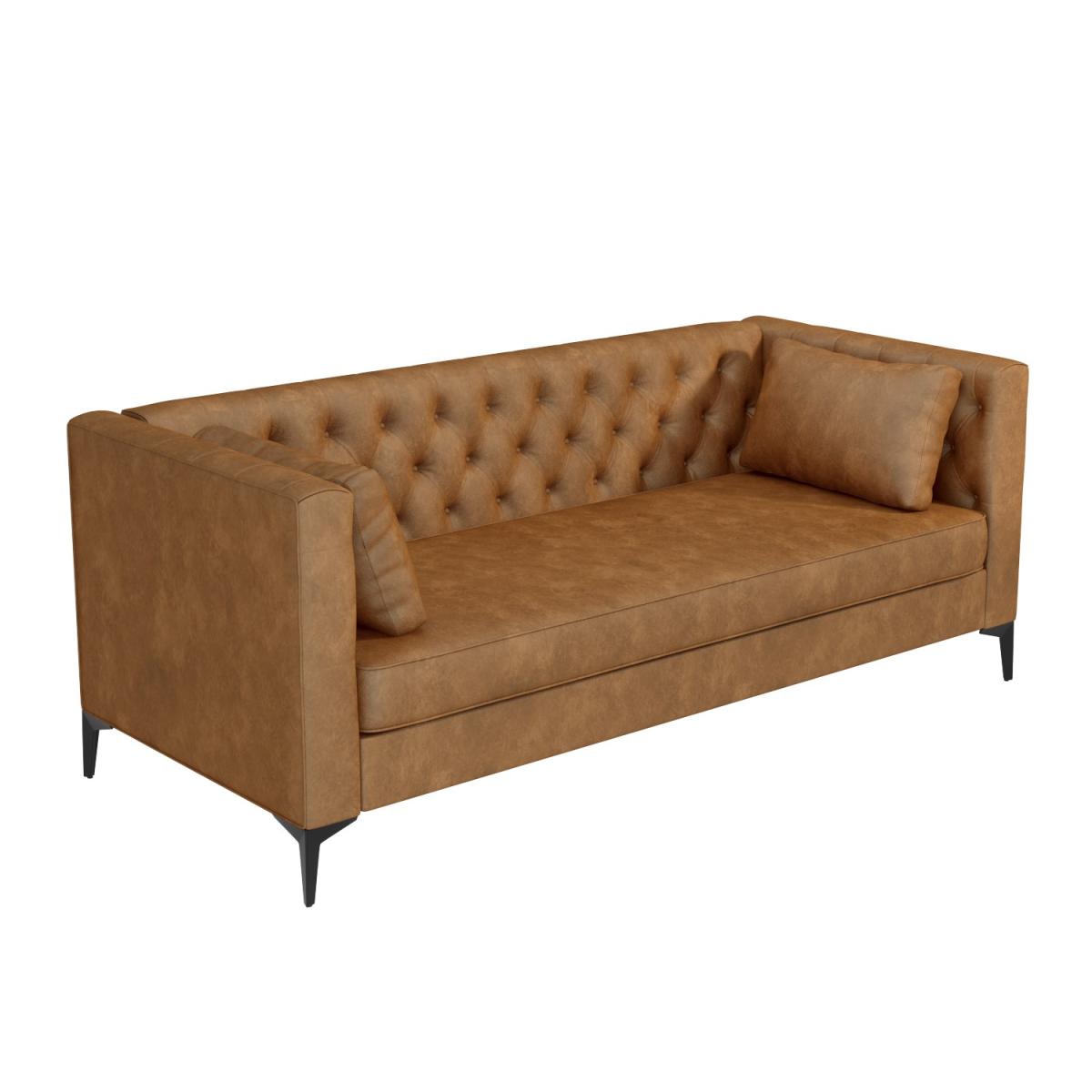 Foam filled Scatter Cushions Included Features we love Mid-century inspired design with a modern update Upholstered in tan PU leather Deep button detailing and tailored piping incorporates a hint of traditional styling Tapered black metal legs are a wonderful contrast, keeping the design fresh Delivered in 3 boxes, making it easier to get into your home The 2 decorative cushions on the image, are included with the sofa All about me Inspired by mid-century design, this gorgeous Luthor sofa offers clean lines to its bold silhouette. It'll easily coordinate with other furnishings and décor. The diamond tufted detailing created by its quilted button back adds just the right amount of opulence. Comfortably seating two to three people, there's plenty of room to snuggle, thanks to its deep seating. The tall black metal tapered legs add a final finishing touch. This sofa arrives in 3 boxes therefore assembly is required to fix the bottom of the sofa to the back and the sides. Need to know Overall dimensions: H77 x W202 x D87 cm Packaging dimensions: Box 1:H30 x W182 x D75 cm / Box 2:H22 x W182 x D64 cm / Box 3:H29 x W92 x D65 cm Packaging weights: Box 1:Weight 18kg / Box 2:Weight 11kg / Box 3:Weight 12kg Number of legs: 4 Colour: Tan and black (legs) Finish: PU leather and painted legs Material: Wood (frame), metal (legs) and velvet Filling: Foam filled base Assembly required: Yes