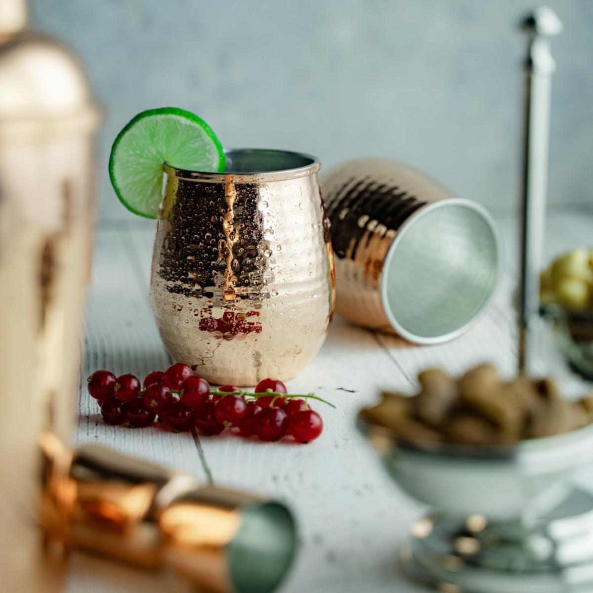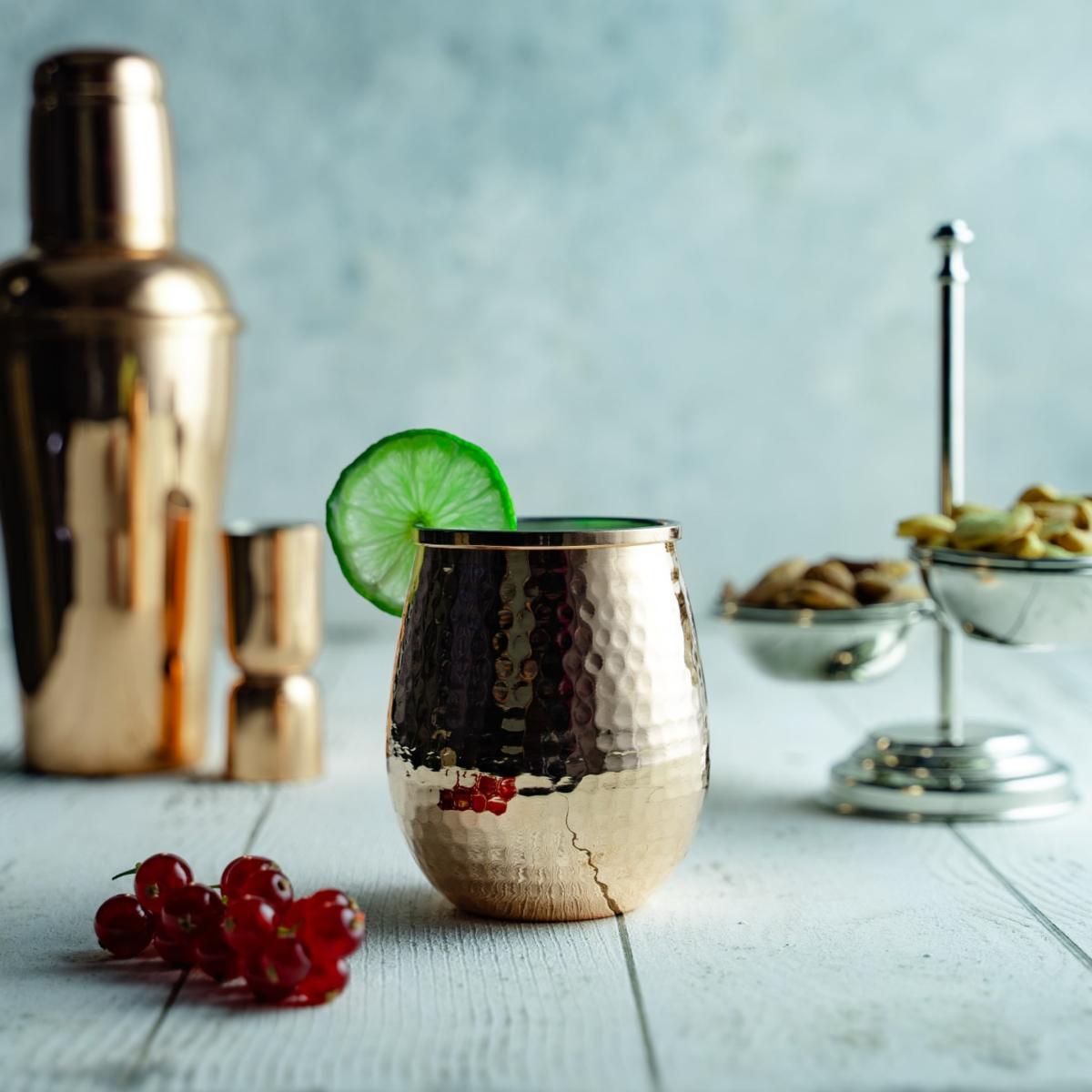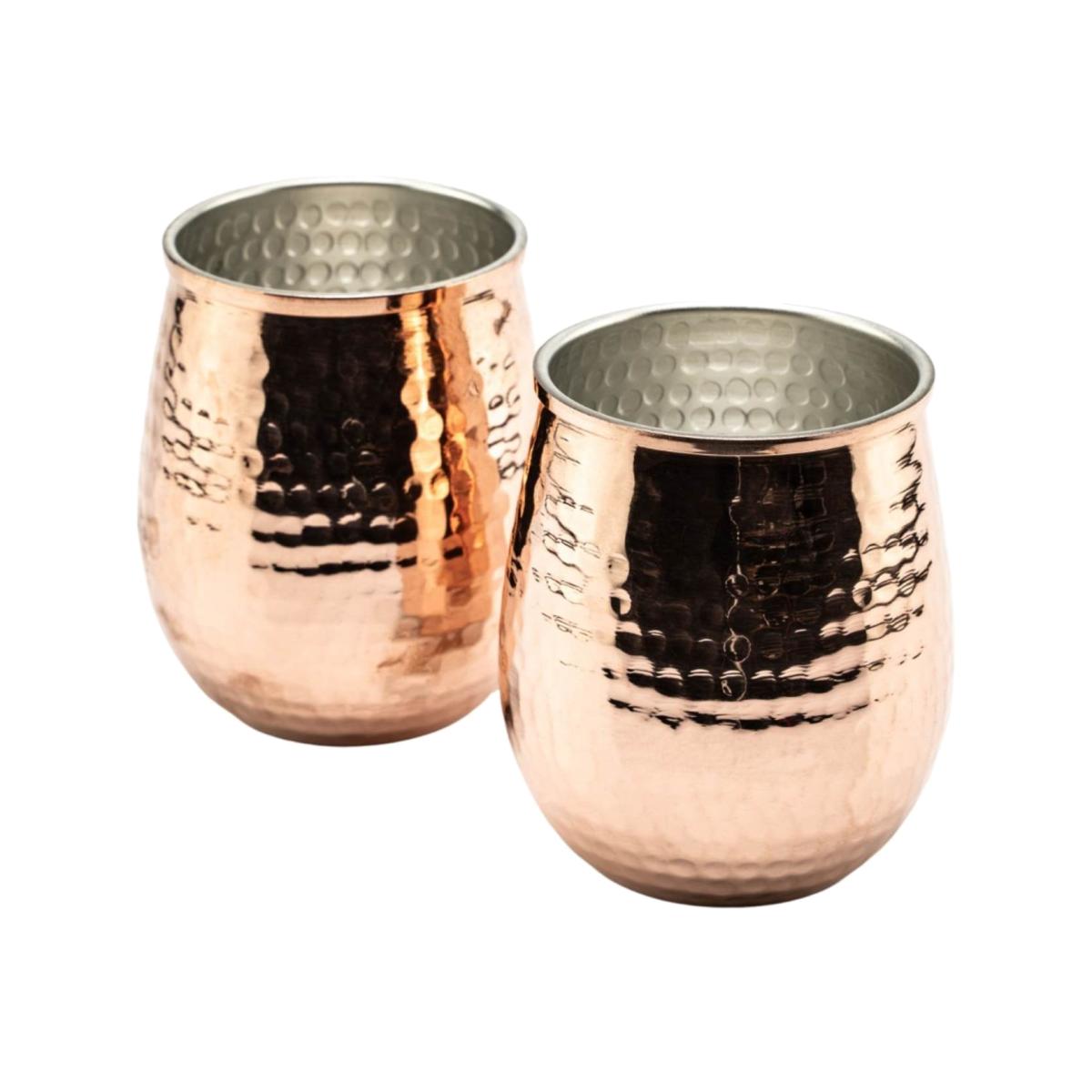 Elevate your drinkware collection with this set of 2 hammered copper tumblers. Perfect for serving chilled beverages, these tumblers combine rustic charm with modern sophistication. The hammered texture enhances their visual appeal, while the shiny copper finish reflects a warm, artisanal glow. Their rounded design fits comfortably in hand, making them ideal for cocktails, mocktails, or refreshing water. A touch of timeless elegance for your bar or dining table.